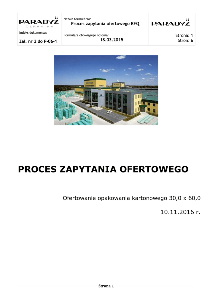 Nazwa formularza: Proces zapytania ofertowego RFQ Indeks dokumentu: Zał. nr 2 do P-06-1 Formularz obowiązuje od dnia: 18.03.2015 Strona: 1 Stron: 6 PROCES ZAPYTANIA OFERTOWEGO Ofertowanie opakowania kartonowego 30,0 x 60,0 10.11.2016 r. Strona 1 Nazwa formularza: Proces zapytania ofertowego RFQ Indeks dokumentu: Zał. nr 2 do P-06-1 Formularz obowiązuje od dnia: 18.03.2015 Strona: 2 Stron: 6 Spis Treści SPIS TREŚCI .................................................................................................................................. 2 1. 2. ZAPYTANIE OFERTOWE ................................................................................................ 3 1.1. Wstęp ........................................................................................................................ 3 1.2. Zarys procesu ofertowania....................................................................................... 3 1.3. Warunki ofertowania ............................................................................................... 3 1.4. Oferta i proces selekcji ............................................................................................. 4 1.5. Osoby kontaktowe .................................................................................................... 5 DANE INFORMACYJNE ................................................................................................... 5 Strona 2 Nazwa formularza: Proces zapytania ofertowego RFQ Indeks dokumentu: Formularz obowiązuje od dnia: Zał. nr 2 do P-06-1 18.03.2015 Strona: 3 Stron: 6 1. Zapytanie ofertowe 1.1. Wstęp Marka Paradyż to ponad 25 lata doświadczenia w tworzeniu pięknych produktów o niepowtarzalnym wzornictwie i najwyższej jakości wykonania. Jesteśmy firmą z polskim kapitałem, w której powstają produkty znajdujące uznanie klientów w Polsce i prawie 40 krajach świata. Na nasz sukces składa się wizja i odważne plany realizowane przez ponad 1700 pracowników zatrudnionych w dwóch przedsiębiorstwach tworzących Grupę Paradyż - Ceramika Paradyż Sp. z o.o. i Paradyż Sp. z o.o. Tworząc nasze produkty kierujemy się pasją i konsekwencją, która przejawia się zarówno w odniesieniu do procesów produkcyjnych, jak i wzornictwa. Jest to nasza droga do kreowania dobrze postrzeganej marki o rosnącej wartości rynkowej. Kolekcje ze znakiem Paradyża od lat otrzymują najważniejsze nagrody i wyróżnienia branżowe m.in. tytuły „Wielkiej Perły Ceramiki UE", "Perłę Ceramiki Dystrybutorów", "Łazienka - Wybór Roku" czy "Jakość Roku". Jesteśmy doceniani licznymi nagrodami oraz prestiżowymi wyróżnieniami, które są potwierdzeniem dobrze obranej ścieżki rozwoju. Wśród najważniejszych można wymienić nagrodę „Ambasador Polskiej Gospodarki”, „Filar Polskiej Gospodarki” czy bardzo zaszczytną nominację do jednego z najważniejszych, polskich wyróżnień - „Nagrody Prezydenta Rzeczpospolitej Polskiej”. 1.2. Zarys procesu ofertowania Grupa Paradyż nieustannie poszukuje potencjalnych strategicznych dostawców, którzy są w stanie dostarczyć towary i usługi które zapewniają najlepszą podstawę rozwiązań dla naszych klientów. Dlatego też zapytanie ofertowe i proces selekcji ma na celu prowadzić do korzystnej współpracy pomiędzy Grupą Paradyż a dostawcą. 1.3. Warunki ofertowania Zapytanie ofertowe nie jest podstawą do żadnych roszczeń w stosunku do Grupy Paradyż wynikających z podjęcia decyzji i działań w procesie ofertowania przez oferenta. Wydatki poniesione przez oferenta w związku z przygotowaniem i odpowiedzią na zapytanie ofertowe nie są zwracane przez Grupę Paradyż. Strona 3 Nazwa formularza: Proces zapytania ofertowego RFQ Indeks dokumentu: Formularz obowiązuje od dnia: Zał. nr 2 do P-06-1 18.03.2015 Strona: 4 Stron: 6 Odpowiedź potencjalnego dostawcy na zapytanie ofertowe nie zobowiązuje Grupy Paradyż do akceptacji tej odpowiedzi w całości lub jej części. Grupa Paradyż zastrzega sobie prawo do wycofania zapytania ofertowego w dowolnym czasie. Akceptacja odpowiedzi oferenta na zapytanie ofertowe nie powoduje żadnego zobowiązania Grupy Paradyż w stosunku do potencjalnego dostawcy dopóki nie zostanie to oficjalnie ustalone w formie pisemnej między Grupą Paradyż a dostawcą. Wszystkie dokumenty i informacje dostarczone przez Grupę Paradyż w związku z zapytaniem ofertowym pozostają własnością Grupy Paradyż i powinny być traktowane jaka poufne oraz nie powinny być rozpowszechniane osobom trzecim za wyjątkiem gdy konieczne jest to w celu poprawnej odpowiedzi na zapytanie ofertowe. W przypadku udostępniania dokumentów z zapytania ofertowego wymagana jest klauzula poufności, która może być przygotowana po uzgodnieniu z Grupą Paradyż. Zapytanie ofertowe przygotowane przez Grupę Paradyż ani żadna odpowiedź do niniejszego dokumentu nie może być publikowana dopóki nie zostanie udzielone stosowne zezwolenie przez Grupę Paradyż. Wszystkie działania i zdarzenia podejmowane przed ogłoszeniem zapytania ofertowego nie będą rozpatrywane przy podejmowaniu decyzji dotyczącej wyboru najlepszego dostawcy. Wszystkie dokumenty związane z odpowiedzią na zapytanie ofertowe należy przygotować w języku polskim. Oferty lub propozycje na zapytanie ofertowe powinny być ważne do akceptacji w dowolnym czasie do trzech miesięcy licząc od daty przesłania oferty lub propozycji. 1.4. Oferta i proces selekcji Proces ofertowania dla wyboru dostawcy/ów na sprzedaż z dostawą opakowań kartonowych o określonej budowie zgodnie ze specyfikacją, składa się z następujących etapów: 1. 2. 3. 4. Przesłanie dokumentacji przetargowej do wstępnych potencjalnych dostawców: do 10.11.2016 r. Otrzymanie oferty od wstępnych potencjalnych dostawców: do 16.11.2016 r. do godziny 14:00 Analiza ofert od wstępnych potencjalnych dostawców: do 18.11.2016 r. Ewentualne indywidualne spotkania z wybranymi oferentami: