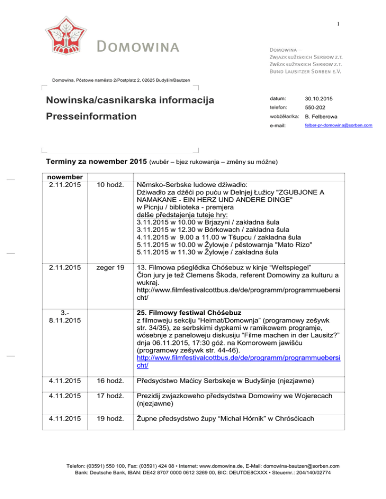 1 Ludowe nakładnistwo Domowina Domowina, Póstowe naměsto 2/Postplatz 2, 02625 Budyšin/Bautzen Nowinska/casnikarska informacija Presseinformation datum: 30.10.2015 telefon: 550-202 wobźěłar/ka: B. Felberowa e-mail: [email protected] Terminy za nowember 2015 (wuběr – bjez rukowanja – změny su móžne) nowember 2.11.2015 10 hodź. Němsko-Serbske ludowe dźiwadło: Dźiwadło za dźěći po puću w Delnjej Łužicy "ZGUBJONE A NAMAKANE - EIN HERZ UND ANDERE DINGE" w Picnju / biblioteka - premjera dalše předstajenja tuteje hry: 3.11.2015 w 10.00 w Brjazyni / zakładna šula 3.11.2015 w 12.30 w Bórkowach / zakładna šula 4.11.2015 w 9.00 a 11.00 w Tšupcu / zakładna šula 5.11.2015 w 10.00 w Žylowje / pěstowarnja "Mato Rizo" 5.11.2015 w 11.30 w Žylowje / zakładna šula 2.11.2015 zeger 19 13. Filmowa pśeglědka Chóśebuz w kinje “Weltspiegel” Čłon jury je tež Clemens Škoda, referent Domowiny za kulturu a wukraj. http://www.filmfestivalcottbus.de/de/programm/programmuebersi cht/ 25. Filmowy festiwal Chóśebuz z filmoweju sekciju “Heimat/Domownja” (programowy zešywk str. 34/35), ze serbskimi dypkami w ramikowem programje, wósebnje z paneloweju diskusiju “Filme machen in der Lausitz?” dnja 06.11.2015, 17:30 góź. na Komorowem jawišću (programowy zešywk str. 44-46). http://www.filmfestivalcottbus.de/de/programm/programmuebersi cht/ 3.8.11.2015 4.11.2015 16 hodź. Předsydstwo Maćicy Serbskeje w Budyšinje (njezjawne) 4.11.2015 17 hodź. Prezidij zwjazkoweho předsydstwa Domowiny we Wojerecach (njezjawne) 4.11.2015 19 hodź. Župne předsydstwo župy “Michał Hórnik” w Chrósćicach Telefon: (03591) 550 100, Fax: (03591) 424 08 • Internet: www.domowina.de, E-Mail: [email protected] Bank: Deutsche Bank, IBAN: DE42 8707 0000 0612 3269 00, BIC: DEUTDE8CXXX • Steuernr.: 204/140/02774 2 5.11. – 18.12.2015 Wustajeńca tworjaceho wuměłstwa Wot 05.11.15 do 18.12.2015 je wustajeńca w zhromadnosći Zwjazka serbskich wuměłcow a Ludoweje banki eG w Ludowej bance eG w Budyšinje na Hošic hasy 25. Wustajeja so twórby wot Iris Brankačkoweje, Isy Bryccyneje, Maje Nageloweje, Sophie Natuškec, Marion Quicojc a Borbory Wiesnerec. 6.11.2015 17 góź. Karl Vouk źaržy w Serbskem muzeju w Chóśebuzu (Młyńska droga 12) pśednosk wó słowjeńskem wuměłstwje w Kórutańskej Zarjadowanje budźe w němskej rěči; zastup: 2,50 € www.wendisches-museum.de, [email protected] 6.11.2015 17 hodź. Armida, zhromadny program Serbskeho ludoweho ansambla z požadarjemi azyla Budyskeho wokrjesa w Kulturnej fabrice we Wojerecach 6.11.2015 18 hodź. Přednošk Achima Miča wo swojich pućowanjach a dožiwjenjach w Americe w Rachlowskej korčmje “Häuslerschenke”; přeproša Domowinska skupina Komorow/Trupin/Rakecy 6.11.2015 19.30 hodź. 6.11.2015 19 hodź. „Bubak, Hajak und Kamurke – Der Einfluss des Wendischen auf die deutsche Umgangssprache“, přednošk dr. Susanny Hozyneje w Starym konsumje w Terpjem zastup: 4,50 €, zarj.: Šula za delnjoserbsku rěč a kulturu Choćebuz 7.11.2015 14 hodź. DGB namołwja zhromadnje ze zwjazkom Budyšin wostanje pisany k zetkanju a slědowacej demonstraciji přećiwo prawicarjam. Zetkanišćo je při Rathenauskim naměsće při Budyskim dwórnišću. Mjez rěčnikami budźe předsyda Domowiny Dawid Statnik. aktualne informacije: https://www.facebook.com/events/868726523241342/ 7.11.2015 20.00 hodź. "Nic so smjeć!" – předstajenje Němsko-Serbskeho ludoweho dźiwadła we Worklecach na žurli dalše předstajenja tuteje hry: 7.11.2015 w 20.00 w Radebeulu 8.11.2015 w 16.00 w Chrósćicach na Krawčikec žurli 14.11.2015 w 19.30 w Ćisku / hosćenć 15.11.2015 w 16.00 w Dźiwadle na hrodźe 22.11.2015 w 16.00 w Haslowje / Bizoldec hosćenc 27.11.2015 w 19.30 w Njebjelčicach / Bjesada - Serbska kultura w Drježdźanach Za wulkich: "Nic so smjeć!" Je mjeztym z dobrej tradiciju, zo poskića Němsko-Serbske ludowe dźiwadło serbske předstajenje w Drježdźanach. Z kruchom "Nic so smjeć!" přeprošuja sobotu, 7.11.2015 w 20 hodź. do Radebeula, Landesbühne Sachsen (Mišnjanska/Meißner Straße 152). Předstajenje poskića so ze simultanym přełožowanjom do němčiny. 3 8.11.2015 15.30 hodź. 8.11.2015 16 hodź. "Čmjeła Hana namaka přećela" - 8.11.2015 w 16.00 hodź. w Chrósćicach w Krawčikec hosćencu jako "Dźiwadłowa pěstowarnja" k inscenaciji "Nic so smjeć!", tohorunja dnja 15.11.2015 w 16.00 hodź. w Budyskim Dźiwadle na hrodźe jako "Dźiwadłowa pěstowarnja" k inscenaciji "Nic so smjeć" 10.11.2015 9 hodź. Předsydstwo Zwjazka za serbski kulturny turizm w Slepom (njezjawne) 10.11.2015 17.00 góź. “Serbske koło Drjowk” − zmakanje zajmcow k serbskim temam w měsće Drjowk 11.11.2015 16:00 hodź. Měrćinaspěwanje po Nowym měsće w Drježdźanach (start při Stupdalnicy, Veilchenweg 38) 11.11.2015 19 hodź. “Serbske fotografiske portreje/Die frühe sorbische Bildnisfotografie als Erinnerungskultur”, přednošk dr. Marje Měrćinoweje w Złym Komorowje/Byrgarski dom Serbska cyrkej, Baderstr. 10 zastup: 4,50 €, zarj.: Šula za delnjoserbsku rěč a kulturu Choćebuz 12.11.2015 14 hodź. Župne předsydstwo Budyšin w Budyšinje 12.11.2015 16 hodź. “Domizna – identita – wěra”, zhromadne zarjadowanje Zwjazkoweho ministerstwa za nutřkowne naležnosće (BMI) ze zastupjerjemi wusydlencow, narodnych mjeńšinow, němskich mjeńšinow w Europje a dalšich w BMI w Berlinje; mjez druhim wobdźěli so předsyda Domowiny Dawid Statnik; jedyn z moderatorow budźe Danko Handrik 12.11.2015 16.30 góź. 12.11.2015 16 góź. Župne pśedsedarstwo župy Dolna Łužyca w klubowni Serbskego doma w Chóśebuzu 154. Serbske blido w Barlinju Pśiduce Serbske blido buźo stwórtk, 12.11.2015, zeger 16:00 goźin zasej w gosćeńcu EINSTEIN KAFFEE, Friedrichowa droga 206, 10969 Barliń, rožk Zimmerowa droga. Kabinetna wustajeńca w Serbskem muzeju w Chóśebuzu (Młyńska droga 12) z twórbami m