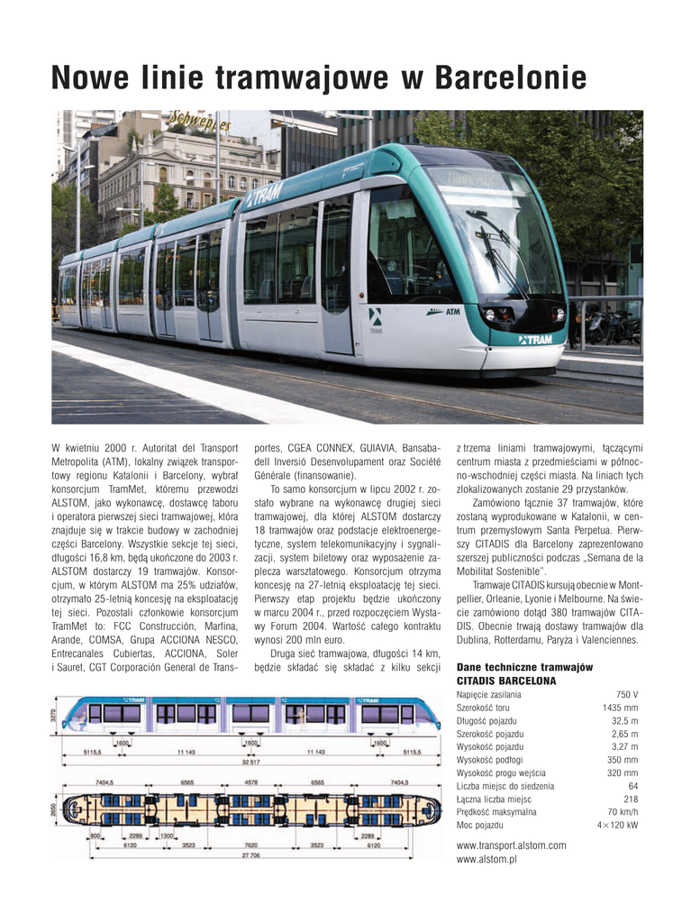 Nowe linie tramwajowe w Barcelonie W kwietniu 2000 r. Autoritat del Transport Metropolita (ATM), lokalny związek transportowy regionu Katalonii i Barcelony, wybrał konsorcjum TramMet, któremu przewodzi ALSTOM, jako wykonawcę, dostawcę taboru i operatora pierwszej sieci tramwajowej, która znajduje się w trakcie budowy w zachodniej części Barcelony. Wszystkie sekcje tej sieci, długości 16,8 km, będą ukończone do 2003 r. ALSTOM dostarczy 19 tramwajów. Konsorcjum, w którym ALSTOM ma 25% udziałów, otrzymało 25-letnią koncesję na eksploatację tej sieci. Pozostali członkowie konsorcjum TramMet to: FCC Construcción, Marfina, Arande, COMSA, Grupa ACCIONA NESCO, Entrecanales Cubiertas, ACCIONA, Soler i Sauret, CGT Corporación General de Trans- portes, CGEA CONNEX, GUIAVIA, Bansabadell Inversió Desenvolupament oraz Société Générale (finansowanie). To samo konsorcjum w lipcu 2002 r. zostało wybrane na wykonawcę drugiej sieci tramwajowej, dla której ALSTOM dostarczy 18 tramwajów oraz podstacje elektroenergetyczne, system telekomunikacyjny i sygnalizacji, system biletowy oraz wyposażenie zaplecza warsztatowego. Konsorcjum otrzyma koncesję na 27-letnią eksploatację tej sieci. Pierwszy etap projektu będzie ukończony w marcu 2004 r., przed rozpoczęciem Wystawy Forum 2004. Wartość całego kontraktu wynosi 200 mln euro. Druga sieć tramwajowa, długości 14 km, będzie składać się składać z kilku sekcji z trzema liniami tramwajowymi, łączącymi centrum miasta z przedmieściami w północno-wschodniej części miasta. Na liniach tych zlokalizowanych zostanie 29 przystanków. Zamówiono łącznie 37 tramwajów, które zostaną wyprodukowane w Katalonii, w centrum przemysłowym Santa Perpetua. Pierwszy CITADIS dla Barcelony zaprezentowano szerszej publiczności podczas „Semana de la Mobilitat Sostenible”. Tramwaje CITADIS kursują obecnie w Montpellier, Orleanie, Lyonie i Melbourne. Na świecie zamówiono dotąd 380 tramwajów CITADIS. Obecnie trwają dostawy tramwajów dla Dublina, Rotterdamu, Paryża i Valenciennes. Dane techniczne tramwajów CITADIS BARCELONA Napięcie zasilania Szerokość toru Długość pojazdu Szerokość pojazdu Wysokość pojazdu Wysokość podłogi Wysokość progu wejścia Liczba miejsc do siedzenia Łączna liczba miejsc Prędkość maksymalna Moc pojazdu www.transport.alstom.com www.alstom.pl 750 V 1435 mm 32,5 m 2,65 m 3,27 m 350 mm 320 mm 64 218 70 km/h 4×120 kW