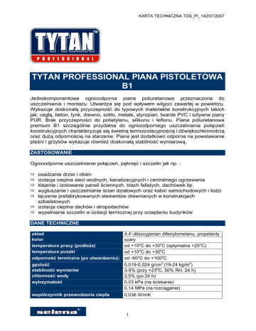 KARTA TECHNICZNA TDS_PI_142/07/2007 TYTAN PROFESSIONAL PIANA PISTOLETOWA B1 Jednokomponentowa ognioodporna piana poliuretanowa przeznaczona do uszczelniania i montażu. Utwardza się pod wpływem wilgoci zawartej w powietrzu. Wykazuje doskonałą przyczepność do typowych materiał†w konstrukcyjnych takich jak: cegłą, beton, tynk, drewno, szkło, metale, styropian, twarde PVC i sztywne piany PUR. Brak przyczepności do polietylenu, silikonu i teflonu. Piana poliuretanowa premium B1 szczeg†lnie przydatna do ognioodpornego uszczelniania połączeń konstrukcyjnych charakteryzuje się świetną termoizolacyjnością i dźwiękochłonnością oraz dużą odpornością na starzenie. Piana jest dodatkowo odporna na powstawanie pleśni i grzyb†w wykazuje r†wnież doskonałą stabilność wymiarową. ZASTOSOWANIE Ognioodporne uszczelnianie połączeń, pęknięć i szczelin jak np. : osadzanie drzwi i okien izolacja cieplna sieci wodnych, kanalizacyjnych i centralnego ogrzewania klejenie i izolowanie paneli ściennych, blach falistych, dach†wek itp. wygłuszanie i uszczelnianie ścian działowych oraz kabin samochodowych i łodzi łączenie prefabrykowanych element†w drewnianych w konstrukcjach szkieletowych izolacja cieplna dach†w i stropodach†w wypełnianie szczelin w izolacji termicznej przy ocieplaniu budynk†w DANE TECHNICZNE skład kolor temperatura pracy (podłoża) temperatura puszki odporność termiczna (po utwardzeniu): 4,4’-diizocyjanian difenylometanu, propelanty szary od +10oC do +30oC (optymalna +20oC) od +10oC do +30oC od -60oC do +100oC gęstość stabilność wymiar…w chłonność wody wytrzymałość 0,019-0,024 g/cm3 (19-24 kg/m3) 3-5% (przy +23oC, 50% RH, 24 h) 2,5% (po 24 h) 0,03 kPa (na ściskanie) 0,14 MPa (na rozciąganie) wsp…łczynnik przewodzenia ciepła 0,036 W/mK 1 KARTA TECHNICZNA TDS_PI_142/07/2007 klasa ognioodporności wg normy PN-EN 13501-2:2004 klasa palności wg normy DIN 4102 rozpuszczalniki (przed utwardzeniem) czas tworzenia nask…rka czas obr…bki wstępnej czas pełnego utwardzenia wydajność EI 30 - EI 120 B1 aceton 6-9 min (+23oC/RH 50%) 25-35 min (+23oC/RH 50%) 24 h 35-42 dm3 (+23oC/RH 50%) Piana spełnia wymagania normy DIN 4102 przy szczelinie 30 mm szerokości i 100 mm głębokości. SPOS†B UŻYCIA Podłoże robocze oczyścić i odtłuścić Osadzenie drzwi i okien nie może odbywać się bez użycia łącznik†w mechanicznych Zaleca się puszkę z pianą doprowadzić do temperatury pokojowej (np. przez zanurzenie w ciepłej wodzie). Uwaga: nie podgrzewać! Mocno wstrząsnąć puszką (ok. 30 s) w celu dokładnego wymieszania składnik†w Przykręcić pistolet do puszki Zwilżyć powierzchnie robocze wodą (przy pomocy np. spryskiwacza ogrodniczego) Pozycją roboczą jest pozycja „do g†ry dnem” Pianą wypełniać szczeliny do 30-70% głębokości w zależności od temperatury Wielkość strumienia regulować siłą nacisku na spust pistoletu Jeśli pracę przerywa się na dłużej niż 15 minut należy dyszę pistoletu wyczyścić czyścikiem do pian poliuretanowych W niższych temperaturach zaleca się pozostawienie nałożonej piany do czasu pełnego utwardzenia (zbyt wczesne pr†by ugniatania bądź wstępnej obr†bki powodują nieodwracalne zmiany w strukturze piany, wpływające na pogorszenie jej parametr†w użytkowych) Nadmiar piany po utwardzeniu usunąć metodami mechanicznymi (np. nożem) Po pełnym utwardzeniu piany należy zabezpieczyć ją przed działaniem promieni UV używając do tego np.: mas silikonowych, tynku, farb ZGODNOŚĆ Z NORMAMI I WYMAGANIAMI JAKOŚCIOWYMI Produkt posiada zatwierdzenie Państwowego Zakładu Higieny w Warszawie: Atest PZH Nr HK/B/1421/01/2008 Aprobata Techniczna Instytutu Techniki Budowlanej Nr: AT-15-7834/2008 Wytwarzanie produktu odbywa się w systemie jakości potwierdzonym przez CERTYFIKAT ISO 9001 Certyfikat o klasie ognioodporności 2 KARTA TECHNICZNA TDS_PI_142/07/2007 PRZECHOWYWANIE I OPAKOWANIE Termin ważności wynosi 18 miesięcy od daty produkcji. Produkt przechowywać w suchym i chłodnym miejscu, w oryginalnie zapakowanych pojemnikach. Temperatura przechowywania: od +5oC do +30oC. Nie jest dozwolone przechowywanie pojemnik†w z pianą w temp. powyżej +40oC i w pobliżu otwartego ognia. Puszki przechowywać w pozycji pionowej. Produkt pakowany jest wg poniższej tabelki: objętość puszki 1000 ml ilość piany w puszce 750 ml ilość puszek w kartonie waga 1 szt./ 1 kartonu 12 szt. 0,91 kg / 11,5 kg UWAGI I ZALECENIA BHP Szkodliwa dla zdrowia przy wdychaniu Zaleca się używanie ubrania roboczego, okular†w i rękawic ochronnych W czasie stosowania odpowiednio wietrzyć pomieszczenie, w razie potrzeby stosować aparaty do ochrony dr†g oddechowych Unikać kontaktu piany ze sk†rą, w razie dostania się piany do oczu należy je natychmiast przemyć wodą i skonsultować się z lekarzem Nie stosować piany w pobliżu otwartego ognia i nie palić tytoniu podczas pracy Pojemnik znajduje się pod ciśnieniem Puszki nie wolno zgniatać, ani przebijać nawet po całkowitym opr†żnieniu Nie przechowywać w temperaturze większej niż +50oC Nie podgrzewać puszki z pianą w słońcu, za pomocą otwartego ognia, grzejnik†w, palnik†w i innych sztucznych źr†deł grzewczych Przechowywać w miejscach niedostępnych dla dzieci Transport może odbywać się droga lądową Aktualizacja: 03.03.2009 Powyższe dane, zalecenia i wskaz†wki opierają się na naszej najlepszej wiedzy, badaniach oraz doświadczeniach i zostały udzielone w dobrej wierze zgodnie z zasadami obowiązującymi w naszej firmie i u naszych dostawc†w. Zaproponowane sposoby postępowania uznane są za powszechne, jednak każdy z użytkownik†w tego materiału powinien upewnić się na wszelkie możliwe sposoby, włącznie ze sprawdzeniem produktu końcowego w odpowiednich warunkach, o przydatności dostarczanych materiał†w dla osiągnięcia cel†w przez niego zamierzonych. Ani