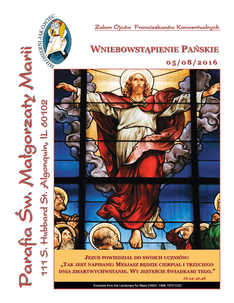 WNIEBOWSTĄPIENIE PAŃSKIE 05/08/2016 111 S. Hubbard St. Algonquin, lL 60102 Parafia Św. Małgorzaty Marii Zakon Ojców Franciszkanów Konwentualnych JEZUS POWIEDZIAŁ DO SWOICH UCZNIÓW: „TAK JEST NAPISANE: MESJASZ BĘDZIE CIERPIAŁ I TRZECIEGO DNIA ZMARTWYCHWSTANIE. WY JESTEŚCIE ŚWIADKAMI TEGO.” Łk 24: 46,48 OD PROBOSZCZA ZOSTAŁ UNIESIONY DO NIEBA (Łk 24, 51). Komentarz naukowy „Wniebowstąpienie na zawsze pozostaje tajemnicą, ponieważ wydarzenia tego nie da się opisać słowami, ale coś takiego się stało. Trudno byłoby sobie wyobrazić, aby objawienia się zmartwychwstałego Jezusa stawały się coraz rzadsze, a w końcu zupełnie ustały. To mogłoby zachwiać wiarę ludzi. Musiał więc nadejść decydujący dzień, gdy Jezus tej ziemi w końcu stał się Jezus powiedział do swoich uczniów: Chrystusem niebios. Dla uczniów wniebowstąpienie miało «Tak jest napisane: Mesjasz będzie cierpiał i trzeciego trojakie znaczenie. dnia zmartwychwstanie; w imię Jego głoszone będzie 1. Było ono zakończeniem. Czas wiary w cielesną obecność nawrócenie i odpuszczenie grzechów wszystkim Jezusa, wiary zależnej od Jego ciała i krwi, minął bezpowrotnie. narodom, począwszy od Jeruzalem. Wy jesteście Teraz byli oni związani z kimś, kto na zawsze nie był świadkami tego. ograniczony przestrzenią i czasem. Oto Ja ześlę na was obietnicę mojego Ojca. Wy zaś 2. Było ono początkiem. Uczniowie nie odeszli z tego miejsca pozostańcie w mieście, aż będziecie przyobleczeni załamani, lecz byli pełni radości, posiadali bowiem Pana, od w moc z wysoka». którego nikt i nic nie było w stanie ich oddzielić. Potem wyprowadził ich ku Betanii i podniósłszy ręce, Albowiem jestem tego pewien – powiada Paweł – że nic, nic błogosławił ich. A kiedy ich błogosławił, rozstał się w życiu ani w śmierci, nie zdoła nas odłączyć od miłości Bożej z nimi i został uniesiony do nieba. w Chrystusie Jezusie, naszym Panu (Rz 8, 38-39). Oni zaś oddali Mu pokłon i z wielką radością wrócili do 3. I w końcu wniebowstąpienie upewniło uczniów w tym, że Jeruzalem, gdzie stale przebywali w świątyni, wielbiąc mają przyjaciela nie tylko na ziemi, ale i w niebie. Jakże i błogosławiąc Boga. wspaniałą rzeczą jest wiedzieć, że w niebie oczekuje na nas ten sam Jezus, którego poznajemy z kart Pisma Świętego. Umierając, nie przechodzimy do ciemności, lecz idziemy do Niego. Słowa Ewangelii wg św. Łukasza Łk 24, 46-53 A więc wrócili do Jerozolimy i nadal uwielbiali Boga w świątyni. Nieprzypadkowo Ewangelia Łukasza kończy się tam, gdzie się zaczyna – w świątyni” (W. Barclay, Ewangelia św. Łukasza, Poznań 2002, s. 197–198). NIECH BOŻE MIŁOSIERDZIE PROWADZI NAS Przed dwoma tygodniami ogłaszaliśmy diecezjalną kolektę W tym roku Diecezja zobowiązała nas do zebrania $133,183. Jest to nasza część wspólnej odpowiedzialności. Do parafian, którzy są zarejestrowani w parafii i w przebiegu ostatnich 15 lat wsparli kolektę, Diecezja wysłała koperty, w których każda rodzina może napisać ile się zobowiązuje ofiarować i w jaki sposób będzie spłacać swoje zobowiązanie. Tych z was, którzy nie są zarejestrowani, albo z jakichś innych powodów nie dostali koperty pocztą, proszę aby zabrali ze sobą te koperty z kościoła i złożyli ofiarę na ten cel I przynieśli kopertę do kościoła w nadchodzące weekendy. Aktualnie w naszej parafii jest zarejestrowanych 3,400 rodzin, z których tylko 900 regularnie wspiera nas finansowo. Opierając się na tych statystykach, jeśli każda rodzina zobowiąże się i wpłaci na diecezjalną kolektę 150 dolarów jednorazowo, lub w spłatach, wtedy wyzbieramy wyznaczoną nam sumę. Gdyby była jakaś nadwyżka, wtedy te pieniądze zostają w parafii i będziemy je mogli użyć na projekty w parafii. Działa to też w drugą stronę. Brakującą część tej sumy, którą nie uda się nam zebrać od parafian , będziemy musieli zapłacić z kasy parafialnej. Jak zawsze dziękuję Wam za waszą szczodrość . Proszę również pamiętać, że żadna ofiara nie jest, ani zbyt duża, ani zbyt mała. Proszę abyście ofiarowali na ten cel tyle, ile każda rodzina może ofiarować. Niech Czas wielkanocny, który przeżywamy pomoże nam pogłębiać naszą wiarę oraz jedność z Parafią, Diecezją i całym Kościołem. Pokój i Dobro Fr. Piotr Sarnicki, OFM, Conv. CZYTANIE Z DZIEJÓW APOSTOLSKICH DZ 1, 1-11 CZYTANIE Z LISTU DO HEBRAJCZYKÓW HBR 9, 24-28; 10, 19-23 Pierwszą Księgę napisałem, Teofilu, o wszystkim, co Jezus czynił i czego nauczał od początku aż do dnia, w którym dał polecenia apostołom, których sobie wybrał przez Ducha Świętego, a potem został wzięty do nieba. Im też po swojej męce dał wiele dowodów, że żyje: ukazywał się im przez czterdzieści dni i mówił o królestwie Bożym. Chrystus wszedł nie do świątyni zbudowanej rękami ludzkimi, będącej odbiciem prawdziwej świątyni, ale do samego nieba, aby teraz wstawiać się za nami przed obliczem Boga, ani nie po to, aby się wielekroć sam miał ofiarować, jak arcykapłan, który co roku wchodzi do świątyni z krwią cudzą, gdyż w takim przypadku musiałby cierpieć wiele razy od stworzenia świata. A tymczasem raz A podczas wspólnego posiłku przykazał im nie odchodzić jeden ukazał się teraz na końcu wieków, aby zgładzić z Jerozolimy, ale oczekiwać obietnicy Ojca: grzech przez ofiarę z samego siebie. «Słyszeliście o niej ode Mnie – mówił – Jan chrzcił wodą, A jak postanowione ludziom raz umrzeć, potem zaś sąd, ale wy wkrótce zostaniecie ochrzczeni Duchem Świętym». tak Chrystus raz jeden był ofiarowany dla zgładzenia grzechów wielu, drugi raz ukaże się nie w związku Zapytywali Go zebrani: «Panie, czy w tym czasie przywrócisz z grzechem, lecz dla zbawienia tych, którzy Go oczekują. królestwo Izraela?» Odpowiedział im: «Nie wasza to rz
