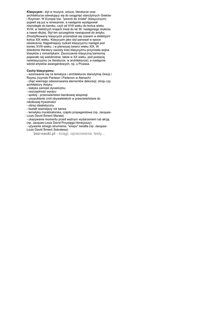 Klasycyzm– styl w muzyce, sztuce, literaturze oraz architekturze odwołujący się do osiągnięć starożytnych Greków i Rzymian. W Europie tzw. "powrót do źródeł" (klasycznych) pojawił się już w renesansie, a następnie występował równolegle do baroku, czyli od XVII wieku do końca wieku XVIII, w niektórych krajach trwał do lat 30. następnego stulecia, a nawet dłużej. Styl ten szczególnie nawiązywał do antyku. Zmodyfikowany klasycyzm przeradzał się czasem w eklektyzm końca XIX wieku. Klasycyzm jako styl panował w epoce oświecenia. Najpełniejszy rozkwit klasycyzmu nastąpił pod koniec XVIII wieku. i w pierwszej ćwierci wieku XIX. W dziedzinie literatury swoisty kres klasycyzmu przyniosła wojna klasyków z romantykami. Zauroczenie klasyczną harmonią pojawiało się wielokrotnie, także w XX wieku, pod postacią neoklasycyzmu (w literaturze, w architekturze), a następnie wśród artystów awangardowych, np. u Picassa. Cechy klasycyzmu: - wzorowanie się na tematyce i architekturze starożytnej Grecji i Rzymu (rzymski Panteon i Partenon w Atenach) - chęć wiernego odwzorowania elementów dekoracji, stroju czy architektury Antyku - statyka zamiast dynamizmu - oszczędność wyrazu - spokój - przeciwieństwo barokowej ekspresji - uwypuklenie cnót obywatelskich w przeciwieństwie do rokokowej frywolności - obraz idealistyczny - kształt ważniejszy niż barwa - tematyka moralizatorska, często propagandowa (np. JacquesLouis David Śmierć Marata) - ukazywanie momentu przed ważnym wydarzeniem lub akcją (np. Jacques-Louis David Przysięga Horacjuszy) - używanie silnego strumienia, "snopu" światła (np. JacquesLouis David Śmierć Sokratesa) bez-nauki.pl - ściągi, opracowania, testy...