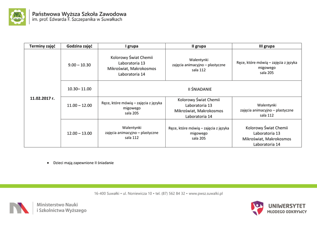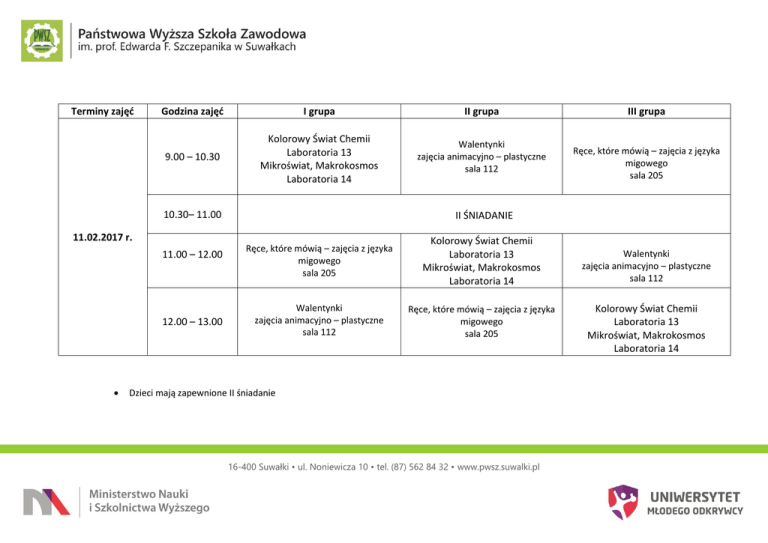 Terminy zajęć Godzina zajęć I grupa II grupa 9.00 – 10.30 Kolorowy Świat Chemii Laboratoria 13 Mikroświat, Makrokosmos Laboratoria 14 Walentynki zajęcia animacyjno – plastyczne sala 112 10.30– 11.00 12.00 – 13.00 Ręce, które mówią – zajęcia z języka migowego sala 205 II ŚNIADANIE 11.02.2017 r. 11.00 – 12.00 III grupa Ręce, które mówią – zajęcia z języka migowego sala 205 Kolorowy Świat Chemii Laboratoria 13 Mikroświat, Makrokosmos Laboratoria 14 Walentynki zajęcia animacyjno – plastyczne sala 112 Ręce, które mówią – zajęcia z języka migowego sala 205 Dzieci mają zapewnione II śniadanie 16-400 Suwałki • ul. Noniewicza 10 • tel. (87) 562 84 32 • www.pwsz.suwalki.pl Walentynki zajęcia animacyjno – plastyczne sala 112 Kolorowy Świat Chemii Laboratoria 13 Mikroświat, Makrokosmos Laboratoria 14