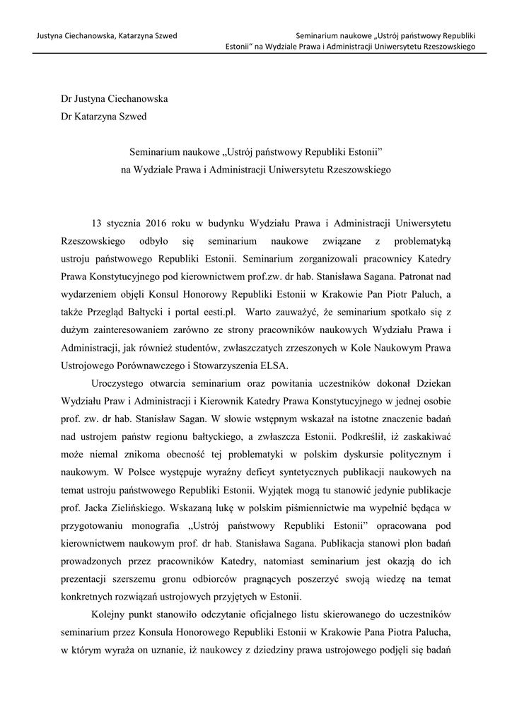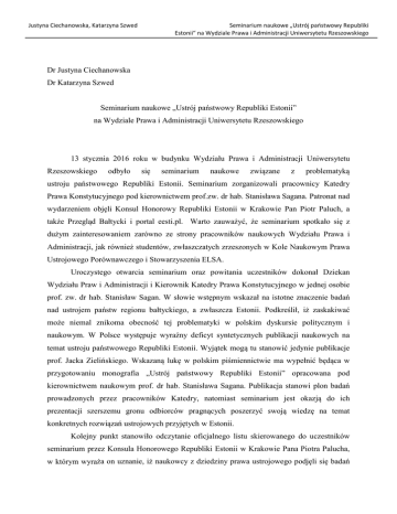 Justyna Ciechanowska, Katarzyna Szwed Seminarium naukowe „Ustrój państwowy Republiki Estonii“ na Wydziale Prawa i Administracji Uniwersytetu Rzeszowskiego Dr Justyna Ciechanowska Dr Katarzyna Szwed Seminarium naukowe „Ustrój państwowy Republiki Estonii” na Wydziale Prawa i Administracji Uniwersytetu Rzeszowskiego 13 stycznia 2016 roku w budynku Wydziału Prawa i Administracji Uniwersytetu Rzeszowskiego odbyło się seminarium naukowe związane z problematyką ustroju państwowego Republiki Estonii. Seminarium zorganizowali pracownicy Katedry Prawa Konstytucyjnego pod kierownictwem prof.zw. dr hab. Stanisława Sagana. Patronat nad wydarzeniem objęli Konsul Honorowy Republiki Estonii w Krakowie Pan Piotr Paluch, a także Przegląd Bałtycki i portal eesti.pl. Warto zauważyć, że seminarium spotkało się z dużym zainteresowaniem zarówno ze strony pracowników naukowych Wydziału Prawa i Administracji, jak również studentów, zwłaszczatych zrzeszonych w Kole Naukowym Prawa Ustrojowego Porównawczego i Stowarzyszenia ELSA. Uroczystego otwarcia seminarium oraz powitania uczestników dokonał Dziekan Wydziału Praw i Administracji i Kierownik Katedry Prawa Konstytucyjnego w jednej osobie prof. zw. dr hab. Stanisław Sagan. W słowie wstępnym wskazał na istotne znaczenie badań nad ustrojem państw regionu bałtyckiego, a zwłaszcza Estonii. Podkreślił, iż zaskakiwać może niemal znikoma obecność tej problematyki w polskim dyskursie politycznym i naukowym. W Polsce występuje wyraźny deficyt syntetycznych publikacji naukowych na temat ustroju państwowego Republiki Estonii. Wyjątek mogą tu stanowić jedynie publikacje prof. Jacka Zielińskiego. Wskazaną lukę w polskim piśmiennictwie ma wypełnić będąca w przygotowaniu monografia „Ustrój państwowy Republiki Estonii” opracowana pod kierownictwem naukowym prof. dr hab. Stanisława Sagana. Publikacja stanowi plon badań prowadzonych przez pracowników Katedry, natomiast seminarium jest okazją do ich prezentacji szerszemu gronu odbiorców pragnących poszerzyć swoją wiedzę na temat konkretnych rozwiązań ustrojowych przyjętych w Estonii. Kolejny punkt stanowiło odczytanie oficjalnego listu skierowanego do uczestników seminarium przez Konsula Honorowego Republiki Estonii w Krakowie Pana Piotra Palucha, w którym wyraża on uznanie, iż naukowcy z dziedziny prawa ustrojowego podjęli się badań Ius et Administratio 2/2016 Wydział Prawa i Administracji Uniwersytetu Rzeszowskiego nad systemem politycznym Republiki Estonii. Podkreślił on iż w dobie współpracy pomiędzy krajami europejskimi szczególnie cenne są działania służące przybliżeniu systemów politycznych państw członkowskich. Polska powinna znać mechanizmy polityczne państw tworzących wraz z nią Unię, stąd niezwykle ważkie znaczenie mają badania naukowe prowadzone przez pracowników Katedry Prawa Konstytucyjnego, które stanowią okazję do rozpropagowania historii i kultury prawnej Republiki Estonii. Po tym krótkim wprowadzeniu głos zabrali poszczególni prelegenci. W ich gronie znaleźli się członkowie zespołu badawczego zajmującego się tematyką ustrojową państw bałtyckich. Wystąpienie inauguracyjne poświęcone kształtowaniu się świadomości i symboli narodowych w Estonii, a także omówieniu konstytucjonalizmu estońskiego wygłosił prof. Stanisław Sagan. Referat ten miał szczególny walor ponieważ prezentował w sposób holistyczny uwarunkowania i tryb uchwalania konstytucji estońskich, zwracając uwagę na zabiegi rządzących do zachowania ciągłości władzy na przestrzeni omawianego okresu. Kolejną prelegentką była mgr Joanna Bocheńska, która kompetentnie omówiła istotne daneodnoszące się do Estonii, wśród nich uwarunkowania geograficzne, podział terytorialny, strukturę społeczeństwa i politykę ekonomiczną państwa. Dla zobrazowania przedstawianych treści posłużyła się prezentacją multimedialną. Wystąpienie to stanowiło punkt wyjścia dla dalszych rozważań. Następny referat „Jednoizbowość parlamentu Estonii” wygłosiła dr Justyna Ciechanowska. We wstępnej części wystąpienia zaakcentowała fakt, iż Konstytucja Republiki Estońskiej z 28 czerwca 1992 roku ustanowiła parlamentarny system rządów w formie demokracji parlamentarno-gabinetowej. Wskazała na podstawowe zasady ustrojowe Republiki Estonii zawarte w rozdziale I Konstytucji. Podkreśliła, żeprzedstawiając instytucję Parlamentu, decydujące znaczenie odegrała zasada trójpodziału władz, zgodnie z którą poszczególnym organom przypisano realizację szczególnych funkcji państwa: stanowienia prawa, jego wykonania i wymierzania sprawiedliwości. W dalszej części referatu skupiła uwagę na pozycji ustrojowej parlamentu – Riigikogu. Podkreśliiła, że parlamenty silne, to takie, które posiadają monopol władzy ustawodawczej, samodzielnie powołują i odwołują rząd oraz nie są nadmiernie rozczłonkowane. Takie cechy można przypisać parlamentom jednoizbowym. Jednocześnie wskazała , że jeżeli chodzi o parlament w Estonii, to fakt powierzenia mu władzy ustawodawczej oraz uzależnienie od niego funkcjonowania pozostałych konstytucyjnych organów władzy, powoduje, że posiada on dominującą rolę w systemie Justyna Ciechanowska, Katarzyna Szwed Seminarium naukowe „Ustrój państwowy Republiki Estonii“ na Wydziale Prawa i Administracji Uniwersytetu Rzeszowskiego organów państwowych. Estońskie Zgromadzenie Państwowe posiada dużą swobodę i autonomię w decydowaniu o swojej strukturze oraz trybie pracy. Czyni to z niego organ skuteczny i sprzyjający stabilności politycznej. Rozwiązania te zdeterminowały cały system organów państwa. Kontynuując swój wywód dr Justyna Ciechanowska wskazała na wady i zalety przyjęcia jednoizbowego modelu funkcjonowania parlamentu. Dr Katarzyna Szwed poruszyła w swoim wystąpieniu kwestię odpowiedzialności politycznej Rady M