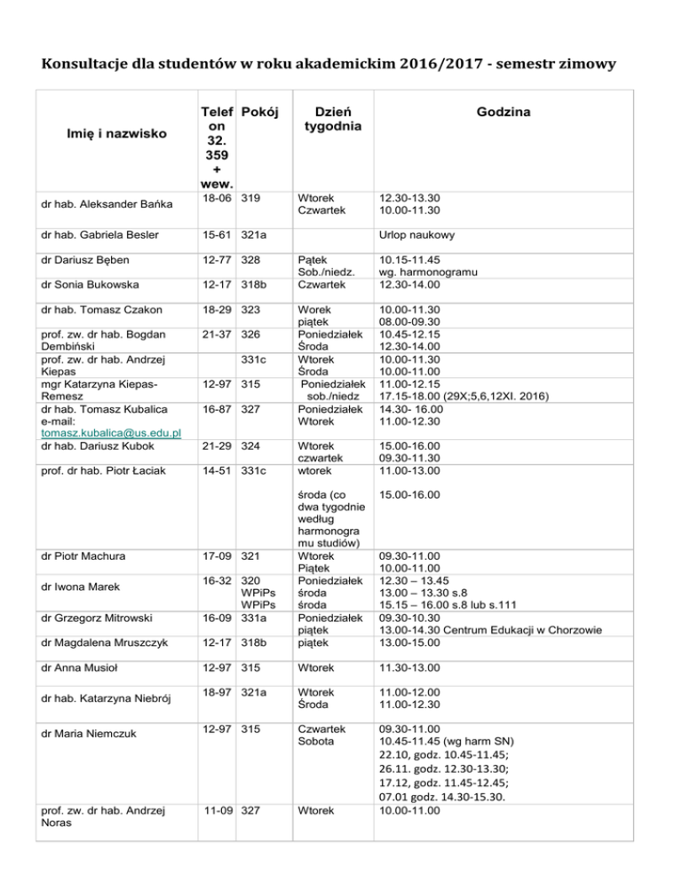 Konsultacje dla studentów w roku akademickim 2016/2017 - semestr zimowy Imię i nazwisko Telef Pokój on 32. 359 + wew. dr hab. Aleksander Bańka 18-06 319 dr hab. Gabriela Besler 15-61 321a dr Dariusz Bęben 12-77 328 dr Sonia Bukowska 12-17 318b dr hab. Tomasz Czakon 18-29 323 prof. zw. dr hab. Bogdan Dembiński prof. zw. dr hab. Andrzej Kiepas mgr Katarzyna KiepasRemesz dr hab. Tomasz Kubalica e-mail: [email protected] dr hab. Dariusz Kubok 21-37 326 prof. dr hab. Piotr Łaciak 14-51 331c 331c 12-97 315 16-87 327 21-29 324 Dzień tygodnia Wtorek Czwartek Godzina 12.30-13.30 10.00-11.30 Urlop naukowy Pątek Sob./niedz. Czwartek 10.15-11.45 wg. harmonogramu 12.30-14.00 Worek piątek Poniedziałek Środa Wtorek Środa Poniedziałek sob./niedz Poniedziałek Wtorek 10.00-11.30 08.00-09.30 10.45-12.15 12.30-14.00 10.00-11.30 10.00-11.00 11.00-12.15 17.15-18.00 (29X;5,6,12XI. 2016) 14.30- 16.00 11.00-12.30 Wtorek czwartek wtorek 15.00-16.00 09.30-11.30 11.00-13.00 15.00-16.00 dr Grzegorz Mitrowski 16-32 320 WPiPs WPiPs 16-09 331a dr Magdalena Mruszczyk 12-17 318b środa (co dwa tygodnie według harmonogra mu studiów) Wtorek Piątek Poniedziałek środa środa Poniedziałek piątek piątek dr Anna Musioł 12-97 315 Wtorek 11.30-13.00 dr hab. Katarzyna Niebrój 18-97 321a Wtorek Środa 11.00-12.00 11.00-12.30 dr Maria Niemczuk 12-97 315 Czwartek Sobota 09.30-11.00 10.45-11.45 (wg harm SN) dr Piotr Machura dr Iwona Marek 17-09 321 09.30-11.00 10.00-11.00 12.30 – 13.45 13.00 – 13.30 s.8 15.15 – 16.00 s.8 lub s.111 09.30-10.30 13.00-14.30 Centrum Edukacji w Chorzowie 13.00-15.00 22.10, godz. 10.45-11.45; 26.11. godz. 12.30-13.30; 17.12, godz. 11.45-12.45; 07.01 godz. 14.30-15.30. prof. zw. dr hab. Andrzej Noras 11-09 327 Wtorek 10.00-11.00 dr Dariusz Olesiński dr hab. Mirosław Piróg 11-83 317 wtorki/środy Wtorki 16.00-17.30 (co 2 tyg. zgodnie z planem II roku Kognitywistyki). W pozostałe tygodnie - środy 9.40-11.00. soboty 15.10 : 14.30-15.30 03.12: 10.00-11.00 07.01: 10.00-11.00 14.01: 12.00-13.00 12.30-14.00 15.30-17.00 Urlop 12-77 328 Wtorek Piątek dr Lech Radzioch 12-97 315 dr hab. Danuta Ślęczek-Czakon mgr Sebastian Śpiewak 18-29 323 Wtorek Piątek Wtorek Czwartek Poniedziałek Czwartek Niedziela dr Elżbieta Struzik 16-09 331a Sobota Piątek 10.00-11.30 12.30-14.00 10.30-12.00 (pokój 2, parter) 10.00-11.30 (pokój 323) 16.15-17.45 08.00-09.30 20.XI.2016: godz. 13:00-14:00 4.XII.2016: godz. 13:30-14:30 18.XII.2016: godz. 14:00-15:00 14.01.2017: godz. 12:00-13:00 15.30-17.00 dr Mariola Sułkowska-Janowska [email protected] l Prof. dr hab. Barbara Szotek 21-54 331b wtorek 12.30 – 14.00 sobota/niedz. wg harmonogramu SN dr hab. Grażyna Szumera 12-17 318b dr hab. Krzysztof Szymanek www.szymanek.org dr hab. Mirosław Tyl 16-32 320 mgr Kamil Wach 16-09 331a Wtorek Czwartek Poniedziałek Wtorek Wtorek Czwartek Wtorek czwartek Poniedziałek Wtorek 12.30-14.00 11.00-12.00 11.30-12.30 08.30-10.00 09.30-11.30 16.00-17.00 11.00-12.30 15.00-16.00 17.00-18.30 11.00-12.00 dr Agnieszka Wesołowska 14-51 331c Czwartek piątek 14.30-16.00 09.30-10.30 dr hab. Krzysztof Wieczorek www.krzysztofwieczorek.pl 16-32 320 Czwartek Piątek Wtorek Czwartek Wtorek Czwartek 17.30-18.30 12.30-14.00 14.00-15.30 co 2 tygodnie, w dniach: 25 X, 15 XI, 29 XI, 13 XII, 10 I, 24 I. 13.00-14.40 co tydzień 12.30-14.00 16.00-17.30 dr Marta Ples-Bęben prof. dr hab. Krzysztof Wieczorek 11-83 317 12-17 318a 12-17 318b 18-06 319 dr hab. Mariusz Wojewoda 17-09 321 dr hab. Hanna Wojtczak 11-83 317 mgr Beata Wolfigiel 12-97 315 Piątki 15.15-16.16 dr Magdalena Wołek 21-54 331b Wtorek Sob./Niedz. 11.00-12.30 16.10: 10-11 22.10: 10-11 19.11: 10.30-11.30 04.12: 10-11 15.01: 12-13 dr Agnieszka Woszczyk 16-09 331a Wtorek Poniedziałek 10.00-11.30 18.00-19.00 dr Magdalena Fres 12-97 315 Poniedziałek 12.30-13.15 Mgr Bartłomiej Kamiński 12-97 315 mgr Ewa Gwiaździńska mgr Magdalena Pawlak 12-97 315 12-97 315 Dr Witold Marzęda 21-54 331b Dr Monika Polaczek Wtorek 16.30-17.30 piątek 15.30-17.00 16.10.2016 godz. 14.30 - 15.30 17.12.2016 godz. 17.30 -18.30 15.01.2016 godz. 12.00 - 13.00 18 październik wtorek 13.30-15.00 20 grudzień wtorek 13.30-15.00 10 styczeń wtorek 13.30-15.00 05.11 (10.10-10.55); 25.11 (10.50-11.30); 11.12 (17.05-17.50); 14.01 (14.50-15.30) 12.30-13.30 12-97 315 mgr Paweł Miąsek 12-97 315 Dr Grażyna Badura 12-97 315 Mgr Paweł Gwiaździński 12-97 315 Piątek Mgr Renata PolończykBociąga 12-97 315 Czwartek Dr hab. Piotr Łaszczyca 17-28 WBiOŚ Wtorek Bankowa 9, p. 217 Dr Andrzej Kędziorski 14.00-15.00 lub Konsultacje ustalane indywidualnie [email protected] 14.00-15.00 (oraz terminy indywidualnie umówione drogą korespondencji elektronicznej) 17-80 WBiOŚ Dr Jacek Francikowski 12-60 Dr hab. Alina Kafel Mgr Agata Bedarek 16-76 Mgr Marta Sawadro 16-76 Bankowa 9, p. 309 WBiOŚ Bankowa 9, p. 319 WBiOŚ Bankowa 9, p. 325 WBiOŚ 319 WBiOŚ 319 Czwartek 13.00-14.00 Czwartek 10.00-12.00 Środa 10.00-12.00