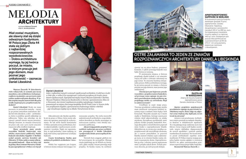 54nieruchomości Melodia APARTAMENTOWIEC SAPPHIRE W BERLINIE W budowanym jeszcze budynku deweloper sprzedał 75 proc. apartamentów. Zostało kilkanaśnie. Najtańszy, dwupokojowy o powierzchni niecałych 40 m2 za 280 tys. euro. Za trzypokojowe mieszkanie musimy zapłacić co najmniej 440 tys. euro. Dostępnych jest jeszcze kilka penthouse’ów o powierzchniach od 90 do 273 m2. Ich cenę poznamy dopiero po rozmowie z deweloperem. ARCHITEKTURY rozmawia Mateusz Żurawik zdjęcia serwisy prasowe Miał zostać muzykiem, ale sławny stał się dzięki odważnym budynkom. W Polsce jego Złota 44 stała się jednym z najbardziej rozpoznawalnych wysokościowców. – Dobra architektura wymaga, by jej twórca poczuł, że miasto, w którym pracuje jest jego domem, musi poznać jego unikatowość – zaznacza Daniel Libeskind. Mateusz Żurawik: W dzieciństwie wiele wskazywało, że zostanie pan raczej muzykiem, a nie architektem. Grał pan początkowo na pianinie, a po pewnym czasie rodzice podarowali panu akordeon. W jakim stopniu muzyka stanowi dziś dla pana źródło inspiracji przy projektowaniu budynków? Daniel Libeskind: Wcale nie mam poczucia, że porzuciłem muzykę – raczej, że po prostu zmieniłem instrument. Kiedyś był nim akordeon, a dziś – architektura, która w podobny sposób oddziałuje na odbiorców. Także ona odwołuje się do emocji i potrafi równie mocno poruszyć. dlatego uważam, że muzyka towarzyszy mi przez cały czas i jest czymś znacznie więcej niż tylko źródłem inspiracji. Sławę przyniosły panu przede wszystkim budynki komercyjne oraz obiekty użyteczności publicznej. Pański budynek mieszkalny Sapphire w Berlinie zyskał uznanie zarówno krytyków jak i klientów. W Polsce póki co mamy tylko jeden pański budynek – Złota 44, który stał się jedną z ikon centrum Warszawy. Chciałby pan zaprojektować w Polsce coś więcej? ostre ZałaMania to jeDen Ze ZnakóW roZPoZnaWcZych architektury DanieLa LibeskinDa Daniel Libeskind Jeden z najbardziej znanych i cenionych współczesnych architektów. Urodził się w Łodzi w 1946 roku, w wieku 11 lat wyemigrował z rodzicami początkowo do Izraela, potem Stanów Zjednoczonych. Zaprojektował między innymi Muzeum Żydowskie w Berlinie, Muzeum Wojskowo-Historyczne Bundeswehry w Dreźnie i apartamentowiec Złota 44 w Warszawie. Jest również współautorem projektu największego z budynków postawionych na miejscu zburzonego kompleksu World Trade Center w Nowym Jorku oraz projektantem Sapphire, apartamentowca budowanego właśnie w Berlinie – jego wizualizacja znajduje się na okładce Nieruchomości de luxe. Zdecydowanie tak. Bardzo spodobała mi się praca w Polsce, która moim zdaniem ma ogromny potencjał do wykorzystania. Po tak wielu latach komunizmu w Polsce potrzeba nowej architektury, która odpowiadałaby współczesnym oczekiwaniom i trendom. Nigdy nie zapomniałem, że stąd pochodzę i mam nadzieję, że będę miał szansę zaprojektować tu kolejny budynek. Często krytykujemy fatalny gust niektórych polskich architektów i inwestorów. Polska bez wątpienia jest krajem, w którym można wskazać interesujące i in- nowacyjne projekty. Ma wielu niezwykle utalentowanych architektów, czego doskonałym dowodem są choćby powstające tu nowoczesne stadiony i inne obiekty użyteczności publicznej. Jak powstają pańskie projekty? Czy osobiście nadzoruje pan pracę architektów pracujących w Studio Libeskind i podpowiada detale poszczególnych budynków? Niewiele bym osiągnął, gdybym nie był przywiązany do szczegółów. dlatego często podróżuję np. do Włoch czy Szwajcarii, gdzie między innymi powstają moje projekty. To bardzo ważne, by osobiście zjawiać się na placu budowy, poznawać kontekst, w jakim powstają budynki oraz ludzi, którzy je wznoszą. W poznawaniu miejsca, w którym projektuję chodzi jednak o coś znacznie więcej niż tylko o zebranie informacji na jego temat. To znacznie bardziej emocjonalny proces. dobra architektura wymaga, by jej twórca poczuł, że miasto, w którym pracuje jest jego domem, musi poznać jego unikatowość. Chociaż jest pan kojarzony przede wszystkim z projektowaniem budynków, od pewnego czasu zajmuje się pan również z powodzeniem sztuką użytkową, np. projektując meble czy oświetlenie. Skąd to zainteresowanie? Uwielbiam tę część mojej pracy. Tworząc przedmioty codziennego użytku mam możliwość nawiązania bardziej intymnej więzi z osobami, które będą z nich korzystały. Wszystko zaczęło się w moim studiu w Mediolanie, którego częścią jest właśnie dział odpowiedzialny za sztukę użytkową. Początkowo pochłaniały mnie jedynie wielkie projekty budynków. Pewnego dnia jeden z moich klientów poprosił mnie kiedyś o zaprojektowanie klamki. Zdziwiłem się, że zwraca się z prośbą o zaprojektowanie tak niewielkiego elementu, ale z czasem pomyślałem, że przecież klamka stanowi właśnie część codziennego życia, że to również bardzo ważny element wyposażenia domu. Zaprojektowałem ją więc i wkrótce potem poproszono mnie o projekt całych drzwi. To były pierwsze zlecenia, po nich przyszły kolejne. PARTNER TEMATU D&W styczeń/luty 2016 ZŁOTA 44 W WARSZAWIE Jedyny do tej pory budynek zaprojektowany przez Daniela Libeskinda w Polsce. Oprócz projektów pojedynczych przedmiotów zajmuje się pan również architekturą wnętrz, która zdaje się odgrywać coraz większą rolę. Sądzi pan, że ten trend się utrzyma? Jestem o tym przekonany. architektura wnętrz pozwala na nadanie charakteru domowi w dodatkowych aspektach. To z nią splatają swoje codzienne życie moi klienci. Coraz więcej osób będzie oczekiwało wnętrz dokładnie dopasowanych do swoich upodobań i potrzeb zamiast standardowych aranżacji. Ten trend otwiera przed architektami zupełnie nowe możliwości. W Polsce wnętrze mojego projektu będzie można oglądać w wieżowcu ZŁoTa 44, gdzie zaaranżowałem pr