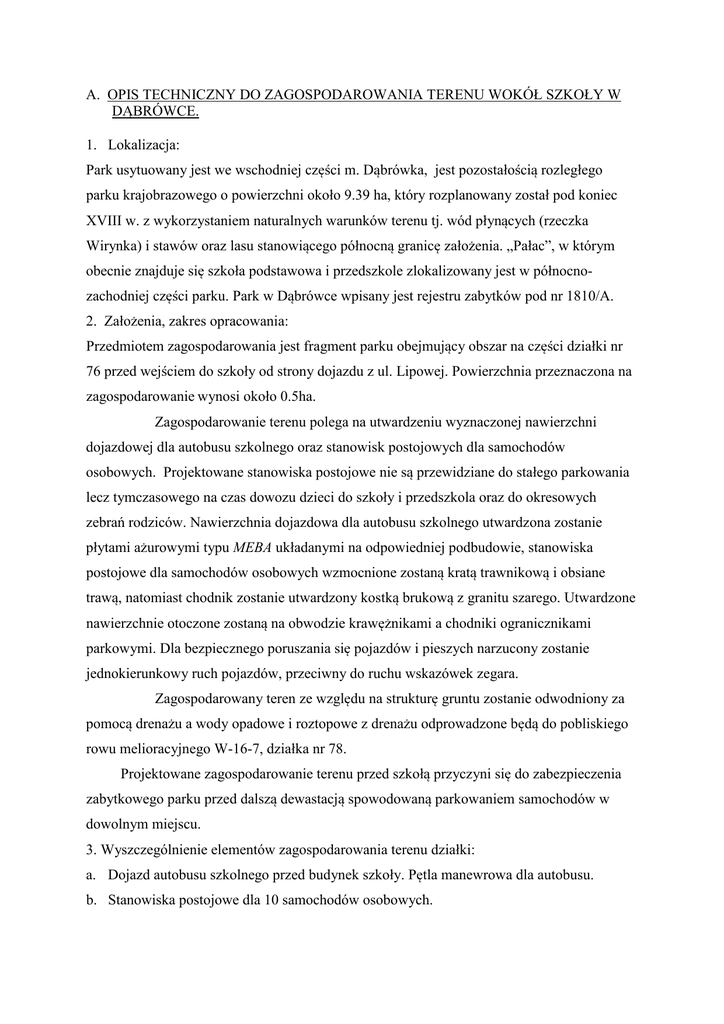 A. OPIS TECHNICZNY DO ZAGOSPODAROWANIA TERENU WOKÓŁ SZKOŁY W DĄBRÓWCE. 1. Lokalizacja: Park usytuowany jest we wschodniej części m. Dąbrówka, jest pozostałością rozległego parku krajobrazowego o powierzchni około 9.39 ha, który rozplanowany został pod koniec XVIII w. z wykorzystaniem naturalnych warunków terenu tj. wód płynących (rzeczka Wirynka) i stawów oraz lasu stanowiącego północną granicę założenia. „Pałac”, w którym obecnie znajduje się szkoła podstawowa i przedszkole zlokalizowany jest w północnozachodniej części parku. Park w Dąbrówce wpisany jest rejestru zabytków pod nr 1810/A. 2. Założenia, zakres opracowania: Przedmiotem zagospodarowania jest fragment parku obejmujący obszar na części działki nr 76 przed wejściem do szkoły od strony dojazdu z ul. Lipowej. Powierzchnia przeznaczona na zagospodarowanie wynosi około 0.5ha. Zagospodarowanie terenu polega na utwardzeniu wyznaczonej nawierzchni dojazdowej dla autobusu szkolnego oraz stanowisk postojowych dla samochodów osobowych. Projektowane stanowiska postojowe nie są przewidziane do stałego parkowania lecz tymczasowego na czas dowozu dzieci do szkoły i przedszkola oraz do okresowych zebrań rodziców. Nawierzchnia dojazdowa dla autobusu szkolnego utwardzona zostanie płytami ażurowymi typu MEBA układanymi na odpowiedniej podbudowie, stanowiska postojowe dla samochodów osobowych wzmocnione zostaną kratą trawnikową i obsiane trawą, natomiast chodnik zostanie utwardzony kostką brukową z granitu szarego. Utwardzone nawierzchnie otoczone zostaną na obwodzie krawężnikami a chodniki ogranicznikami parkowymi. Dla bezpiecznego poruszania się pojazdów i pieszych narzucony zostanie jednokierunkowy ruch pojazdów, przeciwny do ruchu wskazówek zegara. Zagospodarowany teren ze względu na strukturę gruntu zostanie odwodniony za pomocą drenażu a wody opadowe i roztopowe z drenażu odprowadzone będą do pobliskiego rowu melioracyjnego W-16-7, działka nr 78. Projektowane zagospodarowanie terenu przed szkołą przyczyni się do zabezpieczenia zabytkowego parku przed dalszą dewastacją spowodowaną parkowaniem samochodów w dowolnym miejscu. 3. Wyszczególnienie elementów zagospodarowania terenu działki: a. Dojazd autobusu szkolnego przed budynek szkoły. Pętla manewrowa dla autobusu. b. Stanowiska postojowe dla 10 samochodów osobowych. c. Zgodnie z wytycznymi instrukcji bezpieczeństwa pożarowego, opracowanej przez rzeczoznawcę do spraw zabezpieczeń przeciwpożarowych inż. Ryszarda Rakowera z maja 2011r. wykonanie dwóch hydrantów zewnętrznych. d. Podłączenie przyłącza ścieków ze zmywalni szkolnej i z kuchni z mieszkania służbowego do sieci kanalizacji sanitarnej. Obecnie ścieki te włączone są do kanalizacji wody deszczowej, która z kolej odprowadzana jest do pobliskiego stawu. e. Drenaż terenu przeznaczonego na zagospodarowanie i odprowadzenie wody drenażowej do pobliskiego rowu melioracyjnego, działka nr 78. Utwardzenie skarpy i dna rowu płytami ażurowymi „MEBA” na długości 2.0m przed wylotem i 5.0m za wylotem wód drenażowych. Wymiana przepustu pod przejściem przez rów na rurę o średnicy 600mm. f. Oświetlenie zagospodarowanego terenu oprawami parkowymi. g. Montaż platformy pionowej o wysokości podnoszenia do wys. 1.0m dla osób niepełnosprawnych przy wejściu do szkoły. h. Uzupełnienie przestrzeni pomiędzy istniejącymi drzewami niskimi krzewami w formie grupowej lub jako żywopłotu nieforemnego. 4. Dane charakterystyczne zagospodarowania: Powierzchnia utwardzenia nawierzchni działki: 1035,00 m2 Powierzchnia 10 stanowisk postojowych: 133,43 m2 Powierzchnia chodnika utwardzonego: 149,98 m2 A.1 OPIS DO PROJEKTU TECHNICZNEGO KONSTRUKCJI UTWARDZENIA NAWIERZCHNI NA PĘTLI DOJAZDOWEJ AUTOBUSU SZKOLNEGO I WZMOCNIENIA NAWIERZCHNI MIEJSC POSTOJOWYCH DLA SAMOCHODÓW OSOBOWYCH. 1. Przedmiot opracowania Przedmiotem opracowania jest utwardzenie nawierzchni istniejącej pętli dojazdowej do istniejącej szkoły i wzmocnienie nawierzchni na miejscach postojowych dla 10 samochodów osobowych. 2. Teren lokalizacji zadania Teren lokalizacji zamierzeń inwestycyjnych położony jest w przyszkolnym parku porośniętym licznymi drzewami. Powierzchnia terenu jest równa i układa się na poziomie rzędnych 83.60 - 83.30 m npm. Podłoże terenu stanowią nawodnione grunty piaszczysto-gliniaste przewidziane do zdrenowania. 3. Opis projektu 4.1 Rozwiązanie sytuacyjne Proponowane wzmocnienie terenu zaprojektowano z pominięciem rosnących na terenie drzew. Szerokości projektowanej nawierzchni są zmienne, wahają się w granicach 4.0 – 6.5 m i wynikają z istniejącej sytuacji terenowej i potrzeb parametrowych pojazdów. Projektowany układ komunikacyjny włączono sytuacyjnie i wysokościowo do istniejącej ulicy dojazdowej ( bez nazwy ) o nie urządzonej nawierzchni. 4.2 Rozwiązanie wysokościowe Rozwiązanie wysokościowe projektowanych nawierzchni dostosowano do rzędnych istniejącego terenu i zaprojektowano w poziomie rzędnych 83.40 – 83.55 m npm bez spadków poprzecznych. Odwodnienie nawierzchni odbywa się bezpośrednio do gruntu poprzez nieszczelną nawierzchnię. 4. Konstrukcja nawierzchni 4.1 Utwardzenie dojazdu autobusu ( pętla ) Nawierzchnia z płyt betonowych ażurowych ( krata ekologiczna ) typu MEBA o wymiarach 60 x 40 x 10 cm na podsypce piaskowej grubości 5 cm. Podbudowa nawierzchni z kruszywa łamanego stabilizowanego mechanicznie lub z tłucznia kamiennego grubości 25 cm na warstwie filtracyjnej grubości 15 cm z piasku średnioziarnistego. 4.2 Miejsca postojowe Proponuje się nawierzchnię z kratki polietylenowej o wymiarach 50 x 50 x 4 cm ułożoną na podbudowie grubości 15 cm i warstwie filtracyjnej grubości 10cm. 4.3 Krawężniki Krawężniki wokół nawierzchni betonowe typu ulicznego o wymiarach 15 x 30, na podsypce piaskowo-cementowej grubości 5 cm i ławie z oporem z betonu B-10. 4.4 Chodniki Nawierzchn