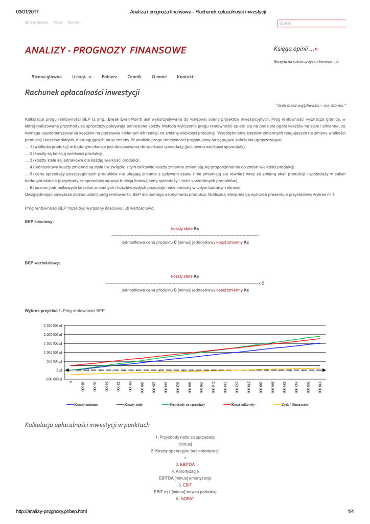 03/01/2017 Strona główna Analiza i prognoza finansowa Rachunek opłacalności inwestycji Mapa Kontakt Szukaj ANALIZY - PROGNOZY FINANSOWE Księga opinii ...» Recepta na sukces w życiu i biznesie ...» Strona główna Usługi...v Pobierz Cennik O mnie Kontakt Rachunek opłacalności inwestycji "Jeśli masz wątpliwości – nie rób nic." Kalkulacja progu rentowności BEP (z ang.: Break Even Point) jest wykorzystywana do wstępnej oceny projektów inwestycyjnych. Próg rentowności wyznacza granicę, w której realizowane przychody ze sprzedaży pokrywają poniesione koszty. Metoda wyliczenia progu rentowności opiera się na podziale ogółu kosztów na stałe i zmienne, co wymaga usystematyzowania kosztów na podstawie kryterium ich reakcji na zmiany wielkości produkcji. Wyodrębnienie kosztów zmiennych reagujących na zmiany wielkości produkcji i kosztów stałych, niereagujących na te zmiany. W analizie progu rentowności przyjmujemy następujące założenia upraszczające: .....1) wielkość produkcji w badanym okresie jest dostosowana do wielkości sprzedaży (jest równa wielkości sprzedaży), .....2) koszty są funkcją wielkości produkcji, .....3) koszty stałe są jednakowe dla każdej wielkości produkcji, .....4) jednostkowe koszty zmienne są stałe i w związku z tym całkowite koszty zmienne zmieniają się proporcjonalnie do zmian wielkości produkcji, .....5) ceny sprzedaży poszczególnych produktów nie ulegają zmianie z upływem czasu i nie zmieniają się również wraz ze zmianą skali produkcji i sprzedaży w całym badanym okresie (przychody ze sprzedaży są więc funkcją liniową ceny sprzedaży i ilości sprzedanych produktów), .....6) poziom jednostkowych kosztów zmiennych i kosztów stałych pozostaje niezmieniony w całym badanym okresie. Uwzględniając powyższe można ustalić próg rentowności BEP dla jednego asortymentu produkcji. Graficzną interpretację wyliczeń prezentuje przykładowy wykres nr 1. Próg rentowności BEP może być wyrażony ilościowo lub wartościowo: BEP ilościowy: koszty stałe Ks jednostkowa cena produktu C [minus] jednostkowy koszt zmienny Kz BEP wartościowy: koszty stałe Ks x C jednostkowa cena produktu C [minus] jednostkowy koszt zmienny Kz Wykres przykład 1. Próg rentowności BEP Kalkulacja opłacalności inwestycji w punktach 1. Przychody netto ze sprzedaży [minus] 2. Koszty operacyjne bez amortyzacji = 3. EBITDA 4. Amortyzacja EBITDA [minus] amortyzacja 5. EBIT EBIT x (1 [minus] stawka podatku) 6. NOPAT http://analizyprognozy.pl/bep.html 1/4 03/01/2017 Analiza i prognoza finansowa Rachunek opłacalności inwestycji 7. Odsetki od kredytów EBIT [minus] odsetki od kredytów 8. EBT 9. Podatek dochodowy EBT [minus] podatek dochodowy 10. EAT 11. Amortyzacja 12. Kapitał obrotowy netto 13. Zmiany zapotrzebowania / wycofania kapitału obrotowego netto 14. Wartość rezydualna (resztowa) RV EAT + amortyzacja +/ zmiany zapotrzebowania na kapitał obrotowy netto + wartość rezydualna RV 15. Przepływy pieniężne U 16. Nakłady kapitałowe I a) kapitał własny () b) zaciągnięcie kredytów (+) 17. Spłaty rat kredytów () nakłady kapitałowe I x współczynnik dyskonta CO 18. Zdyskontowane nakłady kapitałowe 19. Suma zdyskontowanych nakładów kapitałowych PVI U [minus] nakłady kapitałowe I 20. Przepływy pieniężne netto NCF 21. Oczekiwana stopa zwrotu koszt kapitału własnego, lub WACC nakłady kapitałowe plus przepływy pieniężne U 22. Saldo przepływów z inwestycji 1 / (1 + r) ^n 23. Współczynnik dyskontowy CO U x CO 24. Zdyskontowane wpływy gotówkowe ∑ U x CO 25. Suma zdyskontowanych wpływów gotówkowych PVU 26. Stopa zysku 27. Wewnętrzna stopa zwrotu IRR ∑ Ut / (1 + i)^t [minus] ∑ It / (1 + i)^t 28. Wartość bieżąca netto NPV PVU [minus] nakłady kapitałowe 28. Wartość bieżąca netto NPV NCF x CO 29. Zdyskontowana wartość przepływów pieniężnych ∑ NCF x CO 30. Wartość bieżąca netto NPV dla kapitału własnego NPV / PVI 31. Wskaźnik bieżącej wartości netto NPVR PVU / PVI 32. Indeks rentowności PI Praktyczne zastosowanie opisanych obliczeń można zobaczyć w załączonej przykładowej kalkulacji opłacalności projektu inwestycyjnego dla kapitału całkowitego i dla kapitału własnego w spółce "Przykład" S.A. w latach 2000 2007 zobacz Objaśnienia do kalkulacji: 1. Przychody netto ze sprzedaży zostały skalkulowane w oparciu o prognozę przychodów w okresie inwestycyjnym plus procentowy wzrost wartości przychodów w kolejnych latach działalności. 2. Koszty operacyjne związane z bieżącym funkcjonowaniem przedsiębiorstwa z wyłączeniem kosztów amortyzacji. Dynamika przyrostu kosztów operacyjnych została dodatnio skorelowana z dynamiką przyrostu przychodów netto ze sprzedaży uwzględniając jednocześnie ewentualną korektę przyrostu tych kosztów o przyjęty współczynnik korygujący. 3. Opis wskaźnika EBITDA w zakładce Uzupełnienie. 4. Koszty amortyzacji zostały skalkulowane w oparciu o przyjęty plan amortyzacji środków trwałych. 5. Opis wskaźnika EBIT w zakładce Uzupełnienie. 6. Opis wskaźnika NOPAT w zakładce Uzupełnienie. 7. Odsetki od kredytów zostały skalkulowane w oparciu o plan spłaty kredytów. 8. EBT (z ang.: Earnings Before Taxes ) zysk przedsiębiorstwa przed naliczeniem podatku dochodowego odpowiednik zysku brutto. 9. Wartość podatku dochodowego została skalkulowana jako iloraz wartości wskaźnika EBT i stawki podatkowej. 10. EAT (z ang.: Earnings After Taxes) zysk przedsiębiorstwa po naliczeniu podatku dochodowego odpowiednik zysku netto. 11. Koszty amortyzacji skalkulowane jako koszty nie wydatkowe. 12. Opis poziomu kapitału obrotowego netto w zakładce Kapitał obrotowy netto. 13. Zmiana kapitału obrotowego netto została skalkulowana jako różnica pomiędzy wartością tego kapitału w roku ubiegłym i roku bieżącym. 14. Opis wartości rezydualnej RV w zakładce Uzupełnienie. 15. Przepływy p