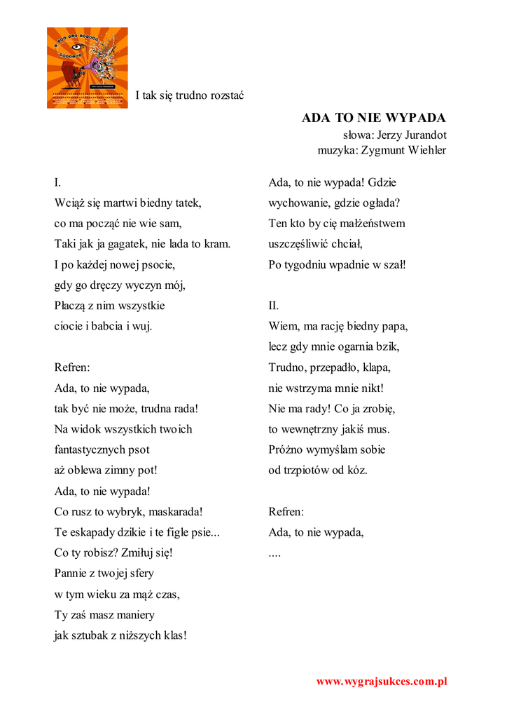 I tak się trudno rozstać ADA TO NIE WYPADA słowa: Jerzy Jurandot muzyka: Zygmunt Wiehler I. Ada, to nie wypada! Gdzie Wciąż się martwi biedny tatek, wychowanie, gdzie ogłada? co ma począć nie wie sam, Ten kto by cię małżeństwem Taki jak ja gagatek, nie lada to kram. uszczęśliwić chciał, I po każdej nowej psocie, Po tygodniu wpadnie w szał! gdy go dręczy wyczyn mój, Płaczą z nim wszystkie II. ciocie i babcia i wuj. Wiem, ma rację biedny papa, lecz gdy mnie ogarnia bzik, Refren: Trudno, przepadło, klapa, Ada, to nie wypada, nie wstrzyma mnie nikt! tak być nie może, trudna rada! Nie ma rady! Co ja zrobię, Na widok wszystkich twoich to wewnętrzny jakiś mus. fantastycznych psot Próżno wymyślam sobie aż oblewa zimny pot! od trzpiotów od kóz. Ada, to nie wypada! Co rusz to wybryk, maskarada! Refren: Te eskapady dzikie i te figle psie... Ada, to nie wypada, Co ty robisz? Zmiłuj się! .... Pannie z twojej sfery w tym wieku za mąż czas, Ty zaś masz maniery jak sztubak z niższych klas! www.wygrajsukces.com.pl
