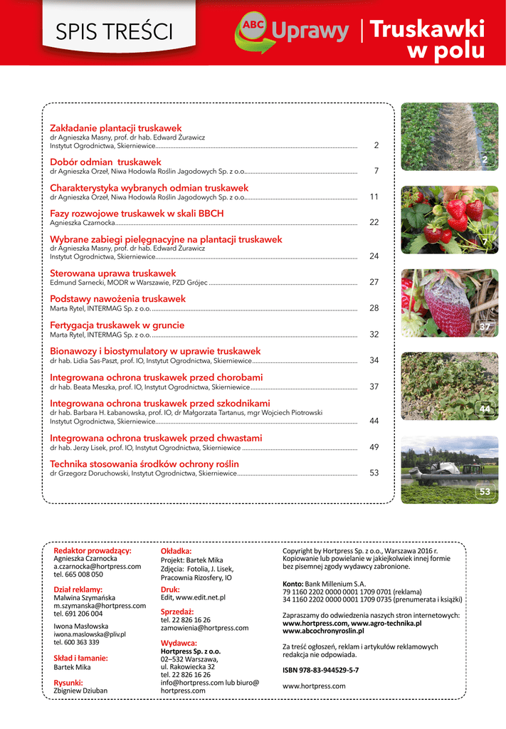 | Truskawki w polu SPIS TREŚCI Zakładanie plantacji truskawek dr Agnieszka Masny, prof. dr hab. Edward Żurawicz Instytut Ogrodnictwa, Skierniewice......................................................................................................................... 2 Dobór odmian truskawek dr Agnieszka Orzeł, Niwa Hodowla Roślin Jagodowych Sp. z o.o.................................................................... 7 2 Charakterystyka wybranych odmian truskawek dr Agnieszka Orzeł, Niwa Hodowla Roślin Jagodowych Sp. z o.o.................................................................... 11 Fazy rozwojowe truskawek w skali BBCH Agnieszka Czarnocka.................................................................................................................................................. 22 Wybrane zabiegi pielęgnacyjne na plantacji truskawek dr Agnieszka Masny, prof. dr hab. Edward Żurawicz Instytut Ogrodnictwa, Skierniewice......................................................................................................................... 24 7 Sterowana uprawa truskawek Edmund Sarnecki, MODR w Warszawie, PZD Grójec.......................................................................................... 27 Podstawy nawożenia truskawek Marta Rytel, INTERMAG Sp. z o.o............................................................................................................................. 28 Fertygacja truskawek w gruncie Marta Rytel, INTERMAG Sp. z o.o............................................................................................................................. 32 37 Bionawozy i biostymulatory w uprawie truskawek dr hab. Lidia Sas-Paszt, prof. IO, Instytut Ogrodnictwa, Skierniewice................................................................ 34 Integrowana ochrona truskawek przed chorobami dr hab. Beata Meszka, prof. IO, Instytut Ogrodnictwa, Skierniewice................................................................. 37 Integrowana ochrona truskawek przed szkodnikami dr hab. Barbara H. Łabanowska, prof. IO, dr Małgorzata Tartanus, mgr Wojciech Piotrowski Instytut Ogrodnictwa, Skierniewice......................................................................................................................... 44 44 Integrowana ochrona truskawek przed chwastami dr hab. Jerzy Lisek, prof. IO, Instytut Ogrodnictwa, Skierniewice...................................................................... 49 Technika stosowania środków ochrony roślin dr Grzegorz Doruchowski, Instytut Ogrodnictwa, Skierniewice......................................................................... 53 53 Redaktor prowadzący: Agnieszka Czarnocka [email protected] tel. 665 008 050 Dział reklamy: Malwina Szymańska [email protected] tel. 691 206 004 Iwona Masłowska [email protected] tel. 600 363 339 Skład i łamanie: Bartek Mika Rysunki: Zbigniew Dziuban Okładka: Projekt: Bartek Mika Zdjęcia: Fotolia, J. Lisek, Pracownia Rizosfery, IO Druk: Edit, www.edit.net.pl Sprzedaż: tel. 22 826 16 26 [email protected] Wydawca: Hortpress Sp. z o.o. 02–532 Warszawa, ul. Rakowiecka 32 tel. 22 826 16 26 [email protected] lub biuro@ hortpress.com Copyright by Hortpress Sp. z o.o., Warszawa 2016 r. Kopiowanie lub powielanie w jakiejkolwiek innej formie bez pisemnej zgody wydawcy zabronione. Konto: Bank Millenium S.A. 79 1160 2202 0000 0001 1709 0701 (reklama) 34 1160 2202 0000 0001 1709 0735 (prenumerata i książki) Zapraszamy do odwiedzenia naszych stron internetowych: www.hortpress.com, www.agro-technika.pl www.abcochronyroslin.pl Za treść ogłoszeń, reklam i artykułów reklamowych redakcja nie odpowiada. ISBN 978-83-944529-5-7 www.hortpress.com