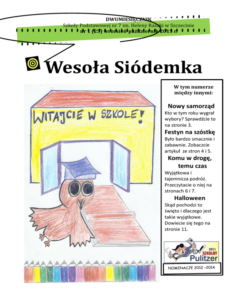 DWUMIESIĘCZNIK Szkoły Podstawowej nr 7 im. Heleny Raszki w Szczecinie nr 1 (25) wrzesień-październik 2015 r. Wesoła Siódemka W tym numerze między innymi: Nowy samorząd Kto w tym roku wygrał wybory? Sprawdźcie to na stronie 3. Festyn na szóstkę Było bardzo smacznie i zabawnie. Zobaczcie artykuł ze stron 4 i 5. Komu w drogę, temu czas Wyjątkowa i tajemnicza podróż. Przeczytacie o niej na stronach 6 i 7. Halloween Skąd pochodzi to święto i dlaczego jest takie wyjątkowe. Dowiecie się tego na stronie 11. NOMINACJE 2012 –2014 NIETAJNE, AKTUALNE Od redakcji Wstępniak Drogie Czytelniczki! Drodzy Czytelnicy! Miło nam powitać Was w nowym roku szkolnym. Wakacje niestety już się skończyły (Dlaczego?!), więc czas brać się do pracy. Nikomu pewnie nie chce się uczyć od 1 września, ale nie można przecież na samym początku złapać kilku jedynek. Teraz coś, co pewnie wszystkich Was interesuje. Oczywiście wybory do szkolnego samorządu. Żeby dowiedzieć się, kto został nowym przewodniczącym, zobaczcie tekst na stronie 3. Nasza redakcja oprócz pracy nad gazetką miała też chwilę odpoczynku. Wybraliśmy się na pewną wycieczkę… za dużo tu nie powiemy, więc jeśli chcecie poznać więcej szczegółów, zapraszamy na stronę 6 i 7. Poza tym na pewno pamiętacie, że 31 października jest Halloween. Wiemy, że nie każdy je świętuje, ale tym, którzy to robią, życzymy wszystkiego strasznego i tony cukierków. A jeśli chcecie poznać historię Halloween, musicie przeczytać artykuł na stronie 9. Czas już pożegnać się z Wami w tym numerze, więc mamy nadzieję, że rok szkolny szybko mija i do zobaczenia za dwa miesiące. Redaktor naczelny, Paweł Naglacki VI b NOWE TWARZE Nowych nauczycieli Str. 2 Wesoła Siódemka NIETAJNE, AKTUALNE WALKA O WŁADZĘ Nowy Samorząd Szkolny Na początku roku szkolnego najważniejsza jest zawsze jedna rzecz: wybory do Samorządu Szkolnego. Były one zacięte. A zwyciężyła... Jak wiecie, 1 października bieżącego roku odbyły się wybory do naszego Samorządu Szkolnego. Były one poprzedzone kampanią wyborczą. Kandydaci do Samorządu przygotowali bardzo ciekawe i oryginalne plakaty przedstawiające najważniejsze punkty swojego programu. Po przeliczeniu wszystkich oddanych głosów okazało się, że przewodniczącą Samorządu została uczennica klasy 6b-Ola Pierożek. Uczniowie klas 4-6 oddali na Olę 79 głosów. Pierwszym zastępcą przewodniczącej został Mikołaj Wiśniewski (57 głosów), a drugim – Zofia Junak (36 głosów). Sekretarzem Samorządu została wybrana Hanna Myśliwy (33 głosy). Pozostali członkowie Samorządu to: Łukasz Janikowski (30 głosów) oraz Dawid Dzido (24 głosy). Dowiedziałyśmy się też, że członkiem samorządu jest nasz kolega z klasy – Jakub Mejza, który uzyskał 30 głosów uczniowskich. Przeprowadziłyśmy z nim krótki wywiad, który przedstawiamy poniżej: Jak Ci się podoba praca w Samorządzie Szkolnym? Jest fajnie, moi koledzy z samorządu są mili. Co się robi w Samorządzie Szkolnym? Obmyślamy różne festyny i konkursy, które odbędą się w ciągu roku. Kto jest opiekunem Samorządu Szkolnego? Pani Anna Tytonik. Czy, Twoim zdaniem, Ola dobrze sprawuje funkcję przewodniczącej? Tak. Myślę, że jest dobrą przewodniczącą TO LUBIĘ! Podziękowałyśmy Kubie za wywiad i na tym kończymy nasz krótki artykuł o pracy w Samorządzie Szkolnym. Mamy nadzieję, że dowiedzieliście się z niego czegoś ciekawego. Ankiety Karolina Hołubasz i Amelia Ćwik IV b KOŁA ZAINTERESOWAŃ W NASZEJ SZKOLE Przeprowadziliśmy wśród 55 uczniów naszej szkoły sondę na temat popularności poszczególnych kół zainteresowań. Najwięcej dzieci z naszej szkoły z klas 4– 6, które poprosiliśmy o zaznaczenie w ankiecie zajęć, na które uczęszczają po lekcjach, wybrało zajęcia sportowe - pewnie zgodnie z nowymi zaleceniami: żyj i jedz zdrowo. Na drugim miejscu dzieci zaznaczały zajęcia dziennikarskie, a na trzecim językowe – wiadomo, znajomość języków obcych przydaje się w życiu. Niestety najmniejszym zainteresowaniem cieszą się zajęcia teatralne a szkoda, bo może wśród nas jest ukryty talent aktorski, który sięgnie po Oskara. Pola Jacoszek i Ola Kubiak IV b CO WOLĄ UCZNIOWIE? - Chipsy czy lody? Więcej osób powiedziało, że lody. - Komputer czy telewizor? Tutaj więcej osób powiedziało, że komputer. - Filmy czy książki o nich? Dużo dzieci odpowiedziało, że filmy. - Kino czy zakupy w galerii handlowej? Mówili, że kino, ale mówili też, że zakupy. - Odrabianie lekcji czy czytanie lektury? Jedna Nr 1 osoba odpowiedziała odrabianie lekcji, a reszta czytanie lektury. - Spotkania z przyjaciółmi czy nauka? Oczywiście wszyscy uczniowie odpowiadali: spotkania z przyjaciółmi. str. 3 NIETAJNE, AKTUALNE FESTYN NA SZÓSTKĘ Cos dla rodziny Już po raz kolejny w naszej Szkole odbył się Festyn Rodzinny, na który oprócz naszych uczniów z rodzinami zaproszeni byli wszyscy mieszkańcy Warszewa. Główną organizatorką Festynu była Pani Monika Gabryszewska. Przyszło bardzo wiele osób – a najważniejsze, że były to całe rodziny, które mogły spędzić miłe przedpołudnie w gronie najbliższych i przyjaciół. Swoją obecnością zaszczycił nas również sam Prezydent Szczecina – Piotr Krzystek. Stoiska były bardzo różnorodne. Za symboliczną złotówkę można było zjeść chleb z przepysznym smalcem przygotowanym przez nasze Panie kucharki – który cieszył się wielkim wzięciem. Była również grochówka i grillowane kiełbaski. Chyba największym powodzeniem cieszyła się kawiarenka językowa, w której po uprzednim zamówieniu w języku angielskim bądź niemieckim można było zjeść przepyszne ciasta przygotowane przez naszych rodziców. „Najlepszym ciastem był kremowy sernik”- powiedział Pan Damian Domański, opiekun kawiarenki. W czasie Festynu odbywały się różnego rodzaju pokazy: tańczy