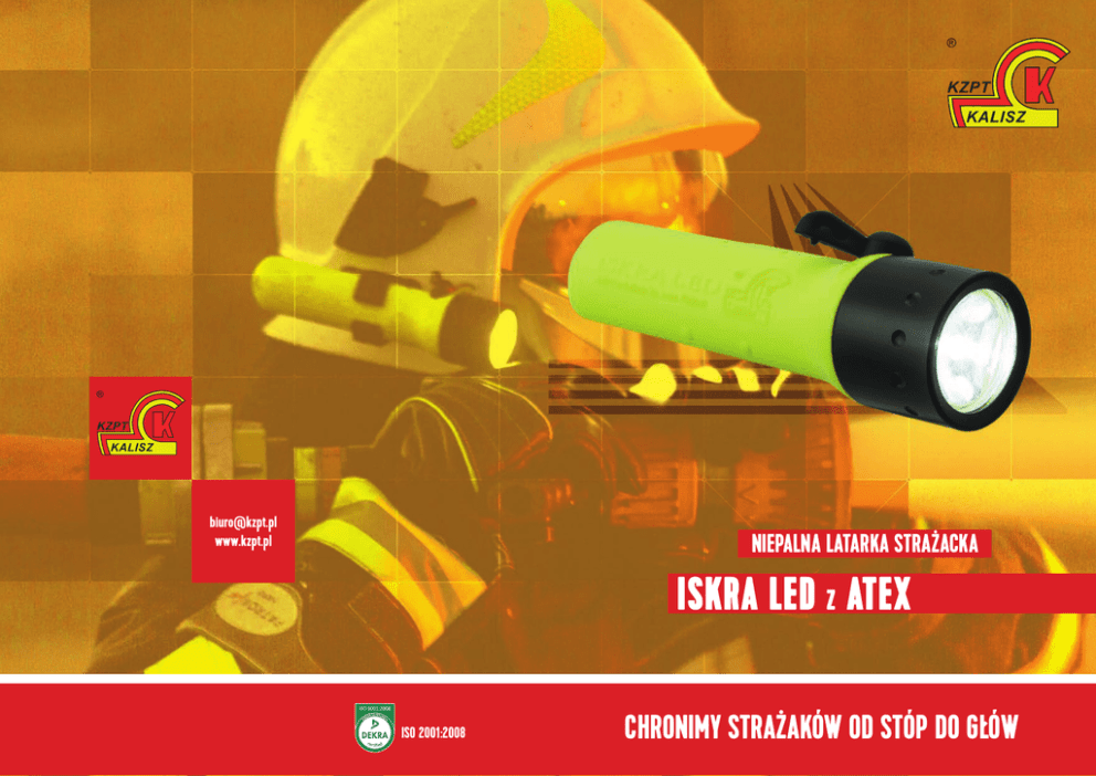 [email protected] www.kzpt.pl NIEPALNA LATARKA STRAŻACKA ISKRA LED Z ATEX ISO 2001:2008 CHRONIMY STRAŻAKÓW OD STÓP DO GŁÓW Niepalna latarka strażacka ISKRA LED z ATEX Latarka strażacka ISKRA LED jest przeznaczona do stosowania w ochronie przeciwpożarowej oraz strefach zagrożenia wybuchem gazów, par i mgieł (G) lub pyłów (D). Obudowa latarki jest wytrzymała, niepalna oraz lekka. Wykonana z trudnopalnego i antyelektrostatycznego termoplastu. Latarka jest zasilana 4 bateriami alkalicznymi typu AA. Certyfikat obejmuje baterie marek: Energizer, Duracell lub Panasonic. Przystosowana do mocowania na hełmach strażackich KZPT. Latarka spełnia wymagania dyrektywy 94/9/EC oraz następujących norm zharmonizowanych: EN 60079-0:2009, EN 60079-11:2012, EN 60079-7:2007, EN 60079- 31:2009 Oznaczenie: II 2G Ex e ib IIB T4 Gb II 2D Ex tb IIIC TMax 95ºC Db, IP 67 Certyfikat nr: IEP 14 ATEX 0192 Latarka spełnia wymagania EN 443:2008 pkt. 4.11 w zakresie odporności na działanie płomienia. Parametry techniczne: Certyfikat: - IEP 14 ATEX 0192 Zgodność z dyrektywą: - 94/9/EC Zgodność z normą: - EN 60079:2009 Niepalność: - zgodność z normą EN 443:2008 (p.4.1) Zasilanie: - 4 baterie alkaliczne typu AA (LR6) Źródło światła: - diodowy moduł świetlny CREE LED Q5 Siła światła: - 120 lm Czas pracy (na 1 komplecie baterii): - min. 72 h Stopień ochrony IP: - IP 67 Zasięg: - ok. 100 m Masa:- 128g (bez baterii) CHRONIMY STRAŻAKÓW OD STÓP DO GŁÓW