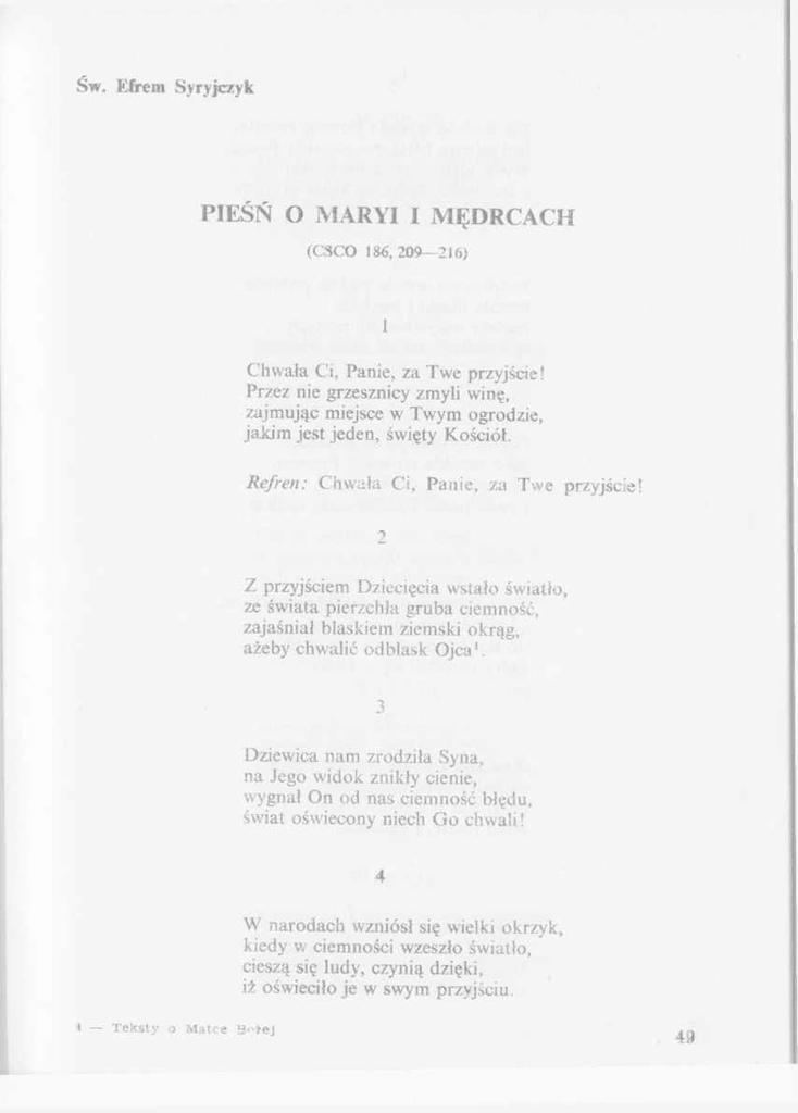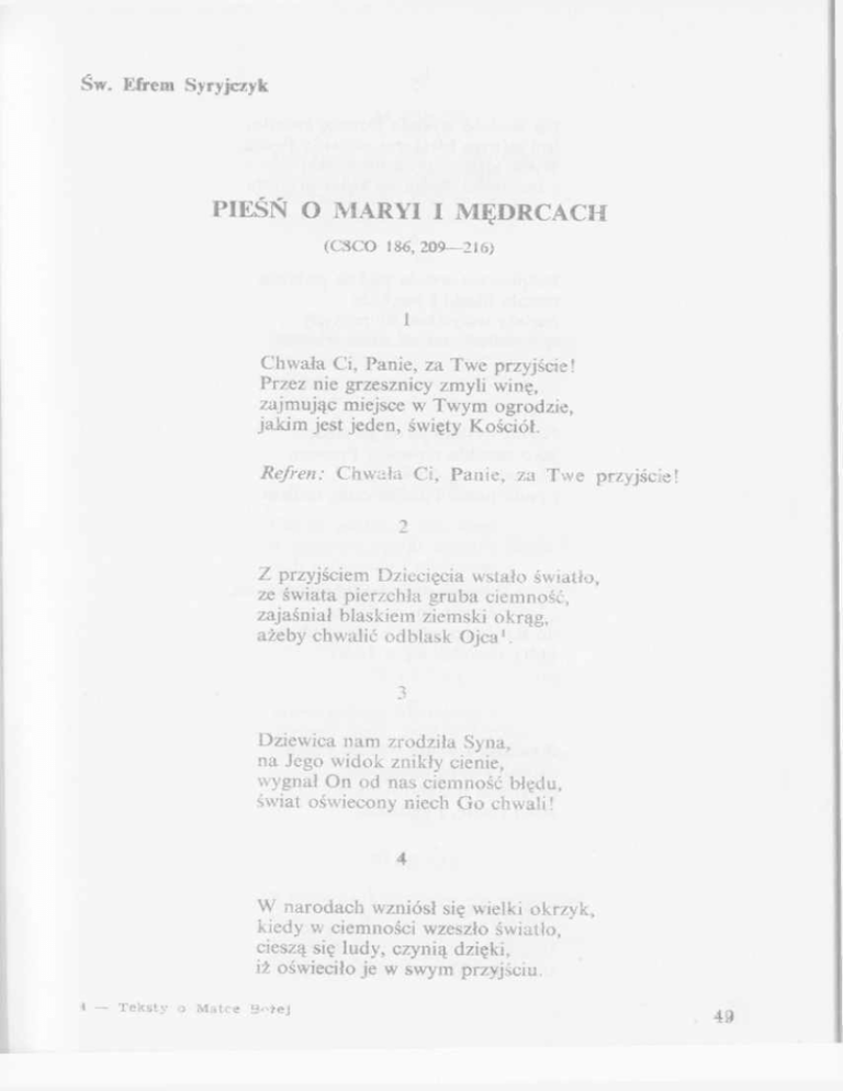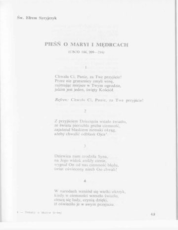 Św. Efrem Syryjczyk PIEŚŃ O MARYI I MĘDRCACH (CSCO 186, 209- 216) 1 Chwała Ci, Panie, za Twe przyjście! Przez nie grzesznicy zmyli winę, zajmując miejsce w Twym ogrodzie, jakim jest jeden, święty Kościół. Refren: Chwała Ci, Panie, za Twe przyjście! 2 Z przyjściem Dziecięcia wstało światło, ze świata pierzchła gruba ciemność, zajaśniał blaskiem ziemski okrąg, ażeby chwalić odblask Ojca1. 3 Dziewica nam zrodziła Syna, na Jego widok znikły cienie, wygnał On od nas ciemność błędu, świat oświecony niech Go chwali ! 4 W narodach wzniósł się wielki okrzyk, kiedy w ciemności wzeszło światło, cieszą się ludy, czynią dzięki, 49 5 Na wschód wysłało Dziecię światło, lśni jasnym blaskiem gwiazdy Persja. Wieść idzie, wzywa do wesela z światłości, która na świat przyszła. 6 Pośpiesznie wstała piękna gwiazda rzuciła blaski i wezwała narody wszystkie, by przyjęły tę światłość, co na ziemi wzeszła. 7 Niebo wysłało jasną gwiazdę jako herolda z wieścią Persom, aby udali się do Króla, i padli przed Nim ze czcią czołem. 8 W te słowa rzekła gwiazda Mędrcom: „Już i Asyria zna wołanie, do Króla śpieszcie z swymi dary, który narodził się w Judei” . 9 Z radością wstali władcy Persji, zabrali z sobą cenne dary, przynieśli je Synowi Panny – złoto i mirę, i kadzidło. 10 Oto w ubogiej Matki domu znaleźli Mędrcy małe Dziecię, Upadli na twarz w uwielbieniu, składając Mu swe hojne dary. 50 11 Maryja Dla kogo, po co? – pyta Panna, co za przyczyna wam kazała opuścić domy i przyjść tutaj do mego Syna z swymi dary? 12 Mędrcy Twój Syn jest Królem; wiele koron On nosi, będąc wszystkich Panem, królestwo Jego sięga wszędzie, rozkazów Jego słucha każdy. 13 Maryja Czy to możliwe, aby sługa w ubóstwie swym zrodziła Króla? Jam niebogata i nieznana – nie mogłam wydać na świat Króla! 14 Mędrcy Tobie jedynej było dane dostąpić łaski, zrodzić Króla, przez Niego wielkie Twe ubóstwo, Synowi zaś ulegną trony. 15 Maryja Królewskich skarbów nie posiadam, bogactwo nie jest mym udziałem, skromny jest dom mój i mieszkanie, dlaczego Królem zwiecie Syna? 51 16 Mędrcy Twe Dziecię skarbem jest bezcennym, co wszystkich ludzi ubogaca, królewskie skarby często giną, Twój Syn nie zginie – nieskończony. 17 Maryja Może kto inny owym królem? Gdzie indziej przeto go szukajcie, Ten Synem jest niewiasty biednej, co nie śmie nawet stać przed królem. 18 Mędrcy Czy to możliwe, aby kiedy zboczyło światło ze swej drogi? Nie ciemność nas tu sprowadziła, lecz jasna światłość – Syn Twój Królem! 19 Maryja Oto widzicie ciche Dziecię i ten dom matki niski, skromny, w którym nic nie ma królewskiego, czyż mógłby tutaj Król zamieszkać? 20 Mędrcy Oto widzimy ciche Dziecię ubogie wprawdzie – ale Króla. Wszak gwiazda słucha Jego woli i przyjście Jego zapowiada. 52 21 Maryja Musicie, ludzie, lepiej szukać owego Króla, by go uczcić. A może zbłądziliście w drodze, takiego tu szukacie Króla? 22 Mędrcy Uwierz nam, Panno, iż Twe Dziecię jest Królem. Wszak nas pouczyła ta gwiazda, co nie może błądzić, i prostą drogę nam wskazała. 23 Maryja To małe Dziecię – jak widzicie – nie ma korony ani tronu, dlaczego zatem tak Je czcicie darami swymi jako Króla? 24 Mędrcy Maleńkie Ono – bo tak chciało, wybrało cichość i pokorę, lecz przed Nim schylą się korony, oddadzą kiedyś cześć i chwałę. 25 Maryja Nie ma me Dziecię władzy, świty, ni wojska, które by walczyło, leży ubogie u swej matki, jak Je możecie mienić Królem? 53 26 Mędrcy Moc Twego Syna płynie z góry, i niebo wiąże i tchnie ogniem. Wszak jedna gwiazda się zjawiła i cały kraj nasz się przeraził. 27 Maryja Dzieckiem jest Syn mój, czyż możliwe, by Królem był nieznany światu? Jak może Dziecię rozkazywać wielkim i sławnym na tej ziemi? 28 Mędrcy Syn Twój, Dziewico, dawno żyje, od dni wieczności, pierwszy z wszystkich, i nawet Adam młodszy niż Ten, który ma cały świat odnowić. 29 Maryja Wyjawcie – proszę – tajemnicę, i wszystko jasno mi powiedzcie, kto wam w ojczyźnie waszej wskazał królewską godność mego Syna? 30 Mędrcy Winnaś nam wierzyć, iż przenigdy – gdyby nas tu nie pchnęła prawda – nie opuścilibyśmy progów naszych, by szukać Twego Syna. 54 31 M aryja Wskażcie mi – proszę – tajemnicę, po przyjacielsku mi przedstawcie, jak się to wszystko u was stało, kto wam polecił przybyć do mnie? 32 Mędrcy Zjawiła się nam wielka gwiazda, piękniejsza wiele od gwiazd wszystkich, swym światłem cały kraj zalała i obwieściła przyjście Króla, 33 Maryja Nie mówcie – błagam – u nas o tym, aby nie doszło naszych władców znaczenie gwiazdy, by z zawiści nie chcieli zabić mego Syna. 34 Mędrcy Nie bój się, Panno, bądź spokojna, Twój Syn zniweczy ich korony, królestwo zburzy – Jemu nigdy ich gniew i zawiść nie zaszkodzą. 35 Maryja Drżę przed Herodem, strasznym wilkiem, złość jego lękiem mnie napełnia, by w szale swym nie dobył miecza, nie ściął owocu, co nie dojrzał. 55 36 Mędrcy Nie lękaj się Heroda, Panno, Twój Syn obali jego władzę i zapanuje, a ten zginie, korona spadnie z jego głowy. 37 M a r yj a Jerozolima krwią spłynęła i życie w niej najlepsi tracą, dowie się Herod – ach to straszne, mówcie więc cicho, bez rozgłosu! 38 Mędrcy Szumowi rzek i ostrzu włóczni nakaże milczeć Dziecka ręka, Jerozolimy miecz się stępi, bez woli Syna nikt nie zginie. 39 Maryja Uczeni w Piśmie i kapłani potrafią wylać krew niewinną, dlatego wzniecą walkę straszną ze mną i z Synem – Mędrcy, milczcie 40 M ędr cy Cóż zdoła zrobić Twemu Dziecku zawiść uczonych i kapłanów? Ono odejmie ich kapłaństwo, zamilknie wielkość ich na zawsze. 56 41 Maryja Mnie także anioł się objawił, to samo mi, co wam, oznajmił, – że Dziecię moje będzie Królem, l śnił będzie wi