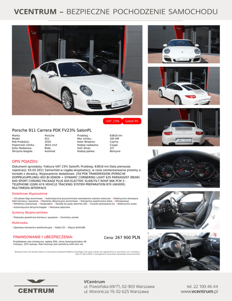 Porsche 911 Carrera PDK FV23% SalonPL Marka: Model: Rok Produkcji: Pojemność silnika : Kolor Nadwozia: Skrzynia biegów: Porsche 911 2010 3614 cm3 Biały Automat Przebieg : Moc silnika : Kolor Wnętrza: Rodzaj nadwozia: Ilość drzwi: Rodzaj paliwa: 63816 km 345 KM Czarny Coupe 2/3 Benzyna OPIS POJAZDU: Dokument sprzedaży: Faktura VAT 23% SalonPL Przebieg: 63816 km Data pierwszej rejestracji: 03.03.2011 Samochód w ciągłej eksploatacji, w razie zainteresowania prosimy o kontakt z doradcą. Wyposażenie dodatkowe: 250 PDK TRANSMISSION (PORSCHE DOPPELKUPPLUNG) 603 BI-XENON + DYNAMIC CORNERING LIGHT 635 PARKASSIST (REAR) 640 SPORT CHRONO PACKAGE PLUS 650 ELECTRIC SLIDE/TILT ROOF 666 PCM 3 TELEPHONE (GSM) 674 VEHICLE TRACKING SYSTEM PREPARATION 870 UNIVERS. MULTIMEDIA INTERFACE Dodatkowe Wyposażenie ✓19-calowe felgi aluminiowe ✓Automatycznie przyciemniane wewnętrzne lusterko wsteczne ✓Elektrycznie sterowany fotel kierowcy i pasażera ✓Elementy dekoracyjne aluminiowe ✓Kierownica wykończona skórą ✓Klimatyzacja ✓Reflektory ksenonowe ✓Szyberdach ✓Światła do jazdy dziennej LED ✓Czujniki parkowania tył ✓Elektryczne szyby ✓Automatyczna skrzynia biegów ✓Skórzana tapicerka Systemy Bezpieczeństwa ✓Poduszka powietrzna kierowcy i pasażera ✓Centralny zamek Multimedia ✓Sportowa kierownica wielofunkcyjna ✓Radio CD ✓Złącze AUX/USB FINANSOWANIE I UBEZPIECZENIA: Cena: 267 900 PLN Przykładowa rata miesięczna, wpłata 20%, okres leasingu/kredytu 48 miesięcy, 10% wykupu. Rata leasingu jest wartością netto bez vat. Niniejsza treść nie stanowi oferty w rozumieniu przepisów Kodeksu Cywilnego oraz opisu towaru ani zapewnienia w rozumieniu art. 4 Ustawy z dnia 27 lipca 2002r o szczególnych warunkach sprzedaży konsumenckiej. Powered by TCPDF (www.tcpdf.org)