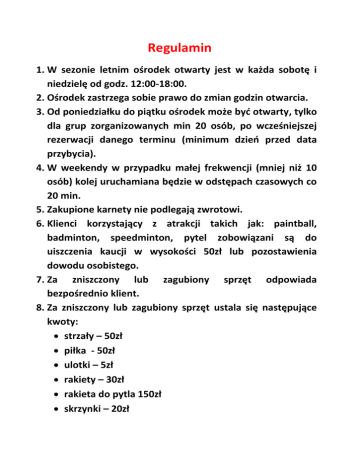 Regulamin 1. W sezonie letnim ośrodek otwarty jest w każda sobotę i niedzielę od godz. 12:00-18:00. 2. Ośrodek zastrzega sobie prawo do zmian godzin otwarcia. 3. Od poniedziałku do piątku ośrodek może być otwarty, tylko dla grup zorganizowanych min 20 osób, po wcześniejszej rezerwacji danego terminu (minimum dzień przed data przybycia). 4. W weekendy w przypadku małej frekwencji (mniej niż 10 osób) kolej uruchamiana będzie w odstępach czasowych co 20 min. 5. Zakupione karnety nie podlegają zwrotowi. 6. Klienci korzystający z atrakcji takich jak: paintball, badminton, speedminton, pytel zobowiązani są do uiszczenia kaucji w wysokości 50zł lub pozostawienia dowodu osobistego. 7. Za zniszczony lub zagubiony sprzęt odpowiada bezpośrednio klient. 8. Za zniszczony lub zagubiony sprzęt ustala się następujące kwoty: strzały – 50zł piłka - 50zł ulotki – 5zł rakiety – 30zł rakieta do pytla 150zł skrzynki – 20zł sprzęt wspinaczkowy – 100zł 9. Ośrodek Kiczera nie ponosi odpowiedzialności za urazy, uszkodzenia ciała, rzeczy materialnych oraz odzieży, powstałe w skutek korzystania z dostępnych atrakcji ośrodka. 10. Z elementów wspinaczkowych mogą korzystać samodzielnie tylko osoby pełnoletnie, które posiadają doświadczenie ze wspinaczki i asekuracji. 11. W momencie zakupu karnetu, automatycznie wyraża się zgodę na akceptację niniejszego regulaminu.