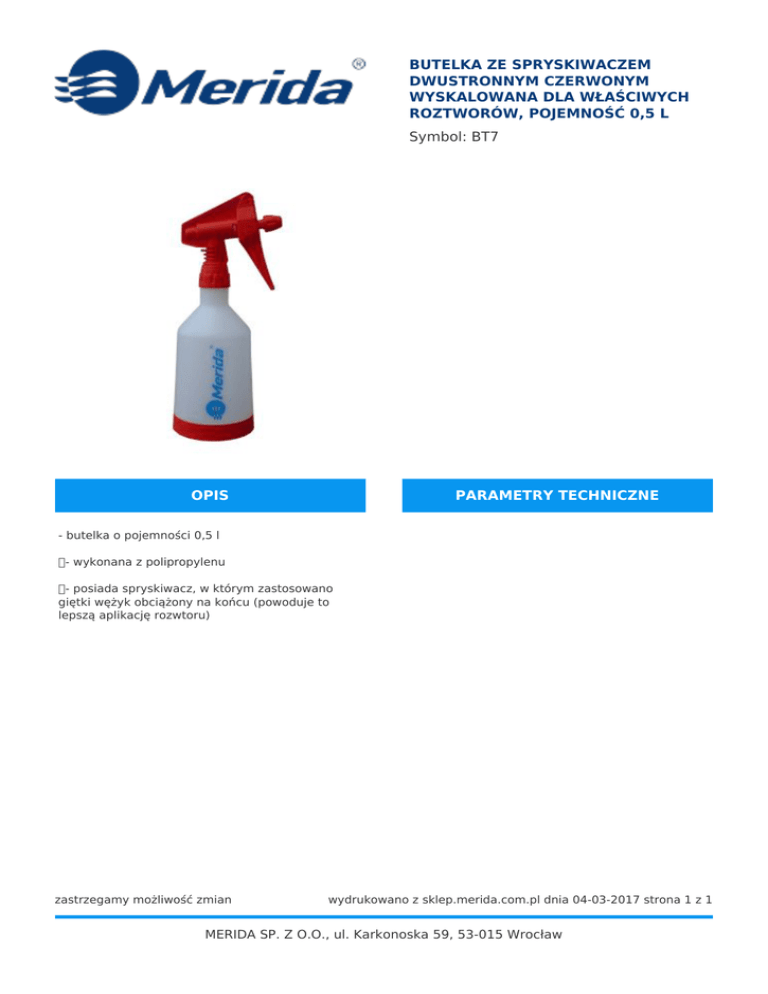 BUTELKA ZE SPRYSKIWACZEM DWUSTRONNYM CZERWONYM WYSKALOWANA DLA WŁAŚCIWYCH ROZTWORÓW, POJEMNOŚĆ 0,5 L Symbol: BT7 OPIS PARAMETRY TECHNICZNE - butelka o pojemności 0,5 l - wykonana z polipropylenu - posiada spryskiwacz, w którym zastosowano giętki wężyk obciążony na końcu (powoduje to lepszą aplikację rozwtoru) zastrzegamy możliwość zmian wydrukowano z sklep.merida.com.pl dnia 04-03-2017 strona 1 z 1 MERIDA SP. Z O.O., ul. Karkonoska 59, 53-015 Wrocław