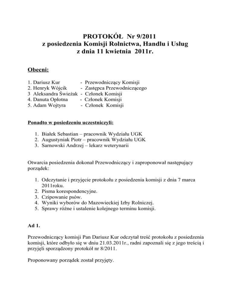 PROTOKÓŁ Nr 9/2011 z posiedzenia Komisji Rolnictwa, Handlu i Usług z dnia 11 kwietnia 2011r. Obecni: 1. Dariusz Kur 2. Henryk Wójcik 3 Aleksandra Świeżak 4. Danuta Opłotna 5. Adam Wojtyra - Przewodniczący Komisji Zastępca Przewodniczącego Członek Komisji Członek Komisji Członek Komisji Ponadto w posiedzeniu uczestniczyli: 1. Białek Sebastian – pracownik Wydziału UGK 2. Augustyniak Piotr – pracownik Wydziału UGK 3. Sarnowski Andrzej – lekarz weterynarii Otwarcia posiedzenia dokonał Przewodniczący i zaproponował następujący porządek: 1. Odczytanie i przyjęcie protokołu z posiedzenia komisji z dnia 7 marca 2011roku. 2. Pisma korespondencyjne. 3. Czipowanie psów. 4. Wyniki wyborów do Mazowieckiej Izby Rolniczej. 5. Sprawy różne i ustalenie kolejnego terminu komisji. Ad 1. Przewodniczący komisji Pan Dariusz Kur odczytał treść protokołu z posiedzenia komisji, które odbyło się w dniu 21.03.2011r., radni zapoznali się z jego treścią i przyjęli sporządzony protokół nr 8/2011. Proponowany porządek został przyjęty. 2 Ad 2. Pismo korespondencyjne wystosowane przez Komendanta Komisariatu Policji w Tłuszczu podinsp. Zenona Maćkowiaka, przyjęte na dziennik korespondencyjne w dniu 25 marca 2011r., zarejestrowane pod nr 1319 dotyczące prośby rozważenia możliwości wyasygnowania środków finansowych z budżetu Gminy Tłuszcz w kwocie 16 500,00zł na dofinansowanie zakupu samochodu służbowego dla potrzeb Komisariatu Policji w Tłuszczu – załącznik nr 1 do niniejszego protokołu. Komisja zapoznała się z treścią pisma i popiera prośbę Komendanta. Na V Sesji Rady Miejskiej zostało zajęte również stanowisko w sprawie tego pisma przez Burmistrza Tłuszcza. Ad 3. Zaproszony na posiedzenie komisji lekarz weterynarii Andrzej Sarnowski został poproszony o wyrażenie swojej opinii na temat czipowania psów z terenu Gminy Tłuszcz. Lek. Weterynarii Andrzej Sarnowski uważa, że jeśli czipowanie psów zostałoby wprowadzone w Gminie Tłuszcz to i gminy sąsiadujące powinny wprowadzić ten obowiązek, a nawet cały powiat. W innym przypadku nie zda to egzaminu i nie sprawdzi się w takim stopniu jak powinno. Dodatkowo również, oprócz osoby, która założyła by te znaczniki psom powinny być osoby, które po złapaniu takiego psa mogły odczytać i zweryfikować zakodowane informacje. Pan Sarnowski zauważył również, iż maleje populacja psów corocznie szczepionych, coraz więcej właścicieli zaniedbuje i ten obowiązek. Według obserwacji własnych weterynarza około 1500 – 1400 psów zostało zaszczepionych w ubiegłym roku. Pan Sarnowski dodał, że na chwilę obecną jest firma, która wyłapuje bezdomne psy z terenu gminy, jednakże świadczone przez nią usługi są zbyt drogie. Radny Wójcik przyznał rację, że płacone należności firmie z Mińska Mazowieckiego są za wysokie i nie zgadza się na to, aby tak było dalej. Dlatego też radni powinni coś z tym zrobić, dlatego chcieli by spróbować namówić Pana Sarnowskiego oraz włodarzy gminy do podjęcia działań w tym zakresie. Pan Sarnowski stwierdził, że nie widzi problemu, aby podjąć działania zmierzające do wprowadzenia czpiowanie czworonogów w Gminie Tłuszcz. Radna Opłotna zwróciła się z pytaniem do Pana Sarnowskiego, czy sterylizacja psów przyniosła by pozytywny skutek, i jaki jest jej koszt. 2 3 Pan Sarnowski w odpowiedzi poinformował, że sterylizacja skuteczna jest na okres 6 miesięcy, koszt szczepionki to około 35 zł. Komisja wnioskuje do Burmistrza, aby pracownik merytoryczny rozeznał się w procedurach dotyczących obowiązkowego przeprowadzenia czipowania psów z terenu Gminy Tłuszcz oraz podjęcie ewentualnych działań. Ww. wniosek został przyjęty przez radnych jednogłośnie. Ad 4. Piotr Augustyniak został poproszony o przedstawienie wyników wyborów do Mazowieckiej Izy Rolniczej, które odbyły się 3 kwietnia 2011r. w Urzędzie Miejskim w Tłuszczu. Frekwencja na wyborach wynosiła 76 osób. Startowało 4 kandydatów, którzy uzyskali następującą liczbę głosów: − Bogdan Milczarek – 46 głosów, − Leszek Banaszek – 32 głosy, − Adam Milczarek – 26 głosów, − Mirosław Sarnowski – 4 głosy. Do Mazowieckiej Izby Rolniczej przeszło z naszej gminy dwóch kandydatów, którzy uzyskali największe poparcie. Piotr Augustyniak poinformował również, że jest w trakcie przygotowywania projektów uchwał w sprawie uporządkowywania nazw niektórych miejscowości z Gminy Tłuszcz. Przygotowane projekty zostaną przedłożone radnym w późniejszym terminie. Ad 5. Radna Opłotna wnioskuje o utwardzenie odnogi ul. Mostowej na osiedlu Górki w Jasienicy oraz utwardzenie ul. Letniskowej na osiedlu Górki – źródło finansowania: bieżące utrzymanie dróg gminnych. Ww. wniosek został przyjęty przez radnych jednogłośnie. Radny Wójcik i Wojtyra wnioskują o modernizację drogi od ronda w m. Kury przez m. Oładki do Chrzęsnego (do ul. Zamkowej) - źródło finansowania: bieżące utrzymanie dróg gminnych. Ww. wniosek został przyjęty przez radnych jednogłośnie. Radny Wojtyra wnioskuje o uzupełnienie nawierzchni ulicy- drogi Grabów – Jaźwie - źródło finansowania: bieżące utrzymanie dróg gminnych. Ww. wniosek został przyjęty przez radnych jednogłośnie. 3 4 Radna Świeżak wnioskuje o remont zapadniętego chodnika na ul. Podkowińskiego w Mokrej Wsi. źródło finansowania: bieżące utrzymanie dróg gminnych. Ww. wniosek został przyjęty przez radnych jednogłośnie. Radny Kur wnioskuje o uprzątnięcie terenu na którym stał Dom Nauczyciela w Kozłach (na którym ma postać SUW). Radny wnioskuje również o wysłanie zawiadomienia do właściciela posesji w Jarzębiej Łące Pana Owczarskiego dot. uprzątnięcia działki na której miał powstać Wiejski Dom Kultury. Ww. wniosek został przyjęty przez radnych jednogłośnie. Komisja wnioskuje o nadanie biegu w sprawie ogłoszenia postę
