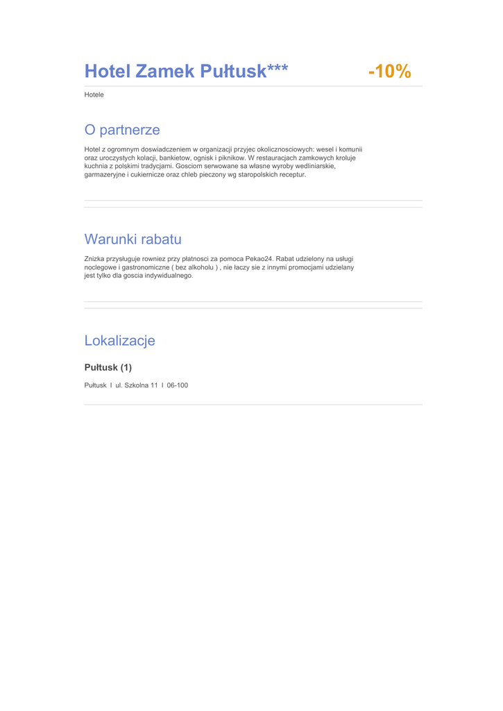 Hotel Zamek Pułtusk*** Hotele O partnerze Hotel z ogromnym doswiadczeniem w organizacji przyjec okolicznosciowych: wesel i komunii oraz uroczystych kolacji, bankietow, ognisk i piknikow. W restauracjach zamkowych kroluje kuchnia z polskimi tradycjami. Gosciom serwowane sa własne wyroby wedliniarskie, garmazeryjne i cukiernicze oraz chleb pieczony wg staropolskich receptur. Warunki rabatu Znizka przysługuje rowniez przy płatnosci za pomoca Pekao24. Rabat udzielony na usługi noclegowe i gastronomiczne ( bez alkoholu ) , nie łaczy sie z innymi promocjami udzielany jest tylko dla goscia indywidualnego. Lokalizacje Pułtusk (1) Pułtusk l ul. Szkolna 11 l 06-100 -10%