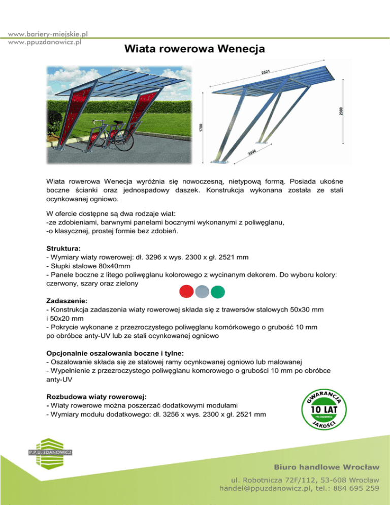Wiata rowerowa Wenecja Wiata rowerowa Wenecja wyróżnia się nowoczesną, nietypową formą. Posiada ukośne boczne ścianki oraz jednospadowy daszek. Konstrukcja wykonana została ze stali ocynkowanej ogniowo. W ofercie dostępne są dwa rodzaje wiat: -ze zdobieniami, barwnymi panelami bocznymi wykonanymi z poliwęglanu, -o klasycznej, prostej formie bez zdobień. Struktura: - Wymiary wiaty rowerowej: dł. 3296 x wys. 2300 x gł. 2521 mm - Słupki stalowe 80x40mm - Panele boczne z litego poliwęglanu kolorowego z wycinanym dekorem. Do wyboru kolory: czerwony, szary oraz zielony Zadaszenie: - Konstrukcja zadaszenia wiaty rowerowej składa się z trawersów stalowych 50x30 mm i 50x20 mm - Pokrycie wykonane z przezroczystego poliwęglanu komórkowego o grubość 10 mm po obróbce anty-UV lub ze stali ocynkowanej ogniowo Opcjonalnie oszalowania boczne i tylne: - Oszalowanie składa się ze stalowej ramy ocynkowanej ogniowo lub malowanej - Wypełnienie z przezroczystego poliwęglanu komorowego o grubości 10 mm po obróbce anty-UV Rozbudowa wiaty rowerowej: - Wiaty rowerowe można poszerzać dodatkowymi modułami - Wymiary modułu dodatkowego: dł. 3256 x wys. 2300 x gł. 2521 mm Mocowanie i wykończenie: - Słupki mocowane bezpośrednio do podłoża (fundamenty punktowe) - Stal ocynkowana ogniowo lub malowana na powierzchni ocynkowanej wg palety RAL Nr kat. Produkt Waga (kg) Cena netto* 220 4 688 zł 215 4 896 zł 105 4 291 zł 100 3 994 zł 40 1 946 zł 48 2 016 zł 60 2 114 zł 220 7 948 zł 100 4 838 zł 40 2 282 zł 48 2 282 zł 60 2 450 zł WIATA ROWEROWA WENECJA – OCYNK OGNIOWY 529640 529645 529641 529646 529642 529643 529644 WIATA PODSTAWOWA, ZADASZENIE Z BLACHY STALOWEJ, BEZ KOLOROWEGO DEKORU WIATA PODSTAWOWA, ZADASZENIE Z POLIWĘGLANU KOMOROWEGO, BEZ KOLOROWEGO DEKORU WIATA DODATKOWA, ZADASZENIE Z BLACHY STALOWEJ, BEZ KOLOROWEGO DEKORU WIATA DODATKOWA ZADASZENIE Z POLIWĘGLANU KOMOROWEGO, BEZ KOLOROWEGO DEKORU OSZALOWANIE BOCZNE (PARA), OCYNK OGNIOWY OSZALOWANIE TYLNE DLA WIATY PODSTAWOWEJ, OCYNK OGNIOWY OSZALOWANIE TYLNE DLA WIATY DODATKOWEJ, OCYNK OGNIOWY WIATA ROWEROWA WENECJA – OCYNK OGNIOWY + FARBA (RAL) 529630 529631 529635 529636 529637 WIATA PODSTAWOWA, ZADASZENIE Z POLIWĘGLANU KOMOROWEGO, Z KOLOROWYM DEKOREM WIATA DODATKOWA ZADASZENIE Z POLIWĘGLANU KOMOROWEGO, Z KOLOROWYM DEKOREM OSZALOWANIE BOCZNE (PARA), OCYNK OGNIOWY + FARBA OSZALOWANIE TYLNE DLA WIATY PODSTAWOWEJ, OCYNK OGNIOWY + FARBA OSZALOWANIE TYLNE DLA WIATY DODATKOWEJ, OCYNK OGNIOWY + FARBA *Podane ceny zawierają rabat 20 %. W przypadku większych zamówień udzielamy korzystnych rabatów!