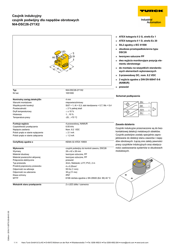 Czujnik indukcyjny czujnik podwójny dla napędów obrotowych NI4-DSC26-2Y1X2 ■ ATEX kategoria II 2 G, strefa Ex 1 ■ ATEX kategoria II 1 D, strefa Ex 20 ■ SIL2 zgodny z IEC 61508 ■ obudowa prostopadłościenna typu DSC26 ■ tworzywo sztuczne PP ■ dwa wyjścia monitorujące pozycję elementu obrotowego ■ do montażu na wszystkich standardowych elementach wykonawczych ■ 2-przewodowy DC, nom. 8.2 VDC ■ 2 wyjścia zgodne z DIN EN 60947-5-6 (NAMUR) ■ przewód Typ Nr kat. NI4-DSC26-2Y1X2 1051000 Nominalny zasięg detekcjiSn Warunki montażowe Współczynniki korekcji Powtarzalność Dryft temperaturowy Histereza Temperatura pracy 4 mm niepowierzchniowy St37 = 1; Al = 0,3; stal nierdzewna = 0,7; Ms = 0,4 ð 2 % pełnej skali ð ± 10 % 1…10 % -25…+70 °C Funkcja wyjścia Częstotliwość przełączania Napięcie zasilania Pobór prądu w stanie wyłączenia Pobór prądu w stanie załączenia 4-przewodowy, NAMUR 0.05 kHz Nom. 8.2 VDC ï 2.1 mA ð 1.2 mA Certyfikaty zgodne z KEMA 02 ATEX 1090X Wykonanie Wymiary Materiał obudowy Materiał powierzchni aktywnej Połączenie elektryczne Typ przewodu Przekrój poprzeczny przewodu: czujnik podwójny do kontroli zaworu, DSC26 28 x 42 x 26 mm tworzywo sztuczne, PP tworzywo sztuczne, PP przewód 4mm, Niebieski, LiYY, PVC, 2 m Odporność na wibracje Odporność na uderzenia Klasa ochrony MTTF 4 x 0.25mm 55 Hz (1 mm) 30 g (11 ms) IP67 6198 rok/lata zgodnie z SN 29500 (Ed. 99) 40 °C Wskaźnik stanu przełączenia 2 x LED żółta / czerwona Schemat podłączenia Zasada działania Czujniki indukcyjne przeznaczone są do bezkontaktowej detekcji metalowych obiektów. Czujniki podwójne zostały specjalnie zaprojektowane do detekcji stanu zaworów i napędów obrotowych. Łączą one zalety pewności pracy czujników indukcyjnych oraz elastyczności zastosowania systemów w obudowach modułowych. Edition • 2016-11-09T10:55:48+01:00 2 1/4 Hans Turck GmbH & Co.KG ñ D-45472 Mülheim an der Ruhr ñ Witzlebenstraße 7 ñ Tel. 0208 4952-0 ñ Fax 0208 4952-264 ñ [email protected] ñ www.turck.com Edition • 2016-11-09T10:55:48+01:00 Czujnik indukcyjny czujnik podwójny dla napędów obrotowych NI4-DSC26-2Y1X2 2/4 Hans Turck GmbH & Co.KG ñ D-45472 Mülheim an der Ruhr ñ Witzlebenstraße 7 ñ Tel. 0208 4952-0 ñ Fax 0208 4952-264 ñ [email protected] ñ www.turck.com Czujnik indukcyjny czujnik podwójny dla napędów obrotowych NI4-DSC26-2Y1X2 Akcesoria montażowe Typ Nr kat. BTS-DSC26-EB1 6900222 Rysunek wymiarowy Element montażowy (krążek) dla czujników podwójnych; tłumiona pozycja końcowa; rozstaw otworów na powierzchni czołowej 80 x 30 mm i 130 x 30mm; wysokość trzpienia 20 mm / ø maks. 35 mm BTS-DSC26-EB2 6900223 Element montażowy (krążek) dla czujników podwójnych; tłumiona pozycja końcowa; rozstaw otworów na powierzchni czołowej 80 x 30 mm i 130 x 30mm; wysokość trzpienia 30 mm / ø maks. 50 mm BTS-DSC26-EB3 6900224 Element montażowy (krążek) dla czujników podwójnych; tłumiona pozycja końcowa; rozstaw otworów na powierzchni czołowej 30 x 130 mm; wysokość trzpienia 30 mm / ø maks. 85 mm IM1-22EX-R 7541231 Wzmacniacz separujący, 2-kanałowy; 2 wyjścia przekaźnikowe NO; wejście dla sygnałów NAMUR; możliwość zał./wył. kontroli zwarcia i przerwy w obwodzie; ustawialna funkcja wyjścia NO/NZ; zdejmowalne terminale zaciskowe; szeroko- Edition • 2016-11-09T10:55:48+01:00 ść 18 mm; uniwersalne napięcie zasilania 3/4 Hans Turck GmbH & Co.KG ñ D-45472 Mülheim an der Ruhr ñ Witzlebenstraße 7 ñ Tel. 0208 4952-0 ñ Fax 0208 4952-264 ñ [email protected] ñ www.turck.com Czujnik indukcyjny czujnik podwójny dla napędów obrotowych NI4-DSC26-2Y1X2 Instrukcja pracy Zastosowanie Urządzenie spełnia wymogi dyrektywy 2014/34/WE i jest przeznaczone do stosowania w strefach zagrożonych wybuchem zgodnie z normami EN 60079-0:2012 + A11 i EN 60079-11:2012. Ponadto może być stosowane w systemie bezpieczeństwa do poziomu SIL2 zgodnie z IEC 61508. Aby uzyskać pewność co do właściwej pracy należy zapoznać się z obowiązującymi lokalnie regulacjami i dyrektywami. Zastosowanie w strefach zagrożonych wybuchem zgodnych z klasyfikacją II 2 G i II 1 D (grupa II, kategoria 2 G, element elektryczny dla strefy gazowej i kategoria 1 D, element elektryczny dla strefy pyłowej). Oznaczenie (patrz urządzenie lub instrukcja) É II 2 G i Ex ia IIC T6 Gb oraz É II 1 D Ex ia IIIC T95 °C Da zgodnie z EN 60079-0, -11 Lokalnie dopuszczalna temperatura otoczenia -25…+70 °C Instalacja / uruchomienie Urządzenia te może instalować, podłączać i uruchamiać jedynie przeszkolony i wykwalifikowany personel. Wykwalifikowany personel musi posiadać wiedzę na temat klas ochronnych, dyrektyw i regulacji dotyczących wyposażenia elektrycznego stosowanego w strefach zagrożenia wybuchem. Należy sprawdzić czy klasyfikacja i oznaczenie na urządzeniu są zgodne z aktualnymi warunkami aplikacji. Urządzenie to dopuszczone jest do stosowania tylko w obwodach Exi zgodnych z EN60079-0 i -11. Należy kontrolować maksymalne dopuszczalne parametry elektryczne. Czujnik po podłączeniu do obwodów innego typu nie może być stosowany w instalacjach Exi. Jeżeli komponenty wyposażenia są wzajemnie połączone, należy przeprowadzić czynność "Sprawdzenia iskrobezpieczeństwa" (EN 60079-14). Przy pracy w systemach bezpieczeństwa zgodnie z IEC 51408 niezbędna jest ocena prawdopodobieństwa wystąpienia błędu (PFD) w całym obwodzie. Instrukcja instalacji i montażu Należy unikać tworzenia się ładunków statycznych na przewodach i urządzeniach z tworzywa sztucznego. Urządzenie powinno się czyścić jedynie wilgotną ściereczką. Nie wolno urządzenia montować w miejscu występowania pyłu i należy unikać gromadzenia się na nim kurzu. Jeżeli urządzenie i przewód mogą zostać uszkodzone mechanicznie muszą być odpowiednio zabezpieczone. Muszą być też ekranowane w celu ochrony przez silnymi pol