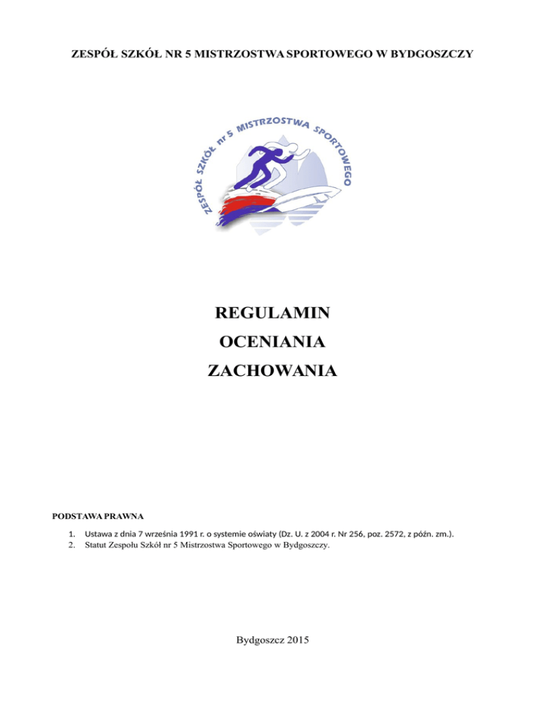 ZESPÓŁ SZKÓŁ NR 5 MISTRZOSTWA SPORTOWEGO W BYDGOSZCZY REGULAMIN OCENIANIA ZACHOWANIA PODSTAWA PRAWNA 1. 2. Ustawa z dnia 7 września 1991 r. o systemie oświaty (Dz. U. z 2004 r. Nr 256, poz. 2572, z późn. zm.). Statut Zespołu Szkół nr 5 Mistrzostwa Sportowego w Bydgoszczy. Bydgoszcz 2015 Rozdział 1 Zasady ustalania oceny zachowania § 1. Klasyfikacja śródroczna polega na okresowym podsumowaniu zachowania ucznia oraz ustaleniu śródrocznej oceny klasyfikacyjnej zachowania. Klasyfikację śródroczną uczniów przeprowadza się co najmniej raz w ciągu roku szkolnego. § 2. Klasyfikacja roczna polega na podsumowaniu zachowania ucznia w danym roku szkolnym oraz ustaleniu rocznej oceny klasyfikacyjnej zachowania. § 3. 1. Ocena zachowania ucznia wyraża opinię Szkoły o funkcjonowaniu ucznia w środowisku szkolnym, respektowaniu przez niego zasad współżycia społecznego oraz ogólnie przyjętych norm etycznych. W szczególności uwzględnia: 1) wywiązywanie się z obowiązków ucznia, 2) postępowanie zgodne z dobrem społeczności szkolnej, 3) dbałość o honor i tradycje Szkoły, 4) dbałość o piękno mowy ojczystej, 5) dbałość o bezpieczeństwo i zdrowie własne oraz innych osób, 6) godne, kulturalne zachowanie się w szkole i poza nią, 7) okazywanie szacunku innym osobom. § 4. 1. Ocena zachowania nie ma wpływu na: 1) oceny z zajęć edukacyjnych, 2) promocję do klasy programowo wyższej i ukończenie Szkoły. § 5. 1. Ocenę zachowania ucznia ustala wychowawca klasy w sposób holistyczny (całościowy) na podstawie wyznaczników: 1) szczegółowe kryteria ocen zachowania, 2) opinię o zachowaniu ucznia, 3) ocenę i samoocenę uczniów, 4) uwagi i informacje nauczycieli zawarte w karcie uwag w dzienniku lekcyjnym danej klasy. § 6. Wychowawca klasy na początku roku szkolnego informuje uczniów i rodziców o warunkach i sposobie oraz kryteriach oceniania zachowania, warunkach i trybie uzyskania wyższej niż przewidywana rocznej oceny klasyfikacyjnej zachowania oraz o skutkach ustalenia uczniowi nagannej rocznej oceny klasyfikacyjnej zachowania. § 7. Przed rocznym klasyfikacyjnym zebraniem plenarnym rady pedagogicznej wychowawca klasy jest obowiązany poinformować ucznia i jego rodziców (prawnych opiekunów) o przewidywanej dla niego rocznej ocenie klasyfikacyjnej zachowania, w terminie i formie określonych w statucie Szkoły. § 8. Ustalona przez wychowawcę klasy roczna ocena zachowania jest ostateczna z zastrzeżeniem § 17. 2 § 9. Na prośbę ucznia lub jego rodziców (prawnych opiekunów) wychowawca ustalający ocenę powinien ją uzasadnić. § 10. Uczniowi spełniającemu obowiązek szkolny lub obowiązek nauki poza Szkołą, zdającemu egzamin klasyfikacyjny, nie ustala się oceny zachowania. § 11. Uczniowi reprezentującemu Szkołę na zawodach, olimpiadach, konkursach oraz obecnemu na obowiązkowych okresowych badaniach lekarskich w Przychodni SportowoLekarskiej (obecność na badaniach dotyczy uczniów Gimnazjum nr 54 MS i XX Liceum Ogólnokształcącego MS) zaznacza się nieobecność wpisując w dzienniku lekcyjnym „zw” (zwolniony), a w elektronicznym dzienniku lekcyjnym „ns” i nie liczy się jako nieobecności. § 12. 1. Zachowanie ucznia ocenia się według następującej skali: 1) wzorowe, 2) bardzo dobre, 3) dobre, 4) poprawne, 5) nieodpowiednie, 6) naganne. § 13. Uczeń, który w ciągu semestru otrzymał naganę wychowawcy klasy, nie może otrzymać oceny semestralnej wyższej niż dobra. § 14. Uczeń, który w ciągu semestru otrzymał naganę dyrektora Szkoły, nie może otrzymać oceny semestralnej wyższej niż poprawna. § 15. W przypadku, gdy uczeń jest sprawcą czynu karalnego lub przestępstwa otrzymuje ocenę naganną z pominięciem skali ocen. Rozdział 2 Szczegółowe kryteria ocen zachowania § 16. Aby otrzymać jedną z ocen wymienionych w § 14, uczeń musi spełniać większość zawartych poniżej kryteriów: 1. Ocenę wzorową otrzymuje uczeń, który: 1) jest przygotowany do zajęć zgodnie ze swoimi możliwościami; wyróżnia się wkładem pracy i szczególną aktywnością, 2) może posiadać pojedyncze godziny nieusprawiedliwione oraz spóźnienia, 3) wyróżnia się wysoką kulturą osobistą; dba o estetyczny i schludny wygląd; jest zawsze ubrany stosownie do okoliczności, 4) jest tolerancyjny – szanuje poglądy, przekonania i godność osobistą drugiego człowieka, jest życzliwy i otwarty na potrzeby innych, 5) dotrzymuje terminów, wywiązuje się z powierzonych mu zadań; nie ulega nałogom i nie namawia do nich innych; reaguje na nieodpowiedzialne zachowania, 6) przestrzega Statutu Szkoły i obowiązujących regulaminów, stosuje się do zaleceń i zarządzeń nauczycieli i dyrekcji Szkoły, 3 7) wyróżnia się inicjatywą i aktywnością w pracy na rzecz Szkoły i klasy; służy pomocą koleżankom i kolegom; potrafi współpracować w zespole, 8) pracuje nad własnym rozwojem; osiąga znaczące sukcesy w konkursach, olimpiadach i zawodach. 2. Ocenę bardzo dobrą otrzymuje uczeń, który: 1) rzetelnie przygotowuje się do zajęć szkolnych, 2) sporadycznie spóźnia się na zajęcia i opuszcza nie więcej niż 5 godzin w semestrze bez usprawiedliwienia, 3) odznacza się wysoką kulturą osobistą, 4) jest tolerancyjny i szanuje poglądy innych, 5) wywiązuje się z powierzonych mu zadań; nie ulega nałogom, 6) przestrzega Statutu Szkoły i obowiązujących regulaminów; stosuje się do zarządzeń, 7) aktywnie uczestniczy w życiu klasy i Szkoły; potrafi działać w zespole, 8) reprezentuje klasę lub Szkołę w konkursach, zawodach, imprezach artystycznych. 3. Ocenę dobrą otrzymuje uczeń, który: 1) jest przygotowany do zajęć, 2) opuścił nie więcej niż 15 godzin w semestrze bez usprawiedliwienia, sporadycznie się spóźnia, 3) jego kultura osobista i dbałość o piękno języka nie budzą zastrzeżeń; jest taktowny, panuje nad emocjami; dba o estetykę własnego wyglądu, 