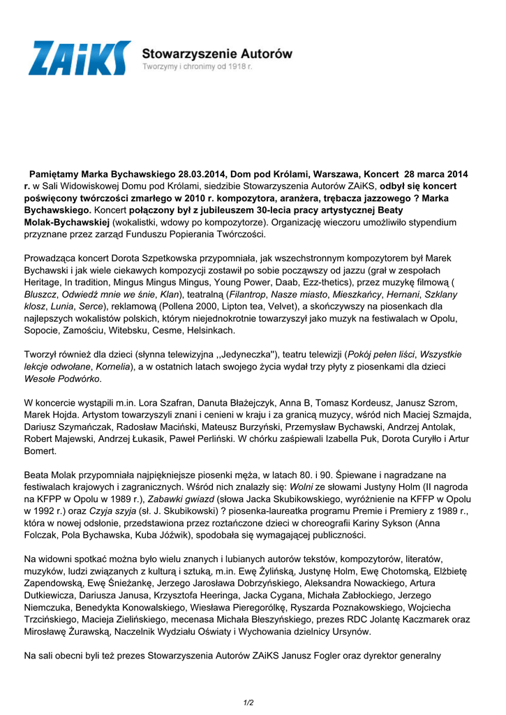 Pamiętamy Marka Bychawskiego 28.03.2014, Dom pod Królami, Warszawa, Koncert 28 marca 2014 r. w Sali Widowiskowej Domu pod Królami, siedzibie Stowarzyszenia Autorów ZAiKS, odbył się koncert poświęcony twórczości zmarłego w 2010 r. kompozytora, aranżera, trębacza jazzowego ? Marka Bychawskiego. Koncert połączony był z jubileuszem 30-lecia pracy artystycznej Beaty Molak-Bychawskiej (wokalistki, wdowy po kompozytorze). Organizację wieczoru umożliwiło stypendium przyznane przez zarząd Funduszu Popierania Twórczości. Prowadząca koncert Dorota Szpetkowska przypomniała, jak wszechstronnym kompozytorem był Marek Bychawski i jak wiele ciekawych kompozycji zostawił po sobie począwszy od jazzu (grał w zespołach Heritage, In tradition, Mingus Mingus Mingus, Young Power, Daab, Ezz-thetics), przez muzykę filmową ( Bluszcz, Odwiedź mnie we śnie, Klan), teatralną (Filantrop, Nasze miasto, Mieszkańcy, Hernani, Szklany klosz, Lunia, Serce), reklamową (Pollena 2000, Lipton tea, Velvet), a skończywszy na piosenkach dla najlepszych wokalistów polskich, którym niejednokrotnie towarzyszył jako muzyk na festiwalach w Opolu, Sopocie, Zamościu, Witebsku, Cesme, Helsinkach. Tworzył również dla dzieci (słynna telewizyjna ,,Jedyneczka''), teatru telewizji (Pokój pełen liści, Wszystkie lekcje odwołane, Kornelia), a w ostatnich latach swojego życia wydał trzy płyty z piosenkami dla dzieci Wesołe Podwórko. W koncercie wystąpili m.in. Lora Szafran, Danuta Błażejczyk, Anna B, Tomasz Kordeusz, Janusz Szrom, Marek Hojda. Artystom towarzyszyli znani i cenieni w kraju i za granicą muzycy, wśród nich Maciej Szmajda, Dariusz Szymańczak, Radosław Maciński, Mateusz Burzyński, Przemysław Bychawski, Andrzej Antolak, Robert Majewski, Andrzej Łukasik, Paweł Perliński. W chórku zaśpiewali Izabella Puk, Dorota Curyłło i Artur Bomert. Beata Molak przypomniała najpiękniejsze piosenki męża, w latach 80. i 90. Śpiewane i nagradzane na festiwalach krajowych i zagranicznych. Wśród nich znalazły się: Wolni ze słowami Justyny Holm (II nagroda na KFPP w Opolu w 1989 r.), Zabawki gwiazd (słowa Jacka Skubikowskiego, wyróżnienie na KFFP w Opolu w 1992 r.) oraz Czyja szyja (sł. J. Skubikowski) ? piosenka-laureatka programu Premie i Premiery z 1989 r., która w nowej odsłonie, przedstawiona przez roztańczone dzieci w choreografii Kariny Sykson (Anna Folczak, Pola Bychawska, Kuba Jóźwik), spodobała się wymagającej publiczności. Na widowni spotkać można było wielu znanych i lubianych autorów tekstów, kompozytorów, literatów, muzyków, ludzi związanych z kulturą i sztuką, m.in. Ewę Żylińską, Justynę Holm, Ewę Chotomską, Elżbietę Zapendowską, Ewę Śnieżankę, Jerzego Jarosława Dobrzyńskiego, Aleksandra Nowackiego, Artura Dutkiewicza, Dariusza Janusa, Krzysztofa Heeringa, Jacka Cygana, Michała Zabłockiego, Jerzego Niemczuka, Benedykta Konowalskiego, Wiesława Pieregorólkę, Ryszarda Poznakowskiego, Wojciecha Trzcińskiego, Macieja Zielińskiego, mecenasa Michała Błeszyńskiego, prezes RDC Jolantę Kaczmarek oraz Mirosławę Żurawską, Naczelnik Wydziału Oświaty i Wychowania dzielnicy Ursynów. Na sali obecni byli też prezes Stowarzyszenia Autorów ZAiKS Janusz Fogler oraz dyrektor generalny 1/2 Stowarzyszenia Krzysztof Lewandowski. Podczas koncertu przyjaciele państwa Bychawskich ? m.in. Elżbieta Zapendowska, Justyna Holm, Jacek Cygan, Michał Zabłocki, Tomasz Kordeusz, Jerzy Niemczuk ? podzielili się wspomnieniami o Marku i Beacie. Dzięki ich ciepłym słowom impreza nabrała kameralnego (choć na widowni było niemal 250 osób) i rodzinnego charakteru. Warto wspomnieć, że klimat koncertu to również zasługa Zbigniewa Redo i jego firmy Eurosound Production, która zajęła się nagłośnieniem i zadbała o to, by każdy artysta dobrze czuł się na scenie w feerii kolorowych świateł! Wieczór zamknął prezes SAWP Ryszard Poznakowski, wespół z Ewą Śnieżanką wręczając Beacie Molak symboliczną statuetkę SAWP-u z okazji 30-lecia pracy artystycznej, której towarzyszył olbrzymi bukiet kwiatów. Po koncercie Ryszard Poznakowski napisał: ,,Rewelacyjny, wzruszający i niepowtarzalny show. Dawno nie widziałem na scenie tylu zawodowców...'', a Jacek Cygan w liście do Beaty Molak dodał: ,,...zrobiłaś coś wspaniałego ? zebrałaś ludzi, którzy dziś w zasadzie nie mają powodu się spotykać, bo świat, w którym tworzyli, grali i śpiewali już nie funkcjonuje. A jednak pokazali, że istnieją, że mogą, że są w świetnej formie...''. na zdjęciu (od lewej):Andrzej Łukasik (kontrabas), Robert Majewski (trąbka), Andrzej Antolak(saxofon); fot.Bartek Wileński na zdjęciu: Jerzy Niemczuk (literat); na drugim planie Robert Majewski (trąbka); fot.Bartek Wileński na zdjęciu: Michał Zabłocki (poeta), na drugim planie Izabella Puk (chórek); fot.Bartek Wileński na zdjęciu: Beata Molak-ze statuetką SAWP (30-lecie pracy artystycznej); fot. Bartek Wileński na zdjęciu: Beata Molak; na drugim planie Robert Majewski-trąbka; fot.Waldemar Folczak na zdjęciu (od lewej): Ania Folczak, Kuba Jóżwik, Pola Bychawska; fot.Waldemar Folczak ? wróć do listy wydarzeń Wszelkie prawa zastrzeżone 2017 ZAiKS / data wygenerowania strony 04.03.2017 03:00:27 PDF ze strony: http://zaiks.org.pl/wydarzenia,232 2/2