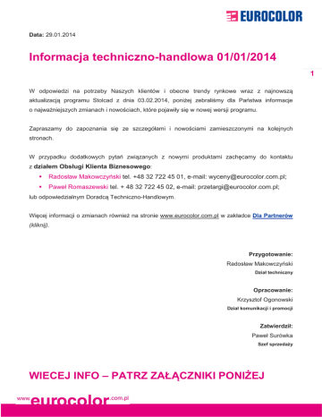 Data: 29.01.2014 Informacja techniczno-handlowa 01/01/2014 | 11 W odpowiedzi na potrzeby Naszych klientów i obecne trendy rynkowe wraz z najnowszą aktualizacją programu Stolcad z dnia 03.02.2014, poniżej zebraliśmy dla Państwa informacje o najważniejszych zmianach i nowościach, które pojawiły się w nowej wersji programu. Zapraszamy do zapoznania się ze szczegółami i nowościami zamieszczonymi na kolejnych stronach. W przypadku dodatkowych pytań związanych z nowymi produktami zachęcamy do kontaktu z działem Obsługi Klienta Biznesowego: Radosław Makowczyński tel. +48 32 722 45 01, e-mail: [email protected]; Paweł Romaszewski tel. + 48 32 722 45 02, e-mail: [email protected]; lub odpowiedzialnym Doradcą Techniczno-Handlowym. Więcej informacji o zmianach również na stronie www.eurocolor.com.pl w zakładce Dla Partnerów (kliknij). Przygotowanie: Radosław Makowczyński Dział techniczny Opracowanie: Krzysztof Ogonowski Dział komunikacji i promocji Zatwierdził: Paweł Surówka Szef sprzedaży WIECEJ INFO – PATRZ ZAŁĄCZNIKI PONIŻEJ [PROMOCJE] 1. [Technologie GLOBAL Special, NOVEL Special, EFEKTIV Special] Technologie Specjalne GLOBAL Special, NOVEL Special, EFEKTIV Special przedłużono do 31.03.2014. [MODYFIKACJE PRODUKTOWE] 1. [Wszystkie technologie REHAU] Zmodyfikowano wyboru dostępnych kolorów. Zmiana: Obecnie w programie Stolcad widoczne są kolory dostępne na stanach magazynowych firmy Rehau, wszystkie pozostałe kolory pozastandardowe oznaczone zostały jako „INNY KOLOR” (zgodnie z poniższą ilustracją). Wyceny dostępne są na zapytanie ze względu na optymalizacje cen i chęć przedstawienia najlepszej oferty specjalnej. Chcąc otrzymać wyceny i terminy realizacji kolorów pozastandardowych prosimy o kontakt z działem Obsługi Klienta Biznesowego i Wycen: tel. +48 32 722 45 01 - 02, e-mail: [email protected]. | 22 Skrócono terminy realizacji wybranych produktów w kategoriach Okna, Drzwi, PSK w technologiach Rehau (szczegółowe terminy w programie Stolcad). We wszystkich systemach Rehau zmieniono sposób doboru uszczelki. W chwili obecnej wybór uszczelki dostępny jest z poziomu funkcji Parametr (prawy przycisk myszy na pulpicie). Do wyboru są: - uszczelka szara: tylko dla okien białych - uszczelka czarna: dla konstrukcji białych i okleinowanych jedno- i obustronnie. 2. [Technologia ENERGETIC Okna] Dodano 2 nowe elementy: słupek stały 112 mm i słupek ruchomy ślepy. 3. [Technologia NOVEL Okna, PSK] Dodano listwę 9 mm okrągłą przeznaczoną do pakietów 38 mm (pakiet dwukomorowy U=0,8 na szybach 6 mm). 4. [Technologie Drzwi PVC i ALU] W technologiach drzwiowych PVC i ALU zmieniono niektóre z parametrów oraz dodano nowe pochwyty, klamki (szczegóły poniżej oraz w programie Stolcad). | 33 5. [Technologie GLOBAL Drzwi, ENERGO+ Drzwi, NOVEL Drzwi, DUOTHERM Drzwi] W technologiach drzwiowych PVC dodano 5-cio punkową zasuwnicę GU-Automat i GU-MR. | 44 zasuwnica 5-cio punktowa GU-Automat zasuwnica 5-cio punktowa GU-MR 6. [Technologie NOVEL Okna, DUOTHERM Okna] Zoptymalizowano niektóre z procesów technologicznych w zakresie doboru uszczelek i wzmocnień co wpłynie na drobne zmiany ceny wybranych konstrukcji okiennych. 7. [Wszystkie technologie ALU Ponzio] Obniżono cen większoś kszości produktów ALU Ponzio w wyniku optymalizacji procesu produkcji w EUROCOLOR. Wprowadzono do palety kolorów – kolor Bicolor (możliwość lakierowania strony zewn zewnętrznej i wewnętrznej trznej profilu na dwa różne kolory). Przesunięto do palety kolorów standardowych (cena jak dla koloru białego RAL 9016) następujące odcienie: szary RAL 7001, 7001 antracyt RAL 7016, brąz ąz RAL 8017 8017, brąz RAL 8019, srebrny 9006B. Terminy realizacji zgodnie z terminami ustalonymi w programie Stolcad. szary RAL 7001 antracyt RAL 7016 brąz RAL 8017 brązz RAL 8019 srebrny RAL 9006B Poprawiono i zaktualizowano nazwy systemów ALU na aktualnie obowiązujące obowi (np. NT-50 na PT-50). 8. [Technologia PT-78] Wprowadzono skrzydła drzwi: drzwi - otwieranych do wewnątrz ątrz - otwieranych na zewnątrz ątrz - do paneli nakładkowych w wersji bez kopnika. skrzydło otwierane do wewnątrz bez kopnika skrzydło otwierane na zewn zewnątrz bez kopnika 9. [Wszystkie technologie Heroal] W systemach ALU Heroal wprowadzono nowe listwy przyszybowe, poszerzenia, łączniki ł i garnitury okuciowe (szczegóły w programie Stolcad). | 55 10. [System Heroal ES90S Drzwi] Zmieniono nazwę systemu drzwi ALU Heroal ES90S na Heroal 82, obecna nazwa technologii w programie Stolacd to: Heroal 82 Drzwi ˂Aluminium˃. 11. [Technologia rolet MaxTherm] Wprowadzono 2 kolory okleinowane: złoty dąb i orzech włoski elementów rolety MaxTherm: prowadnice, klapa rewizyjna, adapter. 12. [Szkło] Wprowadzono kilka nowych pakietów szybowych, min.: - 1-kom. laminowane 30 mm: 1,0 SS 33.2/33.2 CE211 - 1-kom. laminowane 32 mm: 1,0 SS 33.2/44.2 CE212 - 2-kom. laminowane 38 mm: 0,7 SS 33.2 Z CE213 - 2-kom. laminowane 42 mm: 0,7 SS 33.2 X3 CE213. [ROZBUDOWA OBECNEJ OFERTY] 1. [Panele drzwiowe EUROCOLOR] / (stolarka PVC) Zmiana: dodano do obecnie dostępnych wypełnień drzwiowych EUROCOLOR, panele o grubości 24 mm [ 2 mm (HPL)/ 20 mm (XPS)/ 2 mm HPL ] w bardzo atrakcyjnej cenie. Wzory dostępnych wypełnień pozostają nie zmienione. | 66 [WPROWADZENIE NOWYCH PRODUKTÓW] 1. [Nakładki ALU-TOP] / (technologia ENERGO+ i ENERGETIC) Dostępność: z poziomu funkcji Parametr (prawy przycisk myszy). Nakładki ALU-TOP: umożliwiają połączenie atrakcyjnego wyglądu aluminium z technicznymi zaletami profili z PVC, zapewniając niemal nieograniczony wybór kolorów doskonale komponują się z fasadami z ALU, stanowiąc doskonałą alternatywę dla okien aluminiowych indywidualny dobór kolorystyki zgodnie z szeroką paletą kolorów RAL lakierowana powierzchnia zewnętrzna jest bardzo łatwa w pielęgnacji, będąc odporną na warunki pogodowe i upływający czas nakładki aluminiowe ALU-