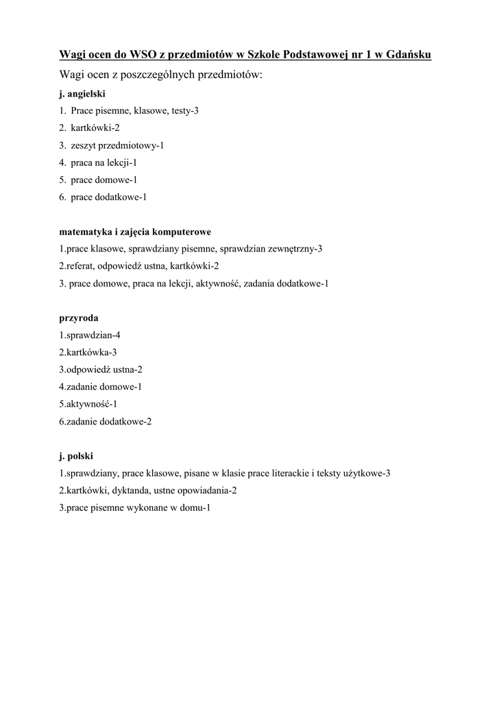 Wagi ocen do WSO z przedmiotów w Szkole Podstawowej nr 1 w Gdańsku Wagi ocen z poszczególnych przedmiotów: j. angielski 1. Prace pisemne, klasowe, testy-3 2. kartkówki-2 3. zeszyt przedmiotowy-1 4. praca na lekcji-1 5. prace domowe-1 6. prace dodatkowe-1 matematyka i zajęcia komputerowe 1.prace klasowe, sprawdziany pisemne, sprawdzian zewnętrzny-3 2.referat, odpowiedź ustna, kartkówki-2 3. prace domowe, praca na lekcji, aktywność, zadania dodatkowe-1 przyroda 1.sprawdzian-4 2.kartkówka-3 3.odpowiedź ustna-2 4.zadanie domowe-1 5.aktywność-1 6.zadanie dodatkowe-2 j. polski 1.sprawdziany, prace klasowe, pisane w klasie prace literackie i teksty użytkowe-3 2.kartkówki, dyktanda, ustne opowiadania-2 3.prace pisemne wykonane w domu-1