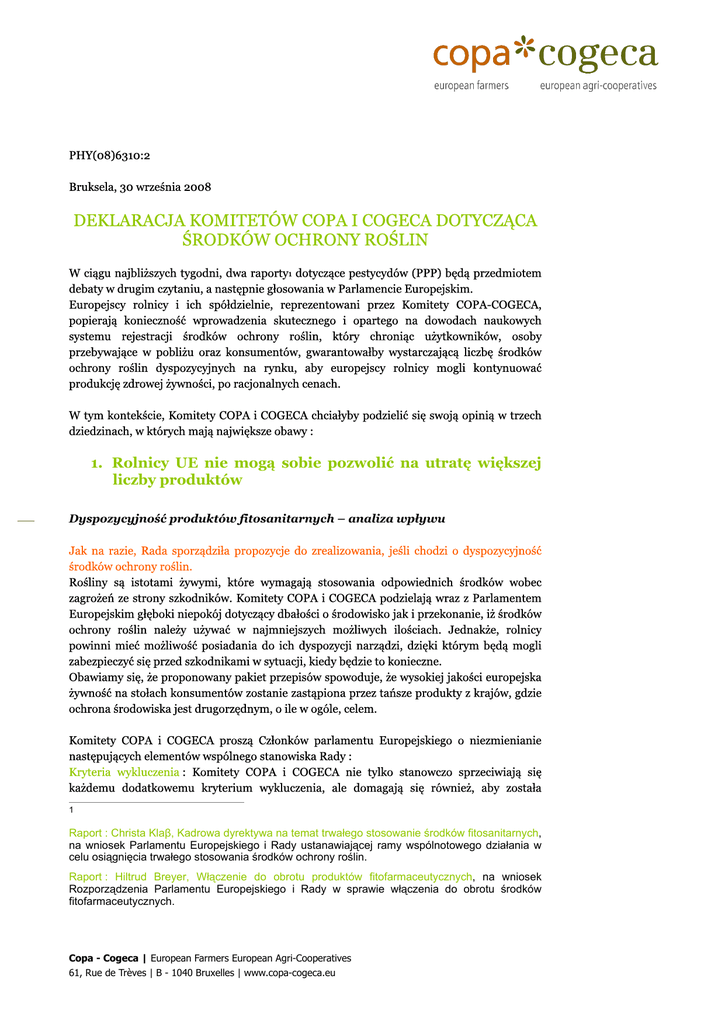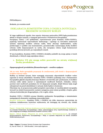 PHY(08)6310:2 Bruksela, 30 września 2008 DEKLARACJA KOMITETÓW COPA I COGECA DOTYCZĄCA ŚRODKÓW OCHRONY ROŚLIN W ciągu najbliższych tygodni, dwa raporty1 dotyczące pestycydów (PPP) będą przedmiotem debaty w drugim czytaniu, a następnie głosowania w Parlamencie Europejskim. Europejscy rolnicy i ich spółdzielnie, reprezentowani przez K omitety COPA-COGECA, popierają konieczność wprowadzenia skutecznego i opartego na dowodach naukowych systemu rejestracji środków ochrony roślin, który chroniąc użytkowników, osoby przebywające w pobliżu oraz konsumentów, gwarantowałby wystarczającą liczbę środków ochrony roślin dyspozycyjnych na rynku, aby europejscy rolnicy mogli kontynuować produkcję zdrowej żywności, po racjonalnych cenach. W tym kontekście, Komitety COPA i COGECA chciałyby podzielić się swoją opinią w trzech dziedzinach, w których mają największe obawy : 1. Rolnicy UE nie mogą sobie pozwolić na utratę większej liczby produktów Dyspozycyjność produktów fitosanitarnych – analiza wpływu Jak na razie, Rada sporządziła propozycje do zrealizowania, jeśli chodzi o dyspozycyjność środków ochrony roślin. Rośliny są istotami żywymi, które wymagają stosowania odpowiednich środków wobec zagrożeń ze strony szkodników. Komitety COPA i COGECA podzielają wraz z Parlamentem Europejskim głęboki niepokój dotyczący dbałości o środowisko jak i przekonanie, iż środków ochrony roślin należy używać w najmniejszych możliwych ilościach. Jednakże, rolnicy powinni mieć możliwość posiadania do ich dyspozycji narządzi, dzięki którym będą mogli zabezpieczyć się przed szkodnikami w sytuacji, kiedy będzie to konieczne. Obawiamy się, że proponowany pakiet przepisów spowoduje, że wysokiej jakości europejska żywność na stołach konsumentów zostanie zastąpiona przez tańsze produkty z krajów, gdzie ochrona środowiska jest drugorzędnym, o ile w ogóle, celem. K omitety COPA i COGECA proszą Członków parlamentu Europejskiego o niezmienianie następujących elementów wspólnego stanowiska Rady : K ryteria wykluczenia : K omitety COPA i COGECA nie tylko stanowczo sprzeciwiają się każdemu dodatkowemu kryterium wykluczenia, ale domagają się również, aby została 1 Raport : Christa Klaβ, Kadrowa dyrektywa na temat trwałego stosowanie środków fitosanitarnych, na wniosek Parlamentu Eu ropejskiego i Rady u stanawiającej ramy wspólnotowego działania w celu osiągnięcia trwałego stosowania środków ochrony roślin. Raport : Hiltrud Breyer, Włączenie do obrotu produ któw fitofarmaceutycznych, na wniosek Rozporządzenia Parlamentu Eu ropejskiego i Rady w sprawie włączenia do obrotu środków fitofarmaceutycznych. Copa - Cogeca | European Farmers European Agri-Cooperatives 61, Rue de Trèves | B - 1040 Bruxelles | www.copa-cogeca.eu przeprowadzona analiza wpływu na poziomie wspólnotowym. Takie kwestie, jak zmniejszenie wydajności rolnej, potencjalne efekty na cenach i dyspozycyjność żywności, czy też jeszcze wpływ na import żywności, wobec której stosowane są zakazane przez tą legislację środki ochrony roślin, będą musiały być wzięte pod uwagę. Zezwolenie prowizoryczne : pozwala to na szybszy dostęp do rynku nowych produktów, które będą jeszcze ważniejsze, w momencie, gdy stare produkty zostaną wykluczone. Ustępstwo na 5 lat : ustępstwo to zostało włączone do wspólnego stanowiska Rady i pozwoli niektórych substancjom na pozostanie na rynku, podczas gdy odpowiadają one kryteriom wyłączenia o ile żadna alternatywna metoda kontroli nie istnieje oraz w przypadku duże zagrożenia dla zdrowia roślin. W pełni popieramy to ustępstwo. Zezwolenia strefowe : strategia ta idzie w kierunku jednolitego rynku oraz w kierunku wolnego przepływu pestycydów, europejscy rolnicy są z tego zadowoleni. Powinno to polepszyć kwestię dyspozycyjności pestycydów w Unii Europejskiej. Wspólne uznanie : K omitety COPA i COGECA są obrońcami automatycznego wspólnego uznania wewnątrz strefy oraz gwarancji, aby to uznanie było możliwe w innych strefach. Wydaje się to szczególnie ważne dla krajów, które czują się bliższe strefy sąsiedniej ze względu na klimat, niż strefy, w której zostały umieszczone. Strefy zaprawy nasion : chodzi tutaj również o ukierunkowanie się na jednolity rynek w celu zapewnienia wolnego przepływu pestycydów, czego chciałyby Komitety COPA i COGECA. Handel równoległy : praktyczne środki przeznaczone na korzyść handlu równoległego umożliwiłyby szybszy dostęp do środków ochrony roślin oraz faworyzowałyby one proces harmonizacji. Wzmocniona ochrona danych dla zastosowań o mniejszym znaczeniu : uprawy o mniejszym znaczeniu, które reprezentują większość upraw w UE, będą najbardziej dotknięte przez te propozycje, zważywszy na fakt, iż już istnieją duże braki w gamie dyspozycyjnych środków ochrony roślin dla tych upraw. To właśnie z tego powodu producenci nie mogą sobie pozwolić na rozwój środków ochrony roślin dla upraw o mniejszym znaczeniu. Wzmocnienie ochrony danych wydaje się być dobrym sposobem dla osiągnięcia celu. Finansowanie mniejszych zastosowań: Komitety COPA i COGECA proszą również Parlament Europejski o ponowne przejrzenie finansowania mniejszych zastosowań. Oprócz wzmocnienia ochrony danych, K omitety COPA i COGECA popierają koncept utworzenia funduszu przeznaczonego na finansowanie wstępnych testów dla upraw o mniejszym, znaczeniu, zważywszy na fakt, iż sytuacja w poszczególnych krajach Unii Europejskiej nie jest równa i że w niektórych krajach, takich jak Wielka Brytania, wsparcie finansowe ze strony rządu nie istnieje. Ograniczenie stosowania środków ochrony roślin, w zależności od ryzyka Na obecny moment, wspólne stanowisko Rady uzgadnia, że K raje Członkowskie mogły przyjąć krajowe plany działania w celu zdefiniowania celów, środków i terminów, ab