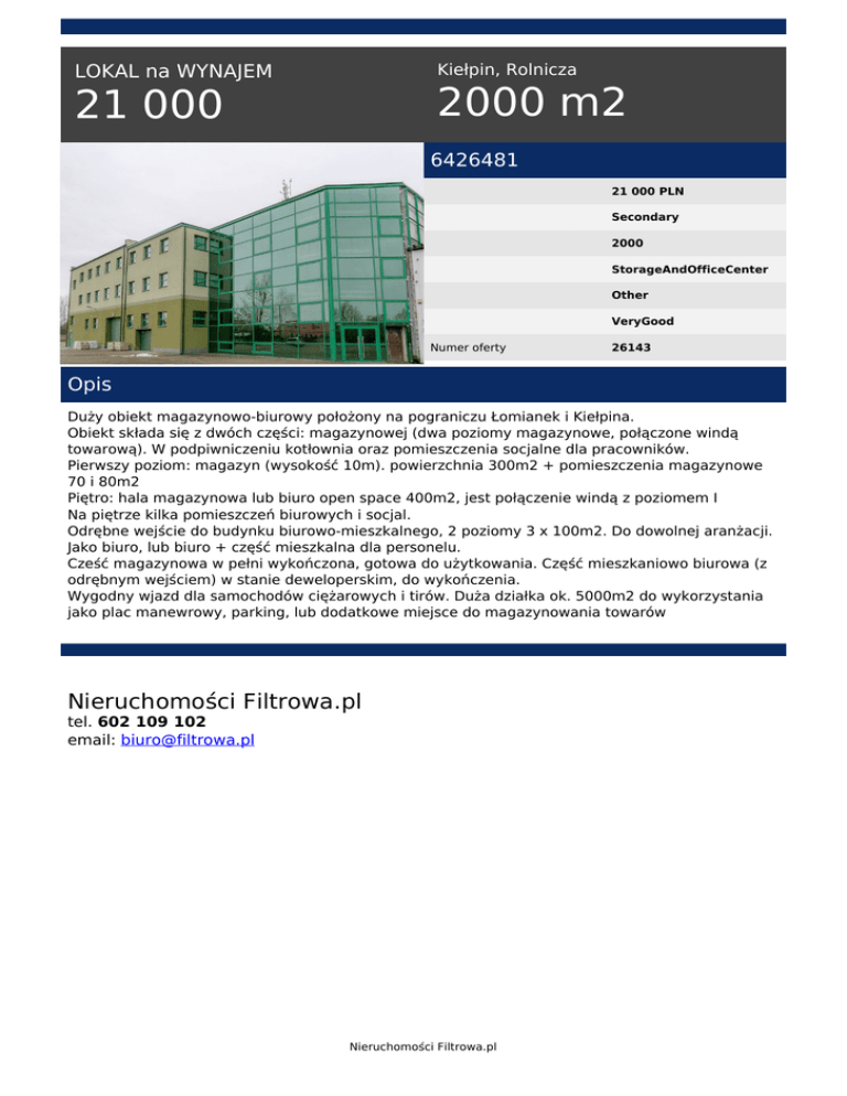 Kiełpin, Rolnicza LOKAL na WYNAJEM 2000 m2 21 000 6426481 21 000 PLN Secondary 2000 StorageAndOfficeCenter Other VeryGood Numer oferty 26143 Opis Duży obiekt magazynowo-biurowy położony na pograniczu Łomianek i Kiełpina. Obiekt składa się z dwóch części: magazynowej (dwa poziomy magazynowe, połączone windą towarową). W podpiwniczeniu kotłownia oraz pomieszczenia socjalne dla pracowników. Pierwszy poziom: magazyn (wysokość 10m). powierzchnia 300m2 + pomieszczenia magazynowe 70 i 80m2 Piętro: hala magazynowa lub biuro open space 400m2, jest połączenie windą z poziomem I Na piętrze kilka pomieszczeń biurowych i socjal. Odrębne wejście do budynku biurowo-mieszkalnego, 2 poziomy 3 x 100m2. Do dowolnej aranżacji. Jako biuro, lub biuro + część mieszkalna dla personelu. Cześć magazynowa w pełni wykończona, gotowa do użytkowania. Część mieszkaniowo biurowa (z odrębnym wejściem) w stanie deweloperskim, do wykończenia. Wygodny wjazd dla samochodów ciężarowych i tirów. Duża działka ok. 5000m2 do wykorzystania jako plac manewrowy, parking, lub dodatkowe miejsce do magazynowania towarów Nieruchomości Filtrowa.pl tel. 602 109 102 email: [email protected] Nieruchomości Filtrowa.pl Powered by TCPDF (www.tcpdf.org)