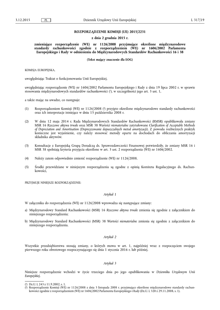 3.12.2015 Dziennik Urzędowy Unii Europejskiej PL L 317/19 ROZPORZĄDZENIE KOMISJI (UE) 2015/2231 z dnia 2 grudnia 2015 r. zmieniające rozporządzenie (WE) nr 1126/2008 przyjmujące określone międzynarodowe standardy rachunkowości zgodnie z rozporządzeniem (WE) nr 1606/2002 Parlamentu Europejskiego i Rady w odniesieniu do Międzynarodowych Standardów Rachunkowości 16 i 38 (Tekst mający znaczenie dla EOG) KOMISJA EUROPEJSKA, uwzględniając Traktat o funkcjonowaniu Unii Europejskiej, uwzględniając rozporządzenie (WE) nr 1606/2002 Parlamentu Europejskiego i Rady z dnia 19 lipca 2002 r. w sprawie stosowania międzynarodowych standardów rachunkowości (1), w szczególności jego art. 3 ust. 1, a także mając na uwadze, co następuje: (1) Rozporządzeniem Komisji (WE) nr 1126/2008 (2) przyjęto określone międzynarodowe standardy rachunkowości oraz ich interpretacje istniejące w dniu 15 października 2008 r. (2) W dniu 12 maja 2014 r. Rada Międzynarodowych Standardów Rachunkowości (RMSR) opublikowała zmiany MSR 16 Rzeczowe aktywa trwałe oraz MSR 38 Wartości niematerialne zatytułowane Clarification of Acceptable Methods of Depreciation and Amortisation (Doprecyzowanie dopuszczalnych metod amortyzacji). Z powodu rozbieżnych praktyk konieczne jest wyjaśnienie, czy należy stosować metody oparte na dochodach do obliczania amortyzacji składnika aktywów. (3) Konsultacje z Europejską Grupą Doradczą ds. Sprawozdawczości Finansowej potwierdziły, że zmiany MSR 16 i MSR 38 spełniają kryteria przyjęcia określone w art. 3 ust. 2 rozporządzenia (WE) nr 1606/2002. (4) Należy zatem odpowiednio zmienić rozporządzenie (WE) nr 1126/2008. (5) Środki przewidziane w niniejszym rozporządzeniu są zgodne z opinią Komitetu Regulacyjnego ds. Rachun kowości, PRZYJMUJE NINIEJSZE ROZPORZĄDZENIE: Artykuł 1 W załączniku do rozporządzenia (WE) nr 1126/2008 wprowadza się następujące zmiany: a) Międzynarodowy Standard Rachunkowości (MSR) 16 Rzeczowe aktywa trwałe zmienia się zgodnie z załącznikiem do niniejszego rozporządzenia; b) Międzynarodowy Standard Rachunkowości (MSR) 38 Wartości niematerialne zmienia się zgodnie z załącznikiem do niniejszego rozporządzenia. Artykuł 2 Wszystkie przedsiębiorstwa stosują zmiany, o których mowa w art. 1, najpóźniej wraz z rozpoczęciem swojego pierwszego roku obrotowego rozpoczynającego się dnia 1 stycznia 2016 r. lub później. Artykuł 3 Niniejsze rozporządzenie wchodzi w życie trzeciego dnia po jego opublikowaniu w Dzienniku Urzędowym Unii Europejskiej. (1) Dz.U. L 243 z 11.9.2002, s. 1. (2) Rozporządzenie Komisji (WE) nr 1126/2008 z dnia 3 listopada 2008 r. przyjmujące określone międzynarodowe standardy rachun kowości zgodnie z rozporządzeniem (WE) nr 1606/2002 Parlamentu Europejskiego i Rady (Dz.U. L 320 z 29.11.2008, s. 1). L 317/20 PL Dziennik Urzędowy Unii Europejskiej Niniejsze rozporządzenie wiąże w całości i jest bezpośrednio stosowane we wszystkich państwach członkowskich. Sporządzono w Brukseli dnia 2 grudnia 2015 r. W imieniu Komisji Jean-Claude JUNCKER Przewodniczący 3.12.2015 3.12.2015 PL Dziennik Urzędowy Unii Europejskiej L 317/21 ZAŁĄCZNIK Wyjaśnienie dopuszczalnych metod amortyzacji (zmiany MSR 16 i MSR 38) Zmiany MSR 16 Rzeczowe aktywa trwałe Paragraf 56 został zmieniony oraz dodano paragrafy 62 A i 81I. Paragrafy 60–62 nie zostały zmienione, ale włączono je dla ułatwienia orientacji. Wartość podlegająca amortyzacji i okres amortyzacji … 56. Korzyści ekonomiczne pochodzące ze składnika aktywów konsumowane są przez jednostkę gospodarczą przede wszystkim w drodze użytkowania składnika aktywów. Jednakże inne czynniki, takie jak technologiczna i operacyjna utrata przydatności i zużycie związane z niewykorzystywaniem składnika aktywów, często powodują zmniejszenie oczekiwanych korzyści ekonomicznych ze składnika aktywów. W związku z tym, ustalając okres użytkowania składnika aktywów, należy wziąć pod uwagę wszystkie następujące czynniki: a) … c) technologiczną lub rynkową utratę przydatności wynikającą ze zmian lub udoskonaleń produkcji, lub ze zmian popytu na dany produkt lub na daną usługę, do wytworzenia których wykorzystywany jest dany składnik aktywów. Oczekiwane przyszłe obniżki ceny sprzedaży towaru wyprodukowanego przy użyciu danego składnika aktywów mogą wskazywać, że spodziewana jest technologiczna lub rynkowa utrata przydatności składnika aktywów, co z kolei może odzwierciedlać zmniejszenie oczekiwanych korzyści ekonomicznych wbudowanych w składnik aktywów. … Metoda amortyzacji 60. Zastosowana metoda amortyzacji odzwierciedla tryb konsumowania przez jednostkę gospodarczą oczekiwanych korzyści ekonomicznych ze składnika aktywów. 61. Metoda amortyzacji zastosowana do rzeczowych aktywów trwałych weryfikowana jest co najmniej na koniec każdego roku finansowego i jeżeli nastąpiła istotna zmiana w oczekiwanym trybie konsumowania przez jednostkę gospodarczą korzyści ekonomicznych ze składnika aktywów, metoda amortyzacji ulega zmianie w zakresie odzwierciedlającym tę zmianę. Zmiana metody amortyzacji zostaje ujęta jako zmiana wartości szacunkowych zgodnie z MSR 8. 62. Można stosować różne metody amortyzacji w celu rozłożenia wartości podlegającej amortyzacji danego składnika aktywów na przestrzeni jego okresu użytkowania. Do metod tych zaliczamy metodę liniową, metodę degresywną oraz metodę opartą na liczbie wytworzonych produktów. Metoda liniowa zakłada stosowanie stałych odpisów amortyzacyjnych na przestrzeni okresu użytkowania składnika aktywów przy niezmienionej wartości końcowej. Metoda degresywna skutkuje zmniejszaniem odpisów amortyzacyjnych na przestrzeni okresu użytkowania składnika aktywów. Zaś metoda oparta na liczbie wytworzonych produktów opiera się na ustaleniu odpisu amortyzacyjnego na podstawie oczekiwanego wykorzystania skła