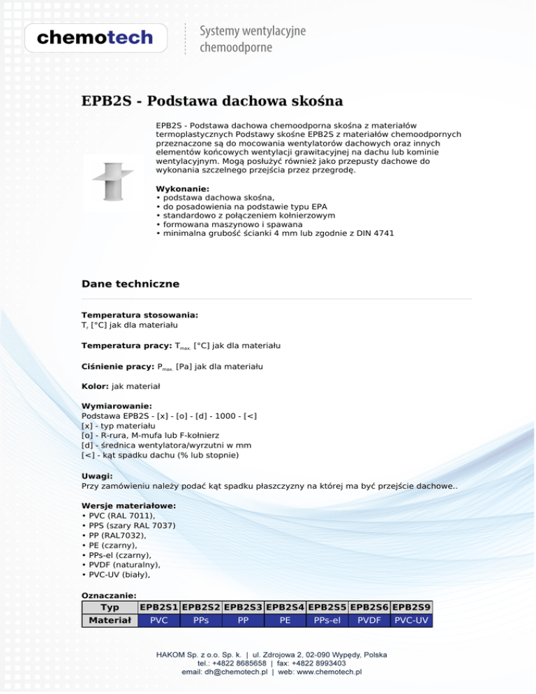 EPB2S - Podstawa dachowa skośna EPB2S - Podstawa dachowa chemoodporna skośna z materiałów termoplastycznych Podstawy skośne EPB2S z materiałów chemoodpornych przeznaczone są do mocowania wentylatorów dachowych oraz innych elementów końcowych wentylacji grawitacyjnej na dachu lub kominie wentylacyjnym. Mogą posłużyć również jako przepusty dachowe do wykonania szczelnego przejścia przez przegrodę. Wykonanie: • podstawa dachowa skośna, • do posadowienia na podstawie typu EPA • standardowo z połączeniem kołnierzowym • formowana maszynowo i spawana • minimalna grubość ścianki 4 mm lub zgodnie z DIN 4741 Dane techniczne Temperatura stosowania: Tr [°C] jak dla materiału Temperatura pracy: Tmax. [°C] jak dla materiału Ciśnienie pracy: Pmax. [Pa] jak dla materiału Kolor: jak materiał Wymiarowanie: Podstawa EPB2S - [x] - [o] - [d] - 1000 - [<] [x] - typ materiału [o] - R-rura, M-mufa lub F-kołnierz [d] - średnica wentylatora/wyrzutni w mm [<] - kąt spadku dachu (% lub stopnie) Uwagi: Przy zamówieniu należy podać kąt spadku płaszczyzny na której ma być przejście dachowe.. Wersje materiałowe: • PVC (RAL 7011), • PPS (szary RAL 7037) • PP (RAL7032), • PE (czarny), • PPs-el (czarny), • PVDF (naturalny), • PVC-UV (biały), Oznaczanie: Typ Materiał EPB2S1 EPB2S2 EPB2S3 EPB2S4 EPB2S5 EPB2S6 EPB2S9 PVC PPs PP PE PPs-el PVDF PVC-UV Wymiary Wielkość D [mm] PVC / PPs / PP / PE / PPs-el / PVDF / PVC-UV AxA [mm] H1 [mm] H2 [mm] 0125 317 400 600 0160 360 400 600 0200 410 400 600 0250 473 400 600 0315 554 400 600 0400 660 400 600 0450 723 400 600 0500 785 400 600 0630 948 400 600 0800 1160 400 600 1000 1410 400 600 TAB1. Wymiary główne i grubość ścianek osprzętu z materiału PP i PPs: B [mm] 0110-0250 0251-0500 0501-0600 A [mm] grubość ścianki S [mm] 0110-0250 4 4 6 0251-0500 4 4 6 0501-0600 6 6 6 TAB2. Wymiary główne i grubość ścianek osprzetu z materiału PVC i PE: B [mm] 0110-0250 0251-0500 0501-0600 A [mm] grubość ścianki S [mm] 0110-0250 3 4 5 0251-0500 4 4 5 0501-0600 5 5 5