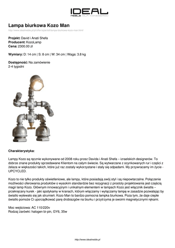 Lampa biurkowa Kozo Man http://www.idealmeble.pl/pl/offer/style/loft/lampa-biurkowa-kozo-man.html/ Projekt: David i Anati Shefa Producent: KozoLamp Cena: 2300.00 zł Wymiary: D: 14 cm | S: 8 cm | W: 34 cm | Waga: 3.8 kg Dostępność: Na zamówienie 2-4 tygodni Charakterystyka: Lampy Kozo są ręcznie wykonywane od 2008 roku przez Davida i Anati Shefa – izraelskich designerów. To dobrze znane produkty sprzedawane Klientom na całym świecie. Są wytwarzane z ocynkowanych rur i części z żelaza w większości takich, które już raz zostały wykorzystane i stały się odpadami. My przywracamy im życie UPCYCLED. Kozo to nie tylko produkty oświetleniowe, ale lampy, które posiadają swój styl i są niepowtarzalne. Połączenie możliwości oferowania produktów o wysokim standardzie bez rezygnacji z prostoty projektowania jest częścią magii lamp Kozo. Głównym innowacyjnym i unikalnym elementem w lampach Kozo jest włącznik światła – przekręcany kurek - jaki spotykamy w kranach, którym włączamy i wyłączamy lampę w zasadzie pozwalając by światło wylewało się jak strumień. Kozo Man to bardzo pomocna lampka biurkowa. Poza tym, że daje ciepłe światło pomoże Ci uporządkować parę drobiazgów na biurku i przytrzyma je swoimi magnetycznymi rękami. Moc wejściowa: AC 110/220v Rodzaj żarówki: halogen bi-pin, GY6, 35w http://www.idealmeble.pl Dostępne wersje produktu: nazwa produktu warianty Lampa biurkowa Kozo Man cena 2300.00zł http://www.idealmeble.pl dostępne Na zamówienie Zdjęcia produktu: http://www.idealmeble.pl Powered by TCPDF (www.tcpdf.org)