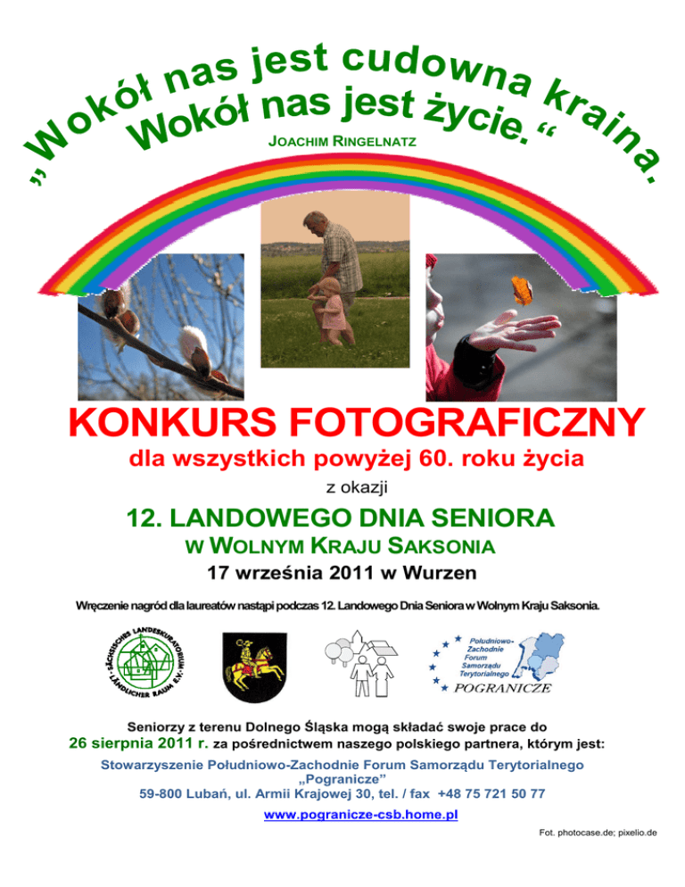 JOACHIM RINGELNATZ KONKURS FOTOGRAFICZNY dla wszystkich powyżej 60. roku życia z okazji 12. LANDOWEGO DNIA SENIORA W WOLNYM KRAJU SAKSONIA 17 września 2011 w Wurzen Wręczenie nagród dla laureatów nastąpi podczas 12. Landowego Dnia Seniora w Wolnym Kraju Saksonia. Seniorzy z terenu Dolnego Śląska mogą składać swoje prace do 26 sierpnia 2011 r. za pośrednictwem naszego polskiego partnera, którym jest: Stowarzyszenie Południowo-Zachodnie Forum Samorządu Terytorialnego „Pogranicze” 59-800 Lubań, ul. Armii Krajowej 30, tel. / fax +48 75 721 50 77 www.pogranicze-csb.home.pl Fot. photocase.de; pixelio.de