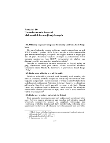 Rozdział 10 Umundurowanie i oznaki białoruskich formacji wojskowych 10.1. Oddziały organizowane przez Białoruską Centralną Radę Wojskową Pierwsza białoruska oznaka wojskowa została ustanowiona na sesji BCRW w dniu 11 grudnia 1917 r. Była to wstąŜka w biało-czerwono-białych barwach narodowych, naszywana na rosyjski mundur w drugiej pętlicy od góry1. Białoruscy wojskowi domagali się ustanowienia wzoru munduru narodowego, lecz BCRW najwyraźniej nie zdąŜyła tego dokonać przed jej rozwiązaniem przez bolszewików2. WstąŜkę w narodowych barwach, naszywaną w drugiej pętlicy od góry, wprowadził takŜe jako oznakę swoich oddziałów białoruski komendant miasta Mińska K. Jezowitow w pierwszych dniach lutego 1918 r.3 10.2. Białoruskie oddziały w armii litewskiej śołnierze białoruskich jednostek armii litewskiej nosili mundury niemieckie. Mundury piechoty niczym nie róŜniły się od litewskich: białe wypustki na rękawach i naramiennikach, w tymŜe kolorze trójkątne łapki na kołnierzu i otoki czapek. Natomiast białoruscy huzarzy, w odróŜnieniu od huzarów litewskich, mieli wypustki czerwone, a nie białe. Białego koloru były trójkątne łapki na kołnierzu i otoki czapek. Na uzbrojenie białoruskich huzarów przewidziane były takŜe lance z biało-czerwonobiałym proporczykiem4. 10.3. Białoruscy wojskowi na Łotwie i w Estonii Krój mundurów noszonych przez tych wojskowych jest niestety nieznany. Jedynym znanym elementem tego munduru jest trójkątny znaczek w barwach narodowych noszony na czapkach. Interesujące jest objaśnienie symboliki białoruskich barw narodowych, podawane przez rzeczonych wojskowych. Ich zdaniem, barwy te oznaczały pot, krew i łzy. 1 2 3 4 NARB, f. 62, op. I, l. 3, Rezoljucija po voprosu ob organizacii nacionalnych vojsk. „Beloruskaja Rada”, Nr 10: 1917, s. 4. „Beloruskaja Zemlja”, Nr 1: 1918, s. 3. A. Ružancau, op. cit., s. 51. 247 Takiego objaśnienia symboliki białoruskich barw narodowych nie spotyka się w literaturze przedmiotu5. 10.4. Białoruskie pułki Zachodniej Dywizji Strzelców ChociaŜ Zachodnia Dywizja Strzelców miała być polsko-litewsko-białoruska, element polski odgrywał w niej niewątpliwie największą rolę. W związku z tym na jesieni 1918 r. wprowadzono w Zachodniej Dywizji Strzelców maciejówki. Strzelcy mieli nosić maciejówki z czarnego sukna z malinowym otokiem, artylerzyści — czarne z czerwonym otokiem, zwiadowcy — koloru ochronnego, kawalerzyści — granatowe z Ŝółtym otokiem i wypustkami na mundurze6. O odrębnych oznakach dla białoruskich pułków tej dywizji niczego nie wiadomo, podobnie jak w odniesieniu do utworzonej na początku 1919 r. Armii Białorusko-Litewskiej. 10.5. Oddziały organizowane przez Białoruską Komisję Wojskową BKW powołała specjalną komisję dla opracowania wzorów białoruskich mundurów. Przedstawiały się one w następujący sposób: czapka wzoru angielskiego w kolorze szarym, wypustki: w jednostkach sztabowych i technicznych — czerwone, w piechocie — czarne, w kawalerii — białe. Otoki: sztabowcy — czarne, aksamitne, piechota — szare, kawaleria — błękitne. Na otoku naszyty pasek w barwach narodowych. Pośrodku umieszczona Pogoń w wieńcu z liści dębowych. Czapki oficerskie miały nad daszkiem srebrny przeplatany sznur. Mundur typu frencz. Wypustki: sztabowcy — czerwone, piechota — czarne, kawaleria — białe. W kawalerii oprócz tego błękitny kołnierz i mankiety. Naramiennik z tego samego co kurtka szarego sukna, na nim na czerwonym polu wyszyta srebrna Pogoń. Oficerowie nosili na kołnierzu srebrną pętlę, zaś Ŝołnierze naszywki w narodowych barwach, a na nich naszyte srebrne paski w celu oznaczenia stopnia. Stopień oficerski oznaczony był jedynie srebrnymi naszywkami na rękawach. Płaszcz kroju identycznego jak w armii polskiej, wypustki tego samego koloru, co mundur. Jedyną róŜnicą pomiędzy płaszczem oficerskim i Ŝołnierskim było to, Ŝe ten pierwszy był dwurzędowy, zaś drugi — jednorzędowy. Na kołnierzu płaszcza, zarówno oficerskiego, jak i Ŝołnierskiego, naszyta biało-czerwono-biała pętla. Na guzikach przewidziano Pogoń7. Pierwsi białoruscy wojskowi w takich mundurach pojawili się na ulicach Wilna i Mińska na początku listopada 1919 r.8 5 6 7 8 IJP, AOG, AGNW, T. 28, t. 1, Referat Boryka..., s. 11. W. Najdus, op. cit., s. 155. „Biełaruś”, Nr 19: 1919, s. 4; „Biełaruskaje Žyćcio”, Nr 20: 1919, s. 4. „Biełaruś”, Nr 17: 1919. 248 10.6. Oddziały gen. Stanisława Bułak-Bałachowicza Armia gen. S. Bułak-Bałachowicza nie miała jednolitego umundurowania. Elementem wyróŜniającym „bałachowców” jeszcze w okresie słuŜby w Armii Czerwonej jesienią 1918 r. były czapki kubanki z Ŝółtym denkiem9. Po przejściu na stronę „białych” zaczęli nosić na czapkach trupie główki ze skrzyŜowanymi piszczelami. Przejęli je po partyzanckim oddziale Punina, zorganizowanym przez dowództwo rosyjskie na Froncie Północnym w 1915 r.10 W 1920 r. trupie główki na czapkach stały się oznaką wyróŜniającą armię gen. S. Bułak-Bałachowicza. Armia ta miała teŜ własny system oznak oficerskich umieszczanych na kołnierzu: chorąŜy — jeden pasek srebrny, podporucznik — jeden pasek i jedna gwiazdka — srebrne, porucznik — jeden pasek i dwie gwiazdki srebrne, kapitan — jeden pasek i trzy gwiazdki srebrne, major — dwa paski i jedna gwiazdka złota, podpułkownik — dwa paski i dwie gwiazdki złote, pułkownik — dwa paski i trzy gwiazdki złote, generał podporucznik — złota błyskawica i jedna gwiazdka. Paski na kołnierzach były umieszczone pionowo11. 10.7. I Słucka Brygada Strzelców Organizatorzy I Słuckiej BS odczuwali brak zarówno uzbrojenia, jak i umundurowania. W związku z tym charakterystycznym mundurem „słucczaka” stał się szyty domowym sposobem mundur z samodziałowego płótna: kurtka typu frencz i spodnie
