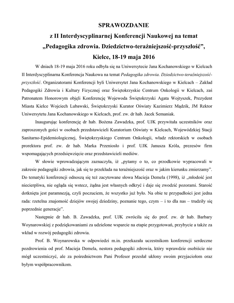 SPRAWOZDANIE z II Interdyscyplinarnej Konferencji Naukowej na temat „Pedagogika zdrowia. Dziedzictwo-teraźniejszość-przyszłość”, Kielce, 18-19 maja 2016 W dniach 18-19 maja 2016 roku odbyła się na Uniwersytecie Jana Kochanowskiego w Kielcach II Interdyscyplinarna Konferencja Naukowa na temat Pedagogika zdrowia. Dziedzictwo-teraźniejszośćprzyszłość. Organizatorami Konferencji byli Uniwersytet Jana Kochanowskiego w Kielcach – Zakład Pedagogiki Zdrowia i Kultury Fizycznej oraz Świętokrzyskie Centrum Onkologii w Kielcach, zaś Patronatem Honorowym objęli Konferencję Wojewoda Świętokrzyski Agata Wojtyszek, Prezydent Miasta Kielce Wojciech Lubawski, Świętokrzyski Kurator Oświaty Kazimierz Mądzik, JM Rektor Uniwersytetu Jana Kochanowskiego w Kielcach, prof. zw. dr hab. Jacek Semaniak. Inaugurując konferencję dr hab. Bożena Zawadzka, prof. UJK przywitała uczestników oraz zaproszonych gości w osobach przedstawicieli Kuratorium Oświaty w Kielcach, Wojewódzkiej Stacji Sanitarno-Epidemiologicznej, Świętokrzyskiego Centrum Onkologii, władz rektorskich w osobach prorektora prof. zw. dr hab. Marka Przeniosło i prof. UJK Janusza Króla, prezesów firm wspomagających przedsięwzięcie oraz przedstawicieli mediów. W słowie wprowadzającym zaznaczyła, iż „pytamy o to, co przodkowie wypracowali w zakresie pedagogiki zdrowia, jak się to przekłada na teraźniejszość oraz w jakim kierunku zmierzamy”. Do tematyki konferencji odnoszą się też zacytowane słowa Macieja Demela (1998), iż „młodość jest niecierpliwa, nie ogląda się wstecz, żądna jest własnych odkryć i daje się zwodzić pozorami. Starość dotknięta jest paramnezją, czyli poczuciem, że wszystko już było. Na obie te przypadłości jest jedna rada: rzetelna znajomość dziejów swojej dziedziny, poznanie tego, czym – i to dla nas – trudziły się poprzednie generacje”. Następnie dr hab. B. Zawadzka, prof. UJK zwróciła się do prof. zw. dr hab. Barbary Woynarowskiej z podziękowaniami za udzielone wsparcie na etapie przygotowań, przybycie a także za wkład w rozwój pedagogiki zdrowia. Prof. B. Woynarowska w odpowiedzi m.in. przekazała uczestnikom konferencji serdeczne pozdrowienia od prof. Macieja Demela, nestora pedagogiki zdrowia, który wprawdzie osobiście nie mógł uczestniczyć, ale za pośrednictwem Pani Profesor przesłał ukłony swoim przyjaciołom oraz byłym współpracownikom. Następnie został odczytany list od nieobecnego współorganizatora konferencji dr hab. prof. UJK, Stanisława Góździa – dyrektora Świętokrzyskiego Centrum Onkologii, skierowany do wszystkich przybyłych osób, z życzeniami owocnych obrad. Głos zabrał również prorektor, prof. zw. dr hab. Marek Przeniosło. Mówił o tradycjach uczelni i o interdyscyplinarności w badaniach naukowych, podkreślając ich szczególną wagę. Następnie prof. zw. dr hab. Bożena Matyjas – prodziekan Wydziału Pedagogicznego i Artystycznego UJK, przypomniała uczestnikom obrad, że patronem Uniwersytetu jest Jan Kochanowski, autor znanej wszystkim fraszki Na zdrowie, co tym bardziej obliguje do zainteresowania problematyką zdrowia. W części oficjalnej głos zabrała również Pani Renata Rabczyńska – Świętokrzyski Wicekurator Oświaty, która mówiła o tym, że człowieka/dziecka nie można dzielić na części dla potrzeb edukacji – stanowi on integralną całość, której niezwykle ważnym elementem jest zdrowie. Część oficjalną zakończył prof. UJK Janusz Król, który dokonał aktu uroczystego otwarcia konferencji. O godzinie 9.30 rozpoczęła się sesja plenarna, której moderatorami byli prof. zw. dr hab. Ewa Syrek z Uniwersytetu Śląskiego i dr hab. prof. UJK Bożena Zawadzka – gospodarz spotkania. W tej części wystąpili: prof. zw. dr hab. Ewa Syrek, która omówiła subdyscypliny pedagogiki, socjologii i psychologii jako konteksty zainteresowania zdrowiem i chorobą w naukach społecznych. Następnie dr hab. Anna Gaweł przedstawiła refleksje wokół tożsamości naukowej pedagogiki zdrowia. Prelegentka zwróciła uwagę, że status pedagogiki zdrowia w świetle literatury przedmiotu jest nadal niejasny, jedni bowiem autorzy przyznają jej samodzielność, inni zaś status bycia „w stanie tworzenia”, bądź też samodzielność o okrojonym zasięgu. Prof. zw. dr hab. Barbara Woynarowska zaprezentowała nowe koncepcje i strategie w edukacji zdrowotnej w Europie, a dr hab. Anna Kowalewska zreferowała wizję edukacji zdrowotnej wobec współczesnych zagrożeń zdrowia. Prelegentki podkreślały wagę dyskutowania różnych obszarów pedagogiki zdrowia, potrzebę interdyscyplinarości a zarazem dookreślenia tożsamości pedagogiki zdrowia oraz jej metodologii. Po przerwie kawowej sesja plenarna była kontynuowana, moderowali prof. zw. dr hab. Tadeusz Kasperczyk i dr hab. Anna Kowalewska z UW. Wysłuchano wystąpień dr hab. Andrzeja Krawańskiego, prof. PWSZ na temat pedagogiki zdrowia w rehabilitacji ze szczególnym uwzględnieniem aktywności pacjenta/klienta. Następnie dr hab. Ireny Pufal-Struzik prof. UJK, która mówiła o problemach zdrowotnych w rozwoju dzieci zdolnych i roli wsparcia. Z kolei prof. zw. dr hab. Tadeusza Kasperczyk przedstawił krytyczny obraz pól zdrowotnych Lalonda a prof. zw. dr. hab. Adam Zych – ważne aspekty geragogiki inicjacyjnej, inkluzyjnej i integracyjnej. 2 Dr Joanna Zemlik przedstawiła referat przygotowany przez prof. zw. dr. hab. Dorotę OlczakKowalczyk – Konsultanta Krajowego w Dziedzinie Stomatologii Dziecięcej i Doradcę Rzecznika Praw Dziecka dotyczący monitorowania populacji dzieci trzyletnich w zakresie zdrowia jamy ustnej. Następnie prof. zw. dr hab. Jerzy Marcinkowski zaprezentował film autorstwa mgr Eweliny Suski i wspólny z nią referat na temat konsumpcji substancji psychoaktywnych w ciąży, w którym rozważano możliwości optymalizacji działań profilaktycznych w tym obszarze. W wyniku wyst