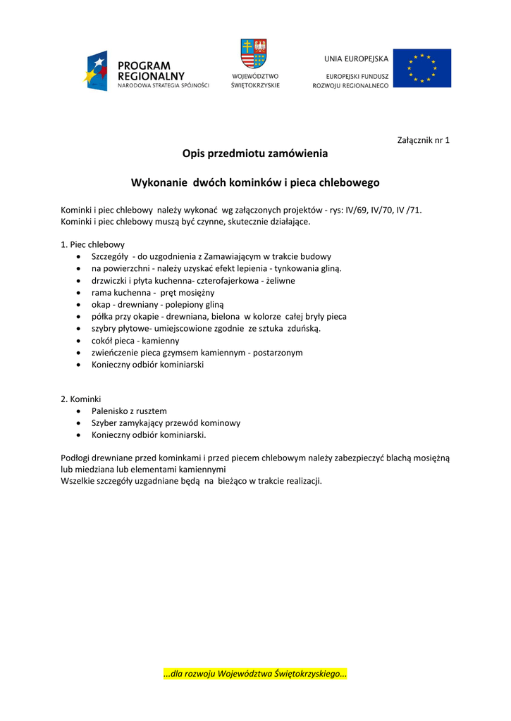 Załącznik nr 1 Opis przedmiotu zamówienia Wykonanie dwóch kominków i pieca chlebowego Kominki i piec chlebowy należy wykonać wg załączonych projektów - rys: IV/69, IV/70, IV /71. Kominki i piec chlebowy muszą być czynne, skutecznie działające. 1. Piec chlebowy Szczegóły - do uzgodnienia z Zamawiającym w trakcie budowy na powierzchni - należy uzyskać efekt lepienia - tynkowania gliną. drzwiczki i płyta kuchenna- czterofajerkowa - żeliwne rama kuchenna - pręt mosiężny okap - drewniany - polepiony gliną półka przy okapie - drewniana, bielona w kolorze całej bryły pieca szybry płytowe- umiejscowione zgodnie ze sztuka zduńską. cokół pieca - kamienny zwieńczenie pieca gzymsem kamiennym - postarzonym Konieczny odbiór kominiarski 2. Kominki Palenisko z rusztem Szyber zamykający przewód kominowy Konieczny odbiór kominiarski. Podłogi drewniane przed kominkami i przed piecem chlebowym należy zabezpieczyć blachą mosiężną lub miedziana lub elementami kamiennymi Wszelkie szczegóły uzgadniane będą na bieżąco w trakcie realizacji. ...dla rozwoju Województwa Świętokrzyskiego...