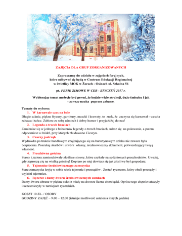ZAJĘCIA DLA GRUP ZORGANIZOWANYCH Zapraszamy do udziału w zajęciach feryjnych, które odbywać się będą w Centrum Edukacji Regionalnej w świetlicy MOK w Żorach - Osinach ul. Szkolna 56 pt. FERIE ZIMOWE W CER - STYCZEŃ 2017 r. Wybierając temat możecie być pewni, że będzie wiele atrakcji, dużo śmiechu i jak - zawsze nauka poprzez zabawę. Tematy do wyboru: 1. W karnawale czas na bale Długie suknie, piękne fryzury, garnitury, muszki i krawaty, to znak, że zaczyna się karnawał - wesoła zabawa i tańce. Zabierz ze sobą uśmiech i dobry humor i przyjeżdżaj do nas! 2. Legenda o trzech braciach Zamienisz się w jednego z bohaterów legendy o trzech braciach, udasz się na polowanie, a potem odpoczniesz u źródeł, przy których zbudowano Cieszyn. 3. Czarny jastrząb Wędrówka po trakcie handlowym znajdującego się na bursztynowym szlaku nie zawsze była bezpieczna. Poszukaj skarbów i stwórz własny, średniowieczny dokument, potwierdzający twoją własność. 4. Przedziwna gościna Stawy i jeziora zamieszkiwały złośliwe stwory, które czyhały na spóźnionych przechodniów. Uważaj, gdy zaproszą cię na wielką gościnę! Dopiero po niej dowiesz się jak złośliwy był gospodarz. 5. Tajemnice średniowiecznego zamczyska Stare zamczyska kryją w sobie wiele tajemnic i przesądów . Zostań rycerzem, który obali przesądy i wyjaśni tajemnice. 6. Rycerze i damy dworu średniowiecznych zamkach Damy dworu ubrane w piękne suknie miały na dworze liczne obowiązki. Oprócz tego chętnie tańczyły i uczestniczyły w turniejach rycerskich. KOSZT 10 ZŁ. / OSOBY GODZINY ZAJĘĆ – 9.00 – 12.00 (istnieje możliwość ustalenia innych godzin)