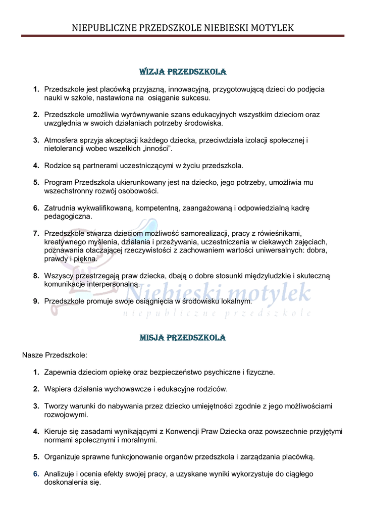 NIEPUBLICZNE PRZEDSZKOLE NIEBIESKI MOTYLEK WIZJA PRZEDSZKOLA 1. Przedszkole jest placówką przyjazną, innowacyjną, przygotowującą dzieci do podjęcia nauki w szkole, nastawiona na osiąganie sukcesu. 2. Przedszkole umożliwia wyrównywanie szans edukacyjnych wszystkim dzieciom oraz uwzględnia w swoich działaniach potrzeby środowiska. 3. Atmosfera sprzyja akceptacji każdego dziecka, przeciwdziała izolacji społecznej i nietolerancji wobec wszelkich „inności”. 4. Rodzice są partnerami uczestniczącymi w życiu przedszkola. 5. Program Przedszkola ukierunkowany jest na dziecko, jego potrzeby, umożliwia mu wszechstronny rozwój osobowości. 6. Zatrudnia wykwalifikowaną, kompetentną, zaangażowaną i odpowiedzialną kadrę pedagogiczna. 7. Przedszkole stwarza dzieciom możliwość samorealizacji, pracy z rówieśnikami, kreatywnego myślenia, działania i przeżywania, uczestniczenia w ciekawych zajęciach, poznawania otaczającej rzeczywistości z zachowaniem wartości uniwersalnych: dobra, prawdy i piękna. 8. Wszyscy przestrzegają praw dziecka, dbają o dobre stosunki międzyludzkie i skuteczną komunikacje interpersonalną. 9. Przedszkole promuje swoje osiągnięcia w środowisku lokalnym. MISJA PRZEDSZKOLA Nasze Przedszkole: 1. Zapewnia dzieciom opiekę oraz bezpieczeństwo psychiczne i fizyczne. 2. Wspiera działania wychowawcze i edukacyjne rodziców. 3. Tworzy warunki do nabywania przez dziecko umiejętności zgodnie z jego możliwościami rozwojowymi. 4. Kieruje się zasadami wynikającymi z Konwencji Praw Dziecka oraz powszechnie przyjętymi normami społecznymi i moralnymi. 5. Organizuje sprawne funkcjonowanie organów przedszkola i zarządzania placówką. 6. Analizuje i ocenia efekty swojej pracy, a uzyskane wyniki wykorzystuje do ciągłego doskonalenia się.