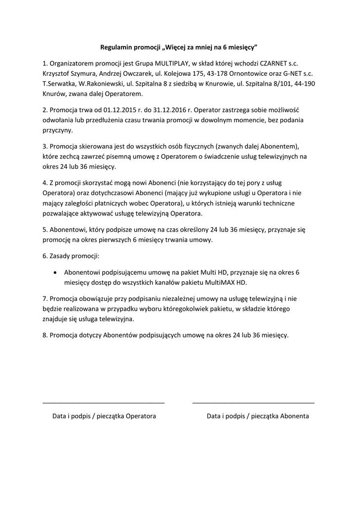 Regulamin promocji „Więcej za mniej na 6 miesięcy” 1. Organizatorem promocji jest Grupa MULTIPLAY, w skład której wchodzi CZARNET s.c. Krzysztof Szymura, Andrzej Owczarek, ul. Kolejowa 175, 43-178 Ornontowice oraz G-NET s.c. T.Serwatka, W.Rakoniewski, ul. Szpitalna 8 z siedzibą w Knurowie, ul. Szpitalna 8/101, 44-190 Knurów, zwana dalej Operatorem. 2. Promocja trwa od 01.12.2015 r. do 31.12.2016 r. Operator zastrzega sobie możliwość odwołania lub przedłużenia czasu trwania promocji w dowolnym momencie, bez podania przyczyny. 3. Promocja skierowana jest do wszystkich osób fizycznych (zwanych dalej Abonentem), które zechcą zawrzeć pisemną umowę z Operatorem o świadczenie usług telewizyjnych na okres 24 lub 36 miesięcy. 4. Z promocji skorzystać mogą nowi Abonenci (nie korzystający do tej pory z usług Operatora) oraz dotychczasowi Abonenci (mający już wykupione usługi u Operatora i nie mający zaległości płatniczych wobec Operatora), u których istnieją warunki techniczne pozwalające aktywować usługę telewizyjną Operatora. 5. Abonentowi, który podpisze umowę na czas określony 24 lub 36 miesięcy, przyznaje się promocję na okres pierwszych 6 miesięcy trwania umowy. 6. Zasady promocji: Abonentowi podpisującemu umowę na pakiet Multi HD, przyznaje się na okres 6 miesięcy dostęp do wszystkich kanałów pakietu MultiMAX HD. 7. Promocja obowiązuje przy podpisaniu niezależnej umowy na usługę telewizyjną i nie będzie realizowana w przypadku wyboru któregokolwiek pakietu, w składzie którego znajduje się usługa telewizyjna. 8. Promocja dotyczy Abonentów podpisujących umowę na okres 24 lub 36 miesięcy. __________________________________ Data i podpis / pieczątka Operatora __________________________________ Data i podpis / pieczątka Abonenta