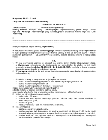 Nr sprawy: ZP.271.6.2015 Załącznik Nr 5 do SIWZ – Wzór umowy Umowa Nr ZP.271.6.2015 Zawarta w dniu …………………. roku w Bałtowie pomiędzy: Gminą Bałtów, zwanym dalej "Zamawiającym" reprezentowaną przez: Wójta Gminy mgr inż. Andrzeja Jabłońskiego przy kontrasygnacie Skarbnika Gminy mgr inż. Lidii Jasińskiej, a ......................................................................................................................................................... ........................................................................................................................................................, zwanym w dalszej części umowy „Wykonawcą” W rezultacie dokonania przez Zamawiającego wyboru najkorzystniejszej oferty Wykonawcy w trybie przetargu nieograniczonego na podstawie ustawy z dnia 29 stycznia 2004r. – Prawo zamówień publicznych - Dz.U.2013.907 z późn.zm., została zawarta umowa o następującej treści: § 1. 1. W celu dożywiania uczniów w szkołach na terenie Gminy Bałtów Zamawiający zleca, a Wykonawca zobowiązuje do dostarczania od poniedziałku do piątku (w dni nauki szkolnej), w okresie od dnia 02.09.2015r. do dnia 22.12.2015r. posiłków w formie drugiego śniadania, zwanych dalej przedmiotem umowy. 2. Wykonawca oświadcza, że jest uprawniony do świadczenia usług będących przedmiotem niniejszej umowy. §2 1. Przedmiot umowy, o którym mowa w §1 będzie się składał z: − bułki z masłem i wędliną (szynka lub inna wędlina wyższego gatunku), lub − bułki z masłem i żółtym serem, lub − bułki z masłem i pasztetem drobiowo – wieprzowym (każdy z w/w „zestawów” przynajmniej raz w tygodniu) a także dodatku w postaci pomidora, ogórka, sałaty, oraz napoju w kartoniku (raz w tygodniu zamiast napoju owoc – jabłko lub banan). 2. Ustala się minimalną gramaturę posiłku: − bułka duża - 80 gram, − szynka lub inna wędlina wyższego gatunku, lub ser żółty, lub pasztet drobiowo – wieprzowy – 30 gram, − masło – 8 gram, − napój w kartoniku – 200 ml, różne smaki, ze słomką. 3. Inne wymagania: − posiłek powinien być zapakowany, − posiłek powinien być dostarczony do szkół w godzinach od 9.00 do 11.00 (w dni nauki szkolnej) własnym transportem, w pojemnikach przeznaczonych do transportu żywności, − posiłek musi być sporządzony zgodnie z wymogami sztuki kulinarnej oraz wymogami sanitarnymi dla żywienia zbiorowego, Strona 1 z 3 − posiłek musi być wykonany ze świeżych artykułów posiadających aktualne terminy ważności. § 3. 1. Posiłki powinny być dostarczane do następujących szkół: − Publiczna Szkoła Podstawowa im. Legionów Polskich w Okole, − Zespół Szkół Publicznych w Bałtowie: Szkoła Podstawowa i Gimnazjum, − Filia Szkoły Podstawowej w Bałtowie mieszcząca się w ms. Wólka Bałtowska. § 4. 1. Świadczenie usług żywieniowych powinno być zgodne z ustawą z dnia 25.08.2006r. o bezpieczeństwie żywności i żywienia (tekst jednolity Dz. U z 2010r. nr 136, poz. 914) oraz wytycznymi Głównego Inspektora Sanitarnego i Instytutu Żywności i Żywienia w sprawie norm wyżywienia i żywienia, jakie obowiązują w zakładach żywienia zbiorowego oraz jakości zdrowotnej żywności, z uwzględnieniem zaleceń dotyczących: − wyposażenia (stanu technicznego i sanitarnego pomieszczeń i urządzeń), − personelu (kwalifikacje i niezbędne badania lekarskie), − cyklu produkcyjnego i jego poszczególnych etapów (przestrzegania zasad sanitarnohigienicznych na każdym etapie: produkcji posiłków, wydawania posiłków; składowania i magazynowania produktów, przewozu posiłków). Harmonogram dostarczania z dyrektorami szkół. posiłków § 5. Wykonawca będzie ustalał na bieżąco § 6. 1. W okresie objętym zamówieniem przewiduje się wydanie łącznie ok. 7 098 posiłków. 2. Dzienna liczba posiłków wynosi ok. 91, w tym: − Publiczna Szkoła Podstawowa im. Legionów Polskich w Okole - 13 posiłków, − Szkoła Podstawowa w Bałtowie - 15 posiłków, − Gimnazjum w Bałtowie - 39 posiłków, − Filia Szkoły Podstawowej w Bałtowie mieszcząca się w ms. Wólka Bałtowska - 24 posiłków. § 7. 1. Strony zgodnie ustalają, że liczba uczniów korzystających z posiłków w poszczególnych dniach objętych dożywianiem może ulec zmianie w stosunku do ilości dzieci wymienionych w § 6 w przypadkach absencji chorobowej, zmniejszenia liczby uprawnionych dzieci lub objęcia pomocą dzieci z nowych środowisk. Ilość posiłków może również ulec zmniejszeniu w przypadku wystąpienia w trakcie realizacji zamówienia dni wolnych od nauki szkolnej. 2. Zamawiający nie ponosi odpowiedzialności za zmniejszenie ilości posiłków. § 8. Umowę zawiera się na czas oznaczony: do 22.12.2015r. Strona 2 z 3 § 9. 1. Łączne wynagrodzenie Wykonawcy w okresie obowiązywania niniejszej umowy wynosi: …………………………. zł netto (słownie zł: ………………………………………………....), plus należny podatek VAT w wysokości ………………….zł, co stanowi kwotę ………………zł brutto (słownie zł: ……………………………………………………………….). 2. Cena jednostkowa za 1 posiłek wynosi: …………………………. zł netto (słownie zł: ………………………………………………....), plus należny podatek VAT w wysokości ………………….zł, co stanowi kwotę ………………zł brutto (słownie zł: ……………………………………………………………….). 3. Wynagrodzenie o którym mowa w ust. 1 niniejszego paragrafu może ulec pomniejszeniu lub powiększeniu w związku z sytuacjami opisanymi w § 7 niniejszej umowy. § 10. 1. Zapłata wynagrodzenia należnego Wykonawcy następować będzie na podstawie faktur VAT wystawianych na koniec danego miesiąca przez Wykonawcę na Gminny Ośrodek Pomocy Społecznej w B