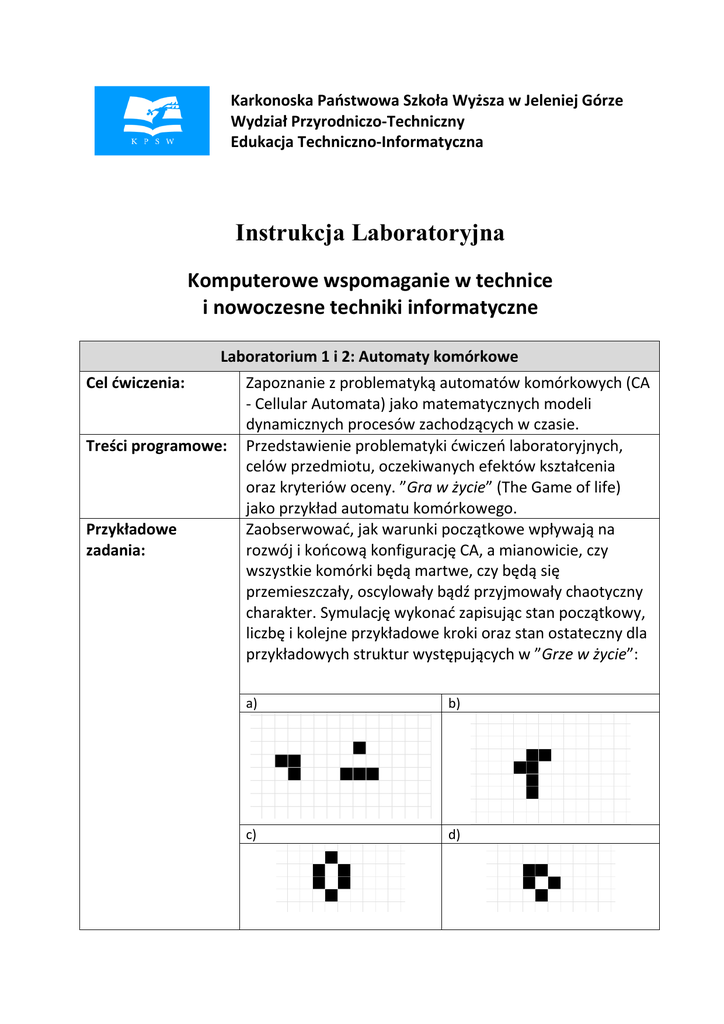 Karkonoska Państwowa Szkoła Wyższa w Jeleniej Górze Wydział Przyrodniczo-Techniczny Edukacja Techniczno-Informatyczna Instrukcja Laboratoryjna Komputerowe wspomaganie w technice i nowoczesne techniki informatyczne Laboratorium 1 i 2: Automaty komórkowe Cel ćwiczenia: Treści programowe: Przykładowe zadania: Zapoznanie z problematyką automatów komórkowych (CA - Cellular Automata) jako matematycznych modeli dynamicznych procesów zachodzących w czasie. Przedstawienie problematyki ćwiczeń laboratoryjnych, celów przedmiotu, oczekiwanych efektów kształcenia oraz kryteriów oceny. ”Gra w życie” (The Game of life) jako przykład automatu komórkowego. Zaobserwować, jak warunki początkowe wpływają na rozwój i końcową konfigurację CA, a mianowicie, czy wszystkie komórki będą martwe, czy będą się przemieszczały, oscylowały bądź przyjmowały chaotyczny charakter. Symulację wykonać zapisując stan początkowy, liczbę i kolejne przykładowe kroki oraz stan ostateczny dla przykładowych struktur występujących w ”Grze w życie”: a) b) c) d) Przykłady programów: Oczekiwane efekty po realizacji ćwiczenia: Sprawozdanie powinno zawierać: Pytania, zadania: e) f) g) h) W celu wykonania zadania można posłużyć się dowolnym narzędziem programistycznym - automatem komórkowym w przestrzeni dwuwymiarowej opartym na otoczeniu Moore’a, np.: Program Gra w życie „Conway”, Automaty komórkowe 1.0 - Adam Sawicki. Studenci po realizacji ćwiczenia laboratoryjnego znają reguły działania automatu komórkowego. Potrafią je zastosować do symulacji zachowania się komórek. 1. Cel ćwiczenia. 2. Program (treść zadania). 3. Opis kolejności wykonywanych czynności (wraz z zastosowanymi przykładami). 4. Opis własnoręcznie wykonanego zadania (opis realizacji kolejnych punktów zadania z wynikami, wykresami i komentarzami). 5. Wnioski końcowe. 1. Podać przykłady zastosowania CA. 2. Jakimi parametrami można zdefiniować CA? 3. Wymienić formy przestrzenne CA. 4. Opisać topologie i rodzaje sąsiedztwa w CA. 5. Sprawdzić cykliczność poniższych struktur (co ile generacji wyglądają podobnie?): a) b) 2 c) d) 6. Znaleźć układ początkowy przemieszczający się na płaszczyźnie (siatka prostokątna) po linii prostej (np. po przekątnej). 7. Utworzyć układ, który spowoduje „zderzanie się” takich dwóch podukładów. Co z tego wynika w zależności od fazy zderzenia? 3