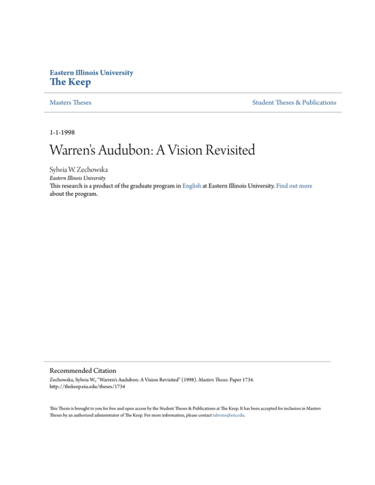 Eastern Illinois University The Keep Masters Theses Student Theses & Publications 1-1-1998 Warren's Audubon: A Vision Revisited Sylwia W. Zechowska Eastern Illinois University This research is a product of the graduate program in English at Eastern Illinois University. Find out more about the program. Recommended Citation Zechowska, Sylwia W., "Warren's Audubon: A Vision Revisited" (1998). Masters Theses. Paper 1734. http://thekeep.eiu.edu/theses/1734 This Thesis is brought to you for free and open access by the Student Theses & Publications at The Keep. It has been accepted for inclusion in Masters Theses by an authorized administrator of The Keep. For more information, please contact [email protected]. THESIS REPRODUCTION CERTIFICATE TO: Graduate Degree Candidates (who have written formal theses) SUBJECT: Permission to Reproduce Theses The University Library is receiving a number of request from other institutions asking permission to reproduce dissertations for inclusion in their library holdings. Although no copyright laws are involved, we feel that professional courtesy demands that permission be obtained from the author before we allow these to be copied. PLEASE SIGN ONE OF THE FOLLOWING STATEMENTS: Booth Library of Eastern Illinois University has my permission to lend my thesis to a reputable college or university or the purpose of copying it for inclusion in that institution's library or research holdings. I respectfully request Booth Library of Eastern Illinois University NOT allow my thesis to be reproduced because: Author's Signature thesis4.fonn Date Warren's Audubon: A Vision Revisited (TITLE) BY Sylwia W. Zechowska 41-500 Chorzow Ul: 3 Maja 15 Poland THESIS SUBMITIED IN PARTIAL FULFILLMENT OF THE REQUIREMENTS FOR THE DEGREE OF Master of Arts IN THE GRADUATE SCHOOL, EASTERN ILLINOIS UNIVERSITY CHARLESTON. ILLINOIS 1998 YEAR I HEREBY RECOMMEND THIS THESIS BE ACCEPTED AS FULFILLING THIS PART OF THE GRADUATE DEGREE CITED ABOVE 7-Jt-2 p DATE Abstract This thesis consists of a Polish translation of a volume of Robert Penn Warren's poetry: Audubon: A Vision accompanied by an introductory essay focusing on historical, cultural and psychological aspects of the poems. As a novelist, Robert Penn Warren is well known to the Polish reading public. All his major novels have been translated into Polish and received with great acclaim, which has been confirmed by numerous editions. Warren's popularity among Polish readers may be attributed to the fact that his fiction is permeated with a peculiar sense of melancholy and a profound awareness of tragic national history, features inevitably appealing to all Slavic nations, and to the Poles particularly with their turbulent past. The first part of the introduction aims at making the readers aware of the difficulties of literary translation. It also briefly highlights the different approaches to translating poetry bringing the readers closer to those aspects of the poems that may possibly be lost in translation. This section of the thesis examines numerous syntactic and lexical discrepancies between Polish and English, and explains why the several liberties the author allowed herself should not be regarded as distortions of the original. The next two sections introduce Warren the poet and Audubon the ornithologist to the Polish reading public and also discuss some critical responses to Audubon: A Vision which may enhance the reading and understanding of Warren's most representative poetic work The intriguing figure of Jean Jacques Audubon may be of interest to the Polish reader since Audubon, himself a cultural exile, may metaphorically personify the immigrant experience. This type of human experience is not unfamiliar to numerous generations of Poles who have been affected by the painful aftermath of being displaced, whether be it for political or other causes. Another reason for discussing the persona of Audubon in the introductory part is that his unusual personality encompassed an artistic nature alongside that of a frontier man. From among the men of letters who have been inspired by Audubon's mysterious personality, Robert Penn Warren is probably the one who reveals the complexity of Audubon's nature in the most brilliant and condensed way. By moving smoothly from the image of Audubon the hunter and the explorer to Audubon the artist in the moment of vision, Warren builds a bridge that links his own artistic experience with Audubon's. In doing so, Warren places himself in the historical context of being an American, the new man who, reaching further and further, crosses the frontiers, both the real and the imaginary. Warren's Audubon: A Vision is unanimously regarded by critics as unparalleled in his literary output which makes it the best choice for translation. Because of the fact that this collection offers profound historical, cultural, mythical, biographical and autobiographical insights it may be of interest to the Polish audience. Another important reason that justifies translating it into Polish is that Audubon: A Vision reflects Warren's preoccupation with violence, historical awareness, an everlasting search for identity and the meaning of life. By creating, in this collection, both realistic and mythic images, and by consciously mixing frontier vernacular with abstract and sublime poetic diction, Warren proves his exceptional maturity of artistic VlSlOn. Acknowledgments I would like to express my gratitude to Professor John Guzlowski who was my inspiration and mentor throughout the painstaking writing and translating process. Further, I would like to kindly thank my reviewers, Professors Anita Shelton and William Miller for their insightful comments and encouragement. My sincere thanks go Mr. Kenneth Gerhardt without whose continual support and dedication the thesis would never have assumed the present shape. THESIS Warren's Audubon: A Vision Revisited Table of Contents 1. Section I Forward .....................................