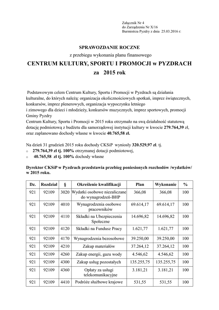 Załącznik Nr 4 do Zarządzenia Nr X/16 Burmistrza Pyzdry z dnia 25.03.2016 r: SPRAWOZDANIE ROCZNE z przebiegu wykonania planu finansowego CENTRUM KULTURY, SPORTU I PROMOCJI w PYZDRACH za 2015 rok Podstawowym celem Centrum Kultury, Sportu i Promocji w Pyzdrach są działania kulturalne, do których należą: organizacja okolicznościowych spotkań, imprez świątecznych, konkursów, imprez plenerowych, organizacja wypoczynku letniego i zimowego dla dzieci i młodzieży, konkursów muzycznych, imprez sportowych, promocji Gminy Pyzdry Centrum Kultury, Sportu i Promocji w 2015 roku otrzymało na swą działalność statutową dotację podmiotową z budżetu dla samorządowej instytucji kultury w kwocie 279.764,39 zł, oraz zaplanowano dochody własne w kwocie 40.765,58 zł. Na dzień 31 grudzień 2015 roku dochody CKSiP wyniosły 320.529,97 zł. tj. o 279.764,39 zł tj. 100% otrzymanej dotacji podmiotowej, o 40.765,58 zł tj. 100% dochody własne Dyrektor CKSiP w Pyzdrach przedstawia przebieg poniesionych rozchodów /wydatków/ w 2015 roku. Dz. Rozdział § Określenie kwalifikacji Plan Wykonanie % 921 92109 3020 Wydatki osobowe niezaliczane do wynagrodzeń-BHP 366,08 366,08 100 921 92109 4010 Wynagrodzenia osobowe pracowników 69.614,17 69.614,17 100 921 92109 4110 Składki na Ubezpieczenia Społeczne 14.696,82 14.696,82 100 921 92109 4120 Składki na Fundusz Pracy 1.621,77 1.621,77 100 921 92109 4170 Wynagrodzenia bezosobowe 39.250,00 39.250,00 100 921 92109 4210 Zakup materiałów 37.264,12 37.264,12 100 921 92109 4260 Zakup energii, gazu wody 4.546,62 4.546,62 100 921 92109 4300 Zakup usług pozostałych 135.255,75 135.255,75 100 921 92109 4360 3.181,21 3.181,21 100 921 92109 4410 531,55 531,55 100 Opłaty za usługi telekomunikacyjne Podróże służbowe krajowe Dz. Rozdział 921 92109 921 92109 § Określenie kwalifikacji Plan Wykonanie % 4430 Ubezpieczenia mienia, różne opłaty 8.732,23 8.732,23 100 4440 Odpisy na ZFŚS 5.469,65 5.469,65 100 OGÓŁEM: 320.529,97 320.529,97 Dyrektor CKSiP w Pyzdrach informuje, że na dzień 31 grudnia 2015 roku powstały zobowiązania na ogólną kwotę 485,99 zł, są to zobowiązania niewymagalne. Termin płatności tych zobowiązań przypada na styczeń 2015 roku. Nie powstały żadne należności. Zadania realizowane przez Centrum w szczególności opierają się na organizacji imprez kulturalno-sportowych o różnej tematyce i zakresie, prowadzeniu świetlic i ognisk artystycznych oraz sekcji sportowych, działalności promocyjnej (prowadzenie strony internetowej, opracowywanie ulotek i folderów), współpracy z organizacjami pozarządowymi i innymi instytucjami z terenu gminy oraz powiatu. I. Kultura i Ochrona Dziedzictwa Narodowego 1) Organizacja imprez kulturalnych Wielka Orkiestra Świątecznej Pomocy Przy Centrum Kultury Sportu i Promocji w Pyzdrach powstał sztab liczący 35 wolontariuszy – uczniów miejscowych szkół – którzy od wczesnych godzin rannych kwestowali na terenie pyzdrskiej gminy. W akcję włączyli się również strażacy z OSP Pyzdry, którzy dbali o bezpieczeństwo kwestujących. Impreza towarzysząca odbyła się w sali widowiskowo- sportowej. Wystąpili różni artyści, głównie lokalni. Prowadzeniem imprezy i przeprowadzeniem licytacji gadżetów zajął się konferansjer. Warto dodać, że przedmioty na licytację pochodziły od miejscowych instytucji, lokalnych firm i osób prywatnych . Jako pierwsza zaprezentowała się Pyzdrska Grupa Capoeira, która dzięki imitacji walk i akrobacji otrzymała gromkie brawa od licznie zgromadzonej publiczności. Choreografia hiphopowa uczestników warsztatów tanecznych była rewelacyjna. Maluchy, których instruktorem jest Łukasz Mielcarek czują rytm. Pyzdrskie zumbowiczki, mimo mniejszego niż zwykle składu, udowodniły, że fitness jak najbardziej nadaje się na występ sceniczny. Pyzdrska Orkiestra Dęta pod batutą nowego kapelmistrza Łukasza Oblizajka zagrała trzy bloki muzyki rozrywkowej. Zwieńczeniem niedzielnego wieczoru był koncert zespołu „Akord Nieba”, który specjalnie na tą okoliczność przygotował mocny, rockowy repertuar. Wolontariusze w czasie kwesty ulicznej zebrali 5.272,72 zł. Z licytacji gadżetów uzyskano kwotę 4.812,80 zł. Sumując wyszło razem 10.085,52 zł.. Dzień Kobiet Po raz pierwszy Centrum Kultury Sportu i Promocji w Pyzdrach zorganizowało spotkanie z okazji Dnia Kobiet. W niedzielne popołudnie, 8 marca goście przybyli do sali OSP w Pyzdrach. Gwiazdą pierwszej części spotkania był kabaret EWG czyli Eksportowy Wytwór Gminny z Doruchowa. W repertuarze artystów z południowej Wielkopolski znalazły się m.in. 2 przygody członkini Koła Gospodyń Wiejskich, scenki trafnie puentujące relacje damsko męskie oraz konflikt pokoleń w krzywym zwierciadle. Licznie zgromadzona publiczność bawiła się świetnie i gromkimi brawami podziękowała artystom za wspaniały występ. Burmistrz Pyzdr Przemysław Dębski obdarował każdą z Pań kwiatkiem. Na scenie zaprezentowała się również utalentowana młodzież wraz z Anną Wrońską. Uczestnicy warsztatów wokalnych zaśpiewali piosenki o kobietach i miłości. Na osłodę dla wszystkich kawa i ciasto. KATYŃ - ocalić od zapomnienia W niedzielę 12 kwietnia w 75. rocznicę mordu uczczono pamięć ofiar zbrodni katyńskiej. W uroczystości wzięli udział członkowie rodzin pomordowanych oficerów Wojska Polskiego, Starosta Powiatu Wrzesińskiego, przedstawiciele gminnych władz, służb mundurowych, młodzież i mieszkańcy gminy. Miasto Pyzdry przystąpiło do programu „KATYŃ… ocalić od zapomnienia” pod patronatem Prezydenta RP. Jego celem było uczczenie pamięci Bohaterów Zbrodni Katyńskiej, a zarazem przywrócenie ich sylwetek zbiorowej pamięci narodu poprzez posadzenie 21.473 DĘBÓW PAMIĘCI. Jeden dąb to jedno nazwisko z Listy Katyńskiej. W ten sposób poprzez posadzenie dębów – roślinnego symbolu siły i niezłomności chcemy upamiętnić h