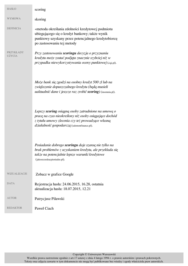 HASŁO scoring WYMOWA skoring DEFINICJA «metoda określania zdolności kredytowej podmiotu ubiegającego się o kredyt bankowy; także wynik punktowy uzyskany przez potencjalnego kredytobiorcę po zastosowaniu tej metody» PRZYKŁADY UŻYCIA Przy zastosowaniu scoringu decyzja o przyznaniu kredytu może zostać podjęta znacznie szybciej niż w przypadku niewykorzystywania oceny punktowej (cigi.pl). Może bank się zgodzi na osobny kredyt 500 zł lub na zwiększenie dopuszczalnego kredytu (będą musieli uaktualnić dane i jeszcze raz zrobić scoring) (insomnia.pl). Lepszy scoring osiągną osoby zatrudnione na umowę o pracę na czas nieokreślony niż osoby osiągające dochód z tytułu umowy zlecenia czy też prowadzące własną działalność gospodarczą (salomonfinance.pl). Posiadanie dobrego scoringu daje szansę nie tylko na brak problemów z uzyskaniem kredytu, ale przekłada się także na potencjalnie lepsze warunki kredytowe (jakoszczedzacpieniadze.pl). WIZUALIZACJE Zobacz w grafice Google DATA Rejestracja hasła: 24.06.2015, 16.28, ostatnia aktualizacja hasła: 18.07.2015, 12.21 AUTOR Patrycjusz Pilawski REDAKTOR Paweł Ciach Copyright © Uniwersytet Warszawski Wszelkie prawa zastrzeżone zgodnie z art.17 ustawy z dnia 4 lutego 1994 r. o prawie autorskim i prawach pokrewnych. Teksty oraz zdjęcia zawarte w tym dokumencie nie mogą być publikowane bez wiedzy i zgody właściciela praw autorskich. Powered by TCPDF (www.tcpdf.org)