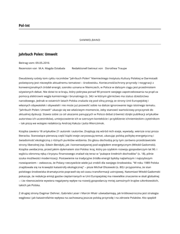 Pol-Int SAMMELBAND Jahrbuch Polen: Umwelt Beitrag vom: 09.05.2016 Rezension von M.A. Magda Dziabala Redaktionell betreut von Dorothea Traupe Dwudziesty szósty tom cyklu roczników "Jahrbuch Polen" Niemieckiego Instytutu Kultury Polskiej w Darmstadt poświęcony jest niezwykle aktualnemu tematowi – środowisku. Koniecznośćochrony przyrody i rezygnacji z konwencjonalnych źródeł energii, szeroko uznana w Niemczech, w Polsce w dalszym ciągu jest przedmiotem ożywionych debat. Nie dziwi to w kraju, który pokrywa ponad 90 procent swojego zapotrzebowania na prąd za pomocą elektrowni węgla kamiennego i brunatnego (s. 34) i w którym górnictwo ma status dziedzictwa narodowego. Jednak w ostatnich latach Polska znalazła się pod silną presją ze strony Unii Europejskiej i własnych obywatelek i obywateli i nie może już pozwolić sobie na dalsze ignorowanie tego istotnego tematu. "Jahrbuch Polen: Umwelt" ukazuje się we właściwym momencie, żeby stanowić wartościowy przyczynek do aktualnej dyskusji. Stawia sobie za cel ukazanie panujących w Polsce debat (również dzięki publikacji artykułów autorstwa ich uczestników), umiejscowienie ich w szerszym kontekście i przybliżenie ichniemieckim czytelnikom – tak piszą we wstępie redaktorzy Andrzej Kałuża i Jutta Wierczimok. Książka zawiera 18 artykułów 21 autorek i autorów. Znajdują się wśród nich eseje, wywiady, wiersze oraz proza literacka. Stanowiące pierwszą część kiążki eseje zarysowują temat, ukazując polską politykę energetyczną i świadomość ekologiczną z różnych punktów widzenia. Do głosu dochodzą przy tym zarówno przedstawiciele strony liberalnej (np. Edwin Bendyk), jak i konserwatywnej pod względem energetycznym (Witold Gadomski). Książka uwidacznia, przed jakim dylematem stoi Polska: kraj, który po szybkim rozwoju gospodarczym lat 90. i wyjściu obronną ręką z kryzysu finansowego znalazł się teraz w "pułapce średnich dochodów" (s. 18), pilnie szuka możliwości modernizacji. Postawienie na tradycyjne źródła energii byłoby najtańszym i najszybszym rozwiązaniem – zwłaszcza, że Polacy rzeczywiście wiele już zrobili dla swojego środowiska. "W roku 1989 Polska znajdowała się na krawędzi katastrofy ekologicznej" – pisze Michał Olszewski (s. 80) i przypomina, że stan polskiego środowiska dramatycznie poprawił się od czasu transformacji ustrojowej. Natomiast Witold Gadomski pokazuje, że redukcja emisji gazów cieplarnianych w Unii Europejskiej ma niewielkie znaczenie w skali globalnej – i że równocześnie wywiera negatywny wpływ na rozwój gospodarczy mniej zamożnych krajów członkowskich, takich jak Polska. Z drugiej strony Dagmar Dehner, Gabriele Leser i Marcin Wiatr uświadamiają, jak krótkowzroczna jest strategia węglowa i jak katastrofalnie wpływa na zachowaną jeszcze polską przyrodę i na zdrowie Polaków. Kto spędził już kiedyś zimę w Krakowie, tego nie zdziwi fakt, że miasto to plasuje się na trzecim miejscu w rankingu najbardziej zanieczyszczonych miast UE -- w którym zresztąinne polskie miasta również zajmują czołowe pozycje. W badaniach opinii publicznej większość Polaków wykazuje wprawdzie stosunkowo wysoką świadomość ekologiczną i podaje, że rozumie wpływ działań pojedynczych jednostek na stan środowiska (s. 17). Jednak większość ankietowanych wydaje się pojmować ten temat raczej na poziomie abstrakcji, nie kierując się w życiu codziennym względami ekologicznymi (s. 17, 82). Dla wielu środowisko jest po prostu mniej ważne od palących społecznych i politycznych problemów kraju (s. 15). To, jaką niesławą okryła się polska polityka środowiskowa za granicą, unaocznia czytelnikom Dagmar Dehner. Pisze m. in. o tym, że równolegle do światowego szczytu klimatycznego w Warszawie w 2013 roku, sponsorowanego zresztą przez koncerny węglowe i energetyczne, w stolicy odbył się tak zwany Szczyt Węgla i Klimatu. Wymowny jest również fakt, że w trakcie trwania obrad odwołany został minister środowiska. Podczas lektury książki można zauważyć dwie tendencje w aktualnym polskim podejściu do środowiska. Z jednej strony to rosnąca liczba i siła przebicia ruchów oddolnych i protestów obywatelskich. Chyba najstarszym i najbardziej znanym przykładem tego typu są masowe demonstracje przeciwko budowie autostrady przez Dolinę Rospudy, które odbywały się w 2007 i 2008 roku i w końcu osiągnęły swój cel po decyzji Komisji Europejskiej. Wywiad z franciszkaninem ojcem Stanisławem Jaromim OFMConv pozwala na wgląd w tamte protesty i ukazuje wartościową chrześcijańską perspektywę na chronę środowiska. Wydarzenia z Rospudy zdawały powtarzać się w latach 2012-1014 w Żurawlowie, małej miejscowości na wschodzie Polski, której mieszkańcy wspólnie z sympatyzantami z kraju i zagranicy wstrzymali giganta energetycznego Chevron przed poszukiwaniem w ich wsi gazu łupkowego. Opisują to w swoim artykule Adrian Stadnicki i Julian Mrowiński. To, że te obydwa przypadki zdecydowanie nie są odosobnione, widać z przeglądu zielonych ruchów miejskich w Polsce starannie zestawionego przez Gabriele Lesser. Ruchy te stanowią już poważną alternatywę do tradycyjnej polityki komunalnej, a w kilku miastach, w tym w Poznaniu i Gorzowie Wielkopolskim, ich przedstawiciele zostali nawet burmistrzami. W Polsce, gdzie społeczeństwo obywatelskie jest raczej słabo zakorzenione, a wzajemne stosunki obywateli i polityki nacechowane nieufnością, jest to wyjątkowe zjawisko. Z drugiej strony wielu autorów podkreśla brak sprzeczności między ochroną przyrody a dobrem ludzi. Większości Polaków te dwa pojęcia nadal wydają się nie do pogodzenia, jak oprócz wymienionych już statystyk dowodzi również następujący fakt przedstawiony przez Michała Olszewskiego i zacytowany na wstępie przez redaktorów: z powodu oporu lokalnych społeczności polskim władzom od ponad dziesi