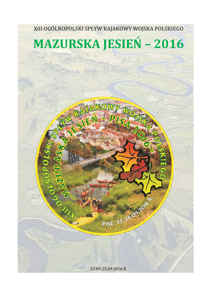 XIII OGÓLNOPOLSKI SPŁYW KAJAKOWY WOJSKA POLSKIEGO MAZURSKA JESIEŃ – 2016 22.09-25.09.2016 R. REGULAMIN XIII OGÓLNOPOLSKIEGO SPŁYWU KAJAKOWEGO WOJSKA POLSKIEGO „MAZURSKA JESIEŃ 2016 – PISA 2016 ” ORGANIZATOREM SPŁYWU JEST: Wojskowe Stowarzyszenie „Sport-Turystyka-Obronność PRZY WSPARCIU I POMOCY: Departamentu Komunikacji Społecznej MON Ministerstwa Sportu i Turystyki Mazury PTTK Sp z o.o Centrum Edukacji i Inicjatyw Kulturalnych w Olsztynie Dowództwa Garnizonu Warszawa 3 Flotylli Okrętów MW RP Stołecznego Oddziału Wojskowego PTTK Firmy PROKAJAK z Krakowa Firmy POLYAK z Drzewicy. CELE IMPREZY: popularyzowanie idei aktywnego wypoczynku i czynnego spędzania czasu wolnego poprzez uprawianie turystyki kajakowej, zapoznanie uczestników z jesiennymi walorami turystycznymi Warmii i Mazur, integracja rodzin poprzez uprawianie turystyki kwalifikowanej, obcowanie z przyrodą przy dobrej zabawie dla przeciętnie wysportowanego turysty. TERMIN: 22-25.09.2016 r. – 4 dni. BAZA OŚRODEK WYPOCZYNKOWY SUS RYBITWY nad Jeziorem Roś Adres: 12-200 PISZ TEL: 87/423-47-88 www. SUSRYBITWY.PL KOMITET ORGANIZACYJNY: komandor spływu w-ce komandor ds. Programowych w-ce komandor ds. Organizacyjnych pilot początkowy pilot końcowy Stanisław Janowicz Krzysztof Stachowski Jerzy Kufel Zbigniew Manicz Wiesław Ładniak 2 ZAKWATWEROWANIE I WYŻYWIENIE: Ośrodek Wypoczynkowy SUS RYBITWY nad Jeziorem Roś: śniadania i obiadokolacja w ośrodku, suchy prowiant na trasę w dniach 22-25.09.2016 r Zakwaterowanie w domkach kempingowych w pokojach 2 osobowych z łazienkami. ETAPY SPŁYWU: DZIEŃ 1 – 22 wrzesień 2016 (czwartek) Przyjazd uczestników DZIEŃ 2 – 23 wrzesień 2016 (piątek ) – etap I Jaz Kwik nad Jeziorem Śniardwy – Rzeka Wyszka-Jezioro Białoławki – Jezioro Kocioł – rzeka Wilkus – Jezioro Roś – ośrodek Rybitwy (20 km) DZIEŃ 3 – 24 wrzesień 2016 (sobota ) – etap II Ośrodek Rybitwy – Jezioro Roś - Pisz – rzeka Pisa – Dziadowo most ( 23 km) DZIEŃ 4 – 25 wrzesień 2016 (niedziela) – etap III Dziadowo most – Jeże most (12 km) KOSZTY UCZESTNICTWA: Koszt uczestnictwa w spływie 1 osoby wynosi wraz z zakwaterowaniem i wyżywieniem 400,00 zł i obejmuje: zakwaterowanie – trzy noclegi, wyżywienie – trzy śniadania, suchy prowiant na trasę i dwie obiadokolacje w piątek i sobotę oraz obiad w niedzielę; miejsce w kajaku i transport podczas spływu. UWAGI ! Ilość kajaków udostępniana przez organizatora ograniczona. Decyduje kolejność zgłoszeń i opłata. Ilość miejsc ograniczona. Decyduje kolejność zgłoszeń i opłata. Koszty uczestnictwa i opłata za sprzęt płatne wraz z nadesłaniem Karty Zgłoszenia. W RAMACH WPISOWEGO ORGANIZATOR ZAPEWNIA NIŻEJ WYMIENIONE ŚWIADCZENIA: znaczek pamiątkowy i materiały krajoznawcze o regionie, książeczkę i wklejkę do książeczki OT PZK i TOK PTTK oraz możliwość korzystania z oferty kulturalno -oświatowej, ubezpieczenie NW, możliwość potwierdzenia i weryfikacji punktów do odznak kajakowych PTTK i PZK, przewóz osób i sprzętu na trasie spływu i zabezpieczenie postoju kajaków między etapami spływu. 3 ZGŁOSZENIA: Pisemne (wskazane zgłoszenie drogą elektroniczną), wyłącznie na „ Kartach Zgłoszenia ” należy przesłać do 10 września 2016 r. wraz z kserokopią dowodu wpłaty pod adresem: Wojskowe Stowarzyszenie „SPORT-TURYSTYKA-OBRONNOŚĆ” wiceprezes Jerzy Kufel 02-570 WARSZAWA ul. Myśliborska 24a/17 z dopiskiem: Spływ Kajakowy „MAZURSKA JESIEŃ 2016” www.wssto.pl e-mail: [email protected] WPŁATY DOKONYWAĆ NALEŻY NA KONTO: Wojskowe Stowarzyszenie „SPORT-TURYSTYKA-OBRONNOŚĆ” Aleje Niepodległości 141, 02-570 WARSZAWA Bank Zachodni WBK – 66 Oddział w WARSZAWIE nr konta: 27 1500 1777 1217 7007 1105 0000 z dopiskiem: Spływ Kajakowy „MAZURSKA JESIEŃ 2016” INFORMACJE DODATKOWE: Rezygnacja z udziału w spływie zgłoszona po 15.09.2016 r. pozbawia zwrotu kosztów uczestnictwa. Organizator zawiadomi pisemnie lub telefonicznie o odmowie przyjęcia na spływ z jednoczesnym zwrotem kosztów wpisowego (ograniczona liczba miejsc na spływie). Zgłaszający się na spływ staje się uczestnikiem z chwilą zweryfikowania się w sekretariacie spływu. Do weryfikacji niezbędne są następujące dokumenty: o dowód osobisty, legitymacja PTTK, o dowód wpłaty wpisowego, o ewentualna legitymacja posiadających kwalifikacje turystyczno – kajakowe i ratownicze. Uczestnicy winni zgłosić się w sekretariacie w bazie spływu w dniu 22.09.2016 r. do godziny 2000. XIII Ogólnopolski Spływ Kajakowy Wojska Polskiego „Mazurska Jesień 2016” jest imprezą otwartą, o charakterze rekreacyjnym. Uczestnicy spływu biorą w nim udział na własną odpowiedzialność. Potwierdzenie własnoręcznym podpisem „Karty Zgłoszenia” jest równoznaczne z przyjęciem do wiadomości postanowień niniejszego regulaminu. Od uczestników spływu wymagany jest stan zdrowia umożliwiający uprawianie turystyki kajakowej. Uczestnicy spływu zobowiązani są do: o przestrzegania postanowień regulaminu oraz podporządkowania się wszystkim zarządzeniom i poleceniom kierownictwa spływu, o przestrzegania zasad zachowania obowiązujących na terenie ośrodka – bazy spływu, o przestrzegania postanowień „Karty Turysty”, przepisów prawa wodnego, zasad ochrony przyrody i przepisów przeciwpożarowych, o posiadania apteczki lub podstawowych środków opatrunkowych i przeciwbólowych, reperaturki oraz niezbędnego wyposażenia osobistego, o udzielania pomocy innym uczestnikom spływu, którzy jej potrzebują, o zabezpieczenia sprzętu pływającego po etapach zgodnie z poleceniami kierownictwa, o bezwarunkowego zachowania trzeźwości podczas trwania spływu, o pokrycia wszelkich strat materialnych spowodowanych przez uczestnika spływu na rzecz organizatora lub osób trzecich, o przestrzegania zasad pływania na trasie spływu, a w szczególności: nie wypływania z miejsca po