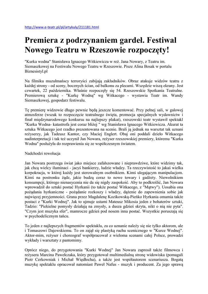 http://www.e-teatr.pl/pl/artykuly/211181.html Premiera z podrzynaniem gardeł. Festiwal Nowego Teatru w Rzeszowie rozpoczęty! "Kurka wodna" Stanisława Ignacego Witkiewicza w reż. Jana Nowary, z Teatru im. Siemaszkowej na Festiwalu Nowego Teatru w Rzeszowie. Pisze Alina Bosak w portalu Biznesistyl.pl Na filmiku muzułmańscy terroryści zabijają zakładników. Obraz atakuje widzów teatru z każdej strony - od sceny, bocznych ścian, od balkonu za plecami. Wszędzie wiszą ekrany. Jest czwartek, 22 października. Właśnie rozpoczęły się 54. Rzeszowskie Spotkania Teatralne. Premierową sztukę - "Kurkę Wodną" wg Witkacego - wystawia Teatr im. Wandy Siemaszkowej, gospodarz festiwalu. Tę premierę widzowie długo pewnie będą jeszcze komentować. Przy pełnej sali, w galowej atmosferze (wszak to rozpoczęcie teatralnego święta, promocja specjalnych wydawnictw i finał międzynarodowego konkursu na najlepszy plakat), rzeszowski teatr wystawił spektakl "Kurka Wodna- katastrofa jest coraz bliżej " wg Stanisława Ignacego Witkiewicza. Akurat ta sztuka Witkacego jest rzadko prezentowana na scenie. Brali ją jednak na warsztat tak uznani reżyserzy, jak Tadeusz Kantor, czy Maciej Englert. Obaj oni poddali dzieło Witkacego nadinterpretacji i tak też uczynił Jan Nowara, reżyser rzeszowskiej premiery, któremu "Kurka Wodna" posłużyła do rozprawienia się ze współczesnym światem. Nadchodzi rewolucja Jan Nowara postrzega świat jako miejsce zafałszowane i nieprawdziwe, które widzimy tak, jak chcą wielcy iluminaci - jacyś bankierzy, ludzie władzy. Ta rzeczywistość to jakaś wielka korpokracja, w której każdy jest sterowalnym osobnikiem. Kimś ulegającym manipulacjom. Kimś na postronku żądz, jakie budzą coraz to nowe towary i gadżety. Niewolnikiem konsumpcji, którego nienasycenia nie da się nigdy zaspokoić. Aby to podkreślić, Jan Nowara wprowadził do sztuki postać Hyrkanii (to także postać Witkacego, z "Mątwy"). Uosabia ona pożądania hyrkaniczne - pożądanie rozkoszy i władzy, dążenie do zapewnienia sobie jak najwięcej przyjemności. Grana przez Magdalenę Kozikowską-Pieńko Hyrkania omamia także postaci z "Kurki Wodnej". Jak to ujmuje ustami Mateusz Mikosia jeden z bohaterów sztuki, Tadzio: "Piekielne pomysły działają na zmysły, a dusza gdzieś skryta, nikt o nią nie pyta". "Czym jest muzyka sfer", mamrocze gdzieś pod nosem inna postać. Wszystkie poruszają się w psychodelicznym tańcu. To jeden z najlepszych fragmentów spektaklu, za co uznanie należy się nie tylko aktorom, ale i Tomaszowi Dajewskiemu. To on zajął się plastyką ruchu scenicznego w "Kurce Wodnej". Aktor-mim, reżyser i choreograf współpracował z wieloma scenami całej Polsce, prowadzi wykłady i warsztaty z pantomimy. Oprócz niego, do przygotowania "Kurki Wodnej" Jan Nowara zaprosił także filmowca i reżysera Marcina Pawełczaka, który przygotował multimedialną stronę widowiska (pomagali Piotr Cerkowniak i Michał Więdłocha), a także jest współautorem scenariusza. Bogatą muzykę spektaklu opracował natomiast Paweł Nafus - muzyk i producent. Za jego sprawą dźwięk nie jest jedynie tłem scenicznej akcji. Gra jedną z głównych ról, zarówno wtedy, kiedy w transowym rytmie przyciska widzów do fotela, jak i wówczas, gdy wabi ich przebojem starego kina "Miłość ci wszystko wybaczy". Do tego tygla wrzucono i kawałek klasyki, i "Schody do nieba" Led Zeppelin. Komu więc nie pasuje sposób narracji, może się zasłuchać. Bo główny nurt narracji, jak to u Witkacego, jest Czystą Forma - "Nieznane zawsze warte jest tego, aby opuścić dlań coś przewidywalnego". Kurka Wodna (w tej roli Justyna Król) zostaje zabita więc trzy razy. Tadzio - syn nie wiadomo skąd przybyły - zmienia się nagle w Tadeusza. A Wojciech Wałpor (świetna rola Piotra Napieraja) cieszy się po morderstwie, że syn Edgar Wałpor, którego chimeryzm dobrze odgrywa Michał Chołka, zostanie wreszcie artystą. W momentach "witkacowskich" rzeszowska "Kurka Wodna" jest groteskowa i wciąga widza w intelektualną grę. W momentach, gdzie pojawia się tekst Orwella, czy inne, bardziej polityczne i historiozoficzne cytaty - wydaje się zbyt dosłowna. Mieszane uczucia budzi też scena egzekucji zakładników, dosłownie kopiująca nagrania, jakie obiegły świat tak przecież niedawno. Islamscy ekstremiści, długie noże i krew z podciętych gardeł to sceny dobrze znane internautom. Gdy przebrani za terrorystów aktorzy wychodzą na scenę, robi się przerażająco. I nagle ściągają maski, a Dagny Cipora, grająca Księżnę Alicję of Nevermore śpiewa "Schody do nieba". - W naszym świecie nie wiemy, co jest rzeczywiste, a co nie tłumaczy Jan Nowara. "Kurka Wodna" walczy o nagrodę Festiwalu Nowego Teatru Podsumowując, "Kurka Wodna" to jedna z ciekawszych sztuk, jakie w ostatnim czasie wystawił rzeszowski teatr. Nie wieje nudą, pobudza do dyskusji. Multimedialną scenografią, tematyką i oryginalną interpretacją wpasowała się też w formułę Festiwalu Nowego Teatru i staje do konkursu wraz z ośmioma innymi spektaklami, które prezentują teatry z Krakowa, Wrocławia, Warszawy, Gdańska, Bydgoszczy, Tarnowa, Kalisza i Jeleniej Góry. Jury (zasiadają w nim młodzi krytycy i kulturoznawcy) przyzna nagrodę główną dla osobowości artystycznej festiwalu, nagrodę dla młodego twórcy oraz nagrodę dla najlepszego spektaklu prezentowanego w ramach festiwalu (dedykowaną twórcom, których wpływ na kształt artystyczny dzieła jury uzna za szczególnie istotny). Dopuszcza się także przyznanie innych nagród uzasadnionych werdyktem jury, w tym Grand Prix dla najlepszego spektaklu. To już druga edycja Festiwalu Nowego Teatru, który kontynuuje tradycję Rzeszowskich Spotkań Teatralnych. To jednak "dziecko" zbuntowane, które uważa, że tradycyjne formy teatralne już nie przystają do pędzącego w rytm technologicznej rewolucji świata. Nowe media, nowe 