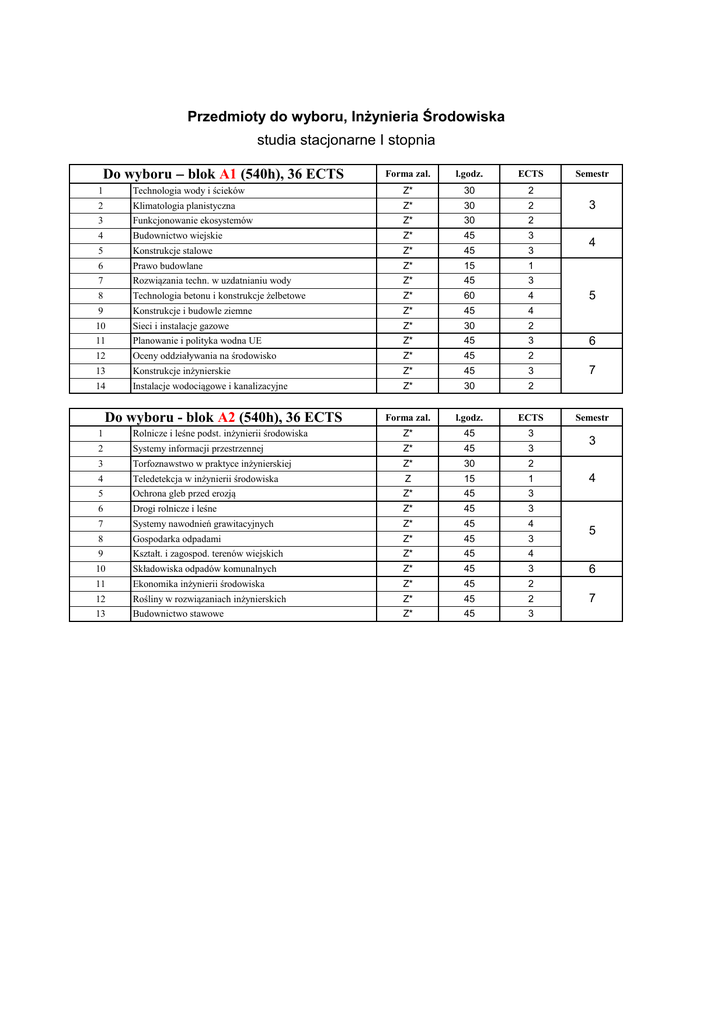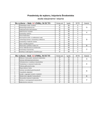 Przedmioty do wyboru, Inżynieria Środowiska studia stacjonarne I stopnia Do wyboru - blok A1 (540h), 36 ECTS Forma zal. l.godz. ECTS 1 Technologia wody i ścieków Z* 30 2 2 Klimatologia planistyczna Z* 30 2 3 Funkcjonowanie ekosystemów Z* 30 2 4 Budownictwo wiejskie Z* 45 3 5 Konstrukcje stalowe Z* 45 3 6 Prawo budowlane Z* 15 1 7 Rozwiązania techn. w uzdatnianiu wody Z* 45 3 8 Technologia betonu i konstrukcje żelbetowe Z* 60 4 9 Konstrukcje i budowle ziemne Z* 45 4 10 Sieci i instalacje gazowe Z* 30 2 11 Planowanie i polityka wodna UE Z* 45 3 12 Oceny oddziaływania na środowisko Z* 45 2 13 Konstrukcje inżynierskie Z* 45 3 14 Instalacje wodociągowe i kanalizacyjne Z* 30 2 Do wyboru - blok A2 (540h), 36 ECTS Forma zal. l.godz. ECTS 1 Rolnicze i leśne podst. inżynierii środowiska Z* 45 3 2 Systemy informacji przestrzennej Z* 45 3 3 Torfoznawstwo w praktyce inżynierskiej Z* 30 2 4 Teledetekcja w inżynierii środowiska Z 15 1 5 Ochrona gleb przed erozją Z* 45 3 6 Drogi rolnicze i leśne Z* 45 3 7 Systemy nawodnień grawitacyjnych Z* 45 4 8 Gospodarka odpadami Z* 45 3 9 Kształt. i zagospod. terenów wiejskich Z* 45 4 10 Składowiska odpadów komunalnych Z* 45 3 11 Ekonomika inżynierii środowiska Z* 45 2 12 Rośliny w rozwiązaniach inżynierskich Z* 45 2 13 Budownictwo stawowe Z* 45 3 Semestr 3 4 5 6 7 Semestr 3 4 5 6 7