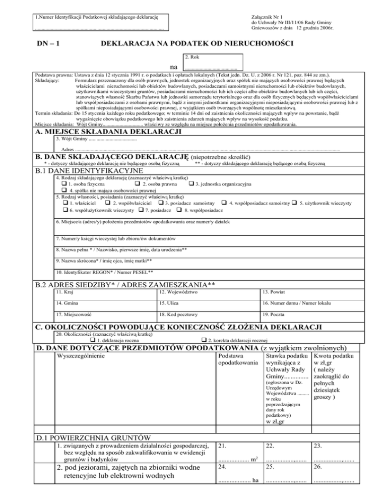 1.Numer Identyfikacji Podatkowej składającego deklarację Załącznik Nr 1 do Uchwały Nr III/11/06 Rady Gminy Gniewoszów z dnia 12 grudnia 2006r. ................................................................................................... DN – 1 DEKLARACJA NA PODATEK OD NIERUCHOMOŚCI 2. Rok na ........................................ Podstawa prawna: Ustawa z dnia 12 stycznia 1991 r. o podatkach i opłatach lokalnych (Tekst jedn. Dz. U. z 2006 r. Nr 121, poz. 844 ze zm.). Składający: Formularz przeznaczony dla osób prawnych, jednostek organizacyjnych oraz spółek nie mających osobowości prawnej będących właścicielami nieruchomości lub obiektów budowlanych, posiadaczami samoistnymi nieruchomości lub obiektów budowlanych, użytkownikami wieczystymi gruntów, posiadaczami nieruchomości lub ich części albo obiektów budowlanych lub ich części, stanowiących własność Skarbu Państwa lub jednostki samorządu terytorialnego oraz dla osób fizycznych będących współwłaścicielami lub współposiadaczami z osobami prawnymi, bądź z innymi jednostkami organizacyjnymi nieposiadającymi osobowości prawnej lub z spółkami nieposiadającymi osobowości prawnej, z wyjątkiem osób tworzących wspólnotę mieszkaniową. Termin składania: Do 15 stycznia każdego roku podatkowego; w terminie 14 dni od zaistnienia okoliczności mających wpływ na powstanie, bądź wygaśnięcie obowiązku podatkowego lub zaistnienia zdarzeń mających wpływ na wysokość podatku. Miejsce składania: Wójt Gminy............................... właściwy ze względu na miejsce położenia przedmiotów opodatkowania. A. MIEJSCE SKŁADANIA DEKLARACJI 3. Wójt Gminy ..................................... Adres ............................................................................................................................................................................................................ B. DANE SKŁADAJĄCEGO DEKLARACJĘ (niepotrzebne skreślić) * - dotyczy składającego deklarację nie będącego osobą fizyczną ** - dotyczy składającego deklarację będącego osobą fizyczną B.1 DANE IDENTYFIKACYJNE 4. Rodzaj składającego deklarację (zaznaczyć właściwą kratkę) 1. osoba fizyczna 2. osoba prawna 3. jednostka organizacyjna 4. spółka nie mająca osobowości prawnej 5. Rodzaj własności, posiadania (zaznaczyć właściwą kratkę) 1. właściciel 2. współwłaściciel 3. posiadacz samoistny 4. współposiadacz samoistny 5. użytkownik wieczysty 6. współużytkownik wieczysty 7. posiadacz 8. współposiadacz 6. Miejsce/a (adres/y) położenia przedmiotów opodatkowania oraz numer/y działek 7. Numer/y księgi wieczystej lub zbioru/ów dokumentów 8. Nazwa pełna * / Nazwisko, pierwsze imię, data urodzenia** 9. Nazwa skrócona* / imię ojca, imię matki** 10. Identyfikator REGON* / Numer PESEL** B.2 ADRES SIEDZIBY* / ADRES ZAMIESZKANIA** 11. Kraj 12. Województwo 13. Powiat 14. Gmina 15. Ulica 16. Numer domu / Numer lokalu 17. Miejscowość 18. Kod pocztowy 19. Poczta C. OKOLICZNOŚCI POWODUJĄCE KONIECZNOŚĆ ZŁOŻENIA DEKLARACJI 20. Okoliczności (zaznaczyć właściwą kratkę) 1. deklaracja roczna 2. korekta deklaracji rocznej D. DANE DOTYCZĄCE PRZEDMIOTÓW OPODATKOWANIA (z wyjątkiem zwolnionych) Wyszczególnienie Podstawa opodatkowania Stawka podatku wynikająca z Uchwały Rady Gminy............... (ogłoszona w Dz. Urzędowym Województwa ......... w roku poprzedzającym dany rok podatkowy) Kwota podatku w zł,gr ( należy zaokrąglić do pełnych dziesiątek groszy ) w zł,gr D.1 POWIERZCHNIA GRUNTÓW 1. związanych z prowadzeniem działalności gospodarczej, bez względu na sposób zakwalifikowania w ewidencji gruntów i budynków 2. pod jeziorami, zajętych na zbiorniki wodne retencyjne lub elektrowni wodnych 21. 22. 23. ................... m2 24. .................,....... 25. .................,....... 26. .................... ha .................,....... .................,....... 3. pozostałe grunty 27. 28. 29. ................... m2 .................,....... .................,....... D.2 POWIERZCHNIA UŻYTKOWA BUDYNKÓW LUB ICH CZĘŚCI (*) 1. mieszkalnych – ogółem 30. ................... m2 31. .................,....... 32. .................,....... w tym: - kondygnacji o wysokości od 1,40 do 2,20 m (zaliczyć 50% powierzchni) 33. ........................... m2 34. 35. ........................,........ ........................,........ - kondygnacji o wysokości powyżej 2,20 m ........................... m2 ........................,........ ........................,........ * Do powierzchni użytkowej budynku lub jego części należy zaliczyć powierzchnię mierzoną, po wewnętrznej długości ścian na wszystkich kondygnacjach, z wyjątkiem powierzchni klatek schodowych oraz szybów dźwigowych. Za kondygnację uważa się również garaże podziemne, piwnice, sutereny i poddasza użytkowe. 2. związanych z prowadzeniem działalności gospodarczej oraz od części budynków mieszkalnych zajętych na prowadzenie działalności gospodarczej ogółem, w tym: - kondygnacji o wysokości od 1,40 do 2,20 m (zaliczyć 50% powierzchni) - kondygnacji o wysokości powyżej 2,20 m 4. zajęte na prowadzenie działalności gospodarczej w zakresie świadczenia usług medycznych ogółem, w tym: - kondygnacji o wysokości od 1,40 do 2,20 m (zaliczyć 50% powierzchni) - kondygnacji o wysokości powyżej 2,20 m 5. pozostałych ogółem w tym: - kondygnacji o wysokości od 1,40 do 2,20 m (zaliczyć 50% powierzchni) - kondygnacji o wysokości powyżej 2,20 m D.3 BUDOWLE 1. budowle (wartość, o której mowa w przepisach o podatkach dochodowych) 37. 38. ................... m2 .................,....... .................,....... ........................... m2 ........................,........ ........................,........ 2 ........................,........ ........................,........ ........................... m 3. zajęte na prow